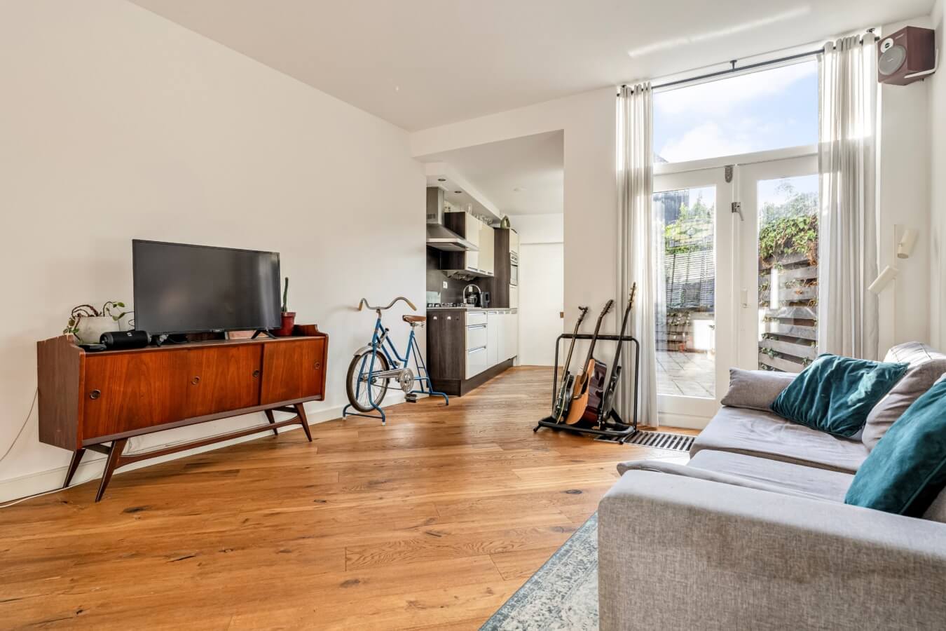 Aan de achterzijde bevindt zich het zitgedeelte, met openslaande deuren naar de tuin die binnen en buiten naadloos met elkaar verbinden.