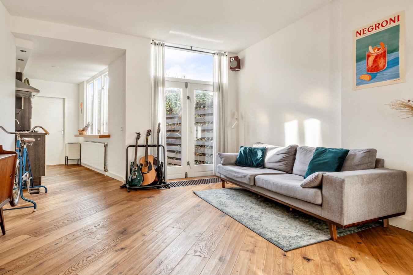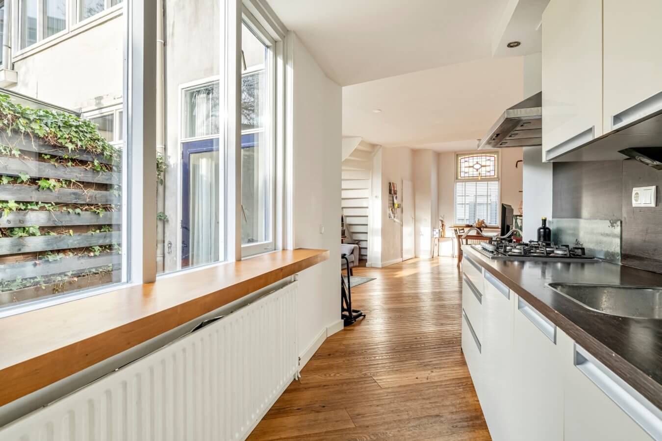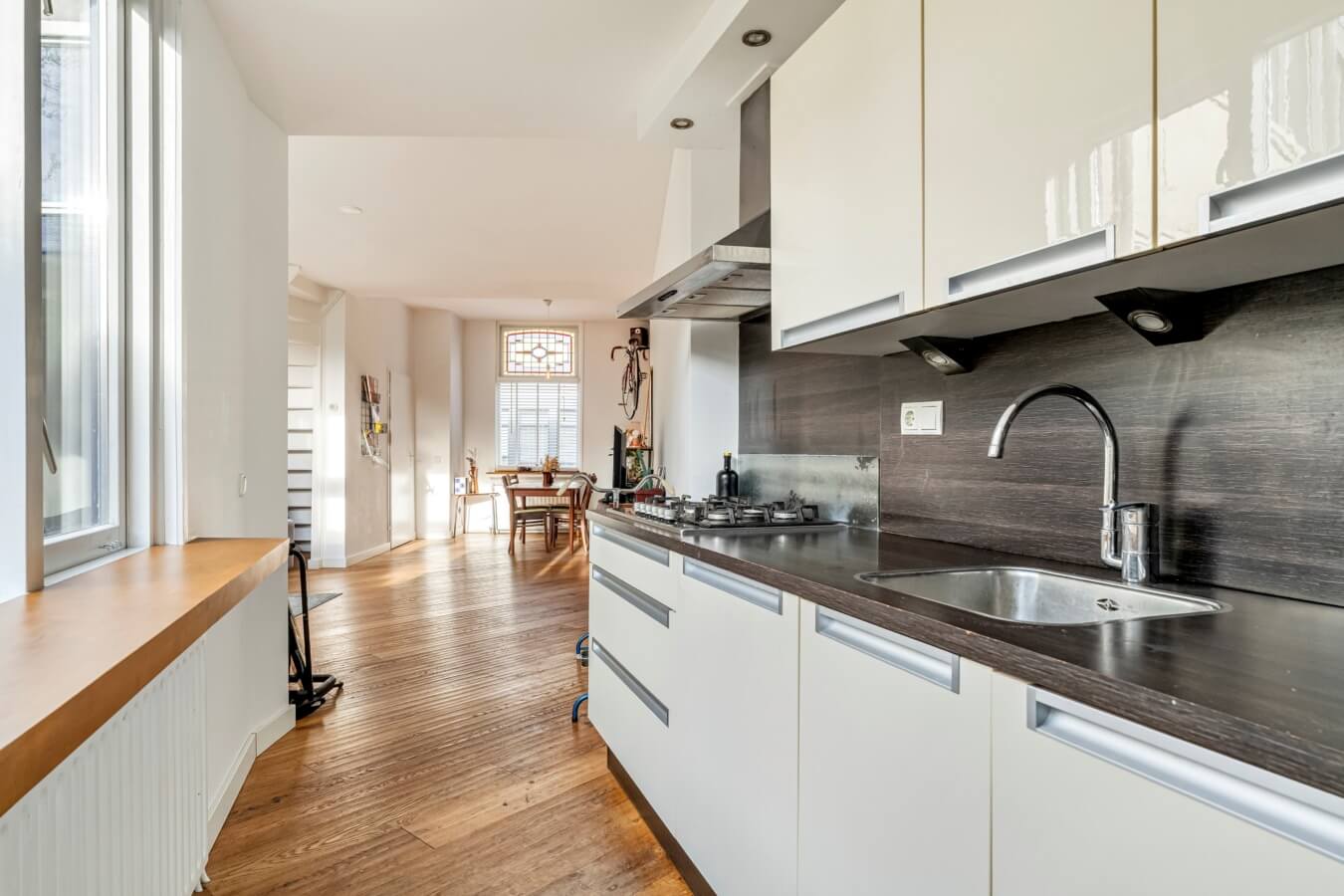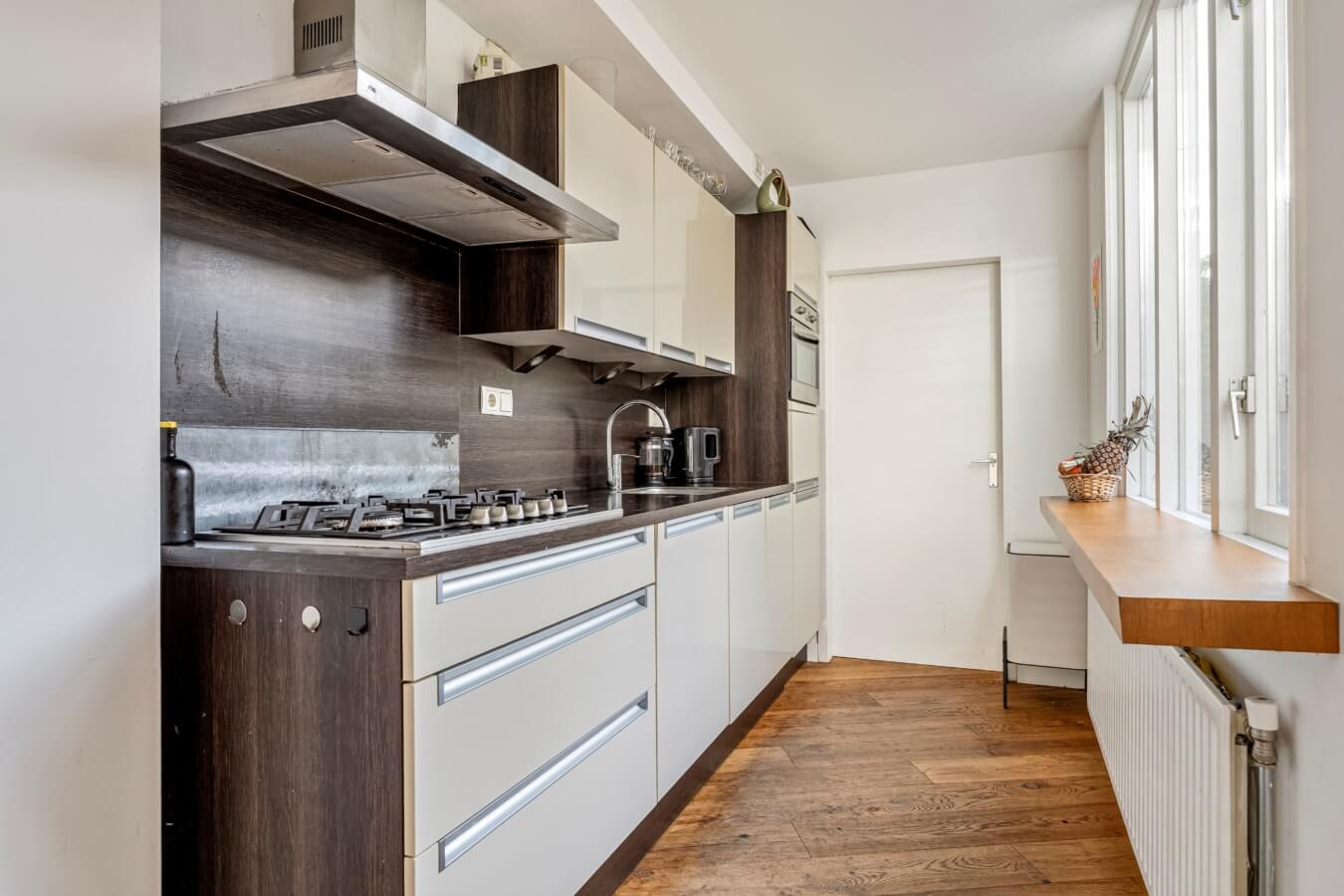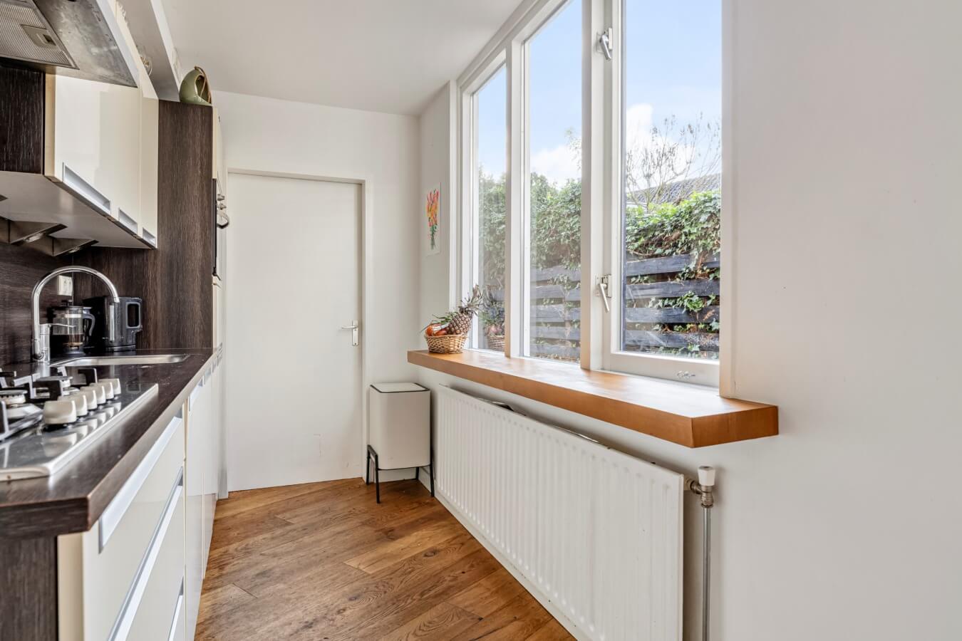 De open keuken ligt eveneens aan de achterzijde en geniet van veel daglicht. De keuken is praktisch opgesteld en voorzien van een 5-pits gaskookplaat met afzuigkap, combi-oven, koelkast en spoelbak. Aansluitend vind je de bijkeuken met wasmachine-aansluiting en toegang tot het toilet.