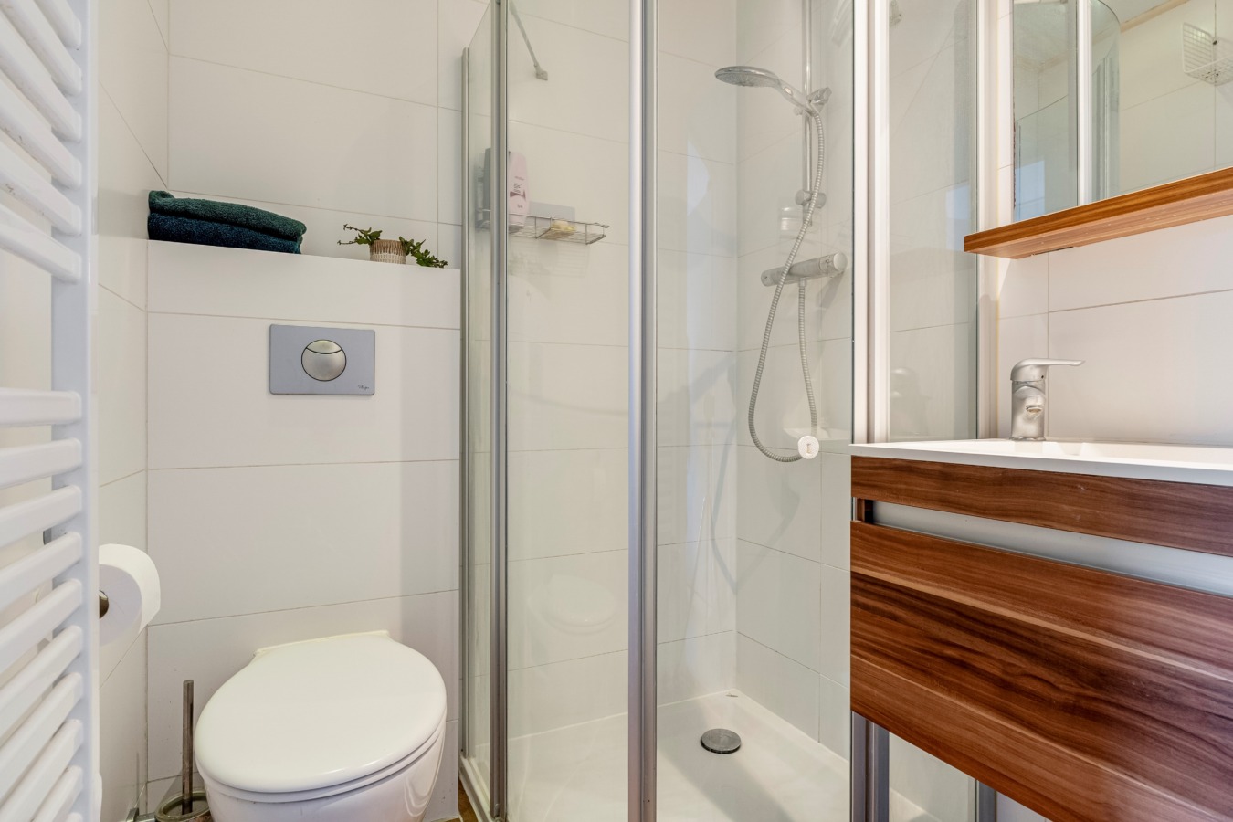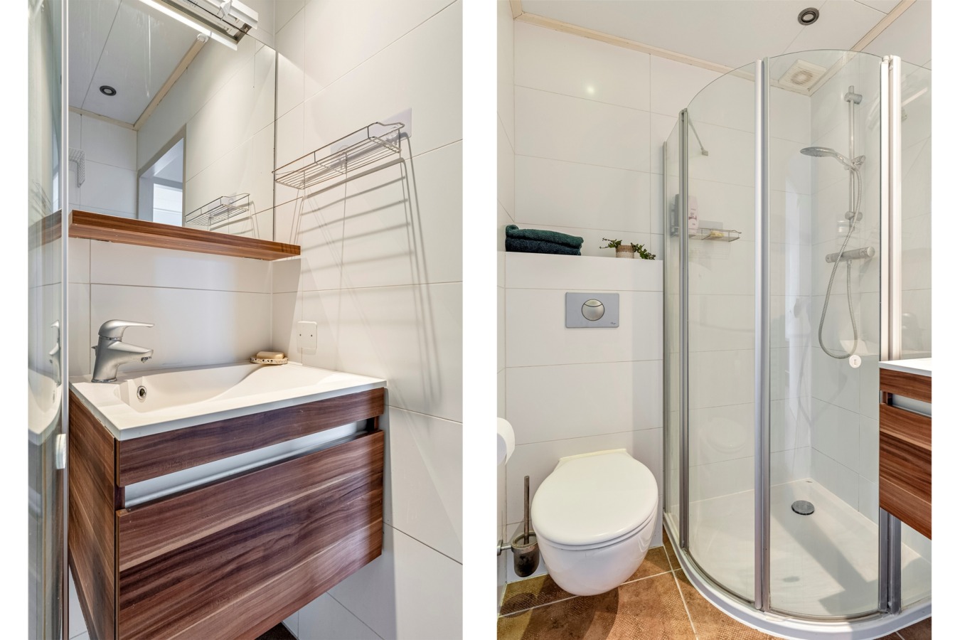 Centraal op de verdieping ligt de badkamer, volledig betegeld en uitgerust met een wastafelmeubel, douchecabine en tweede toilet.
