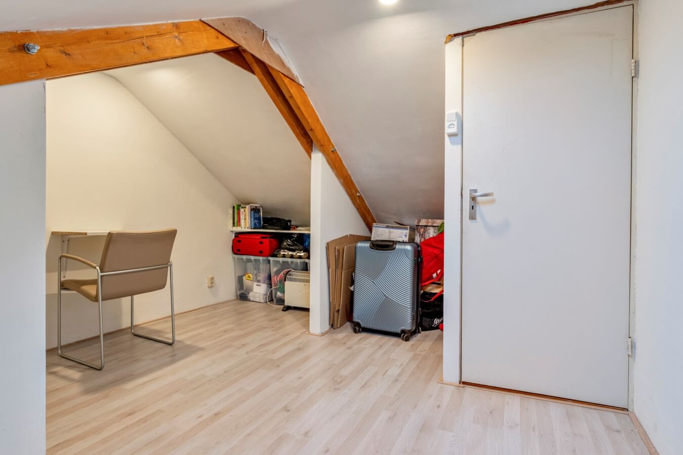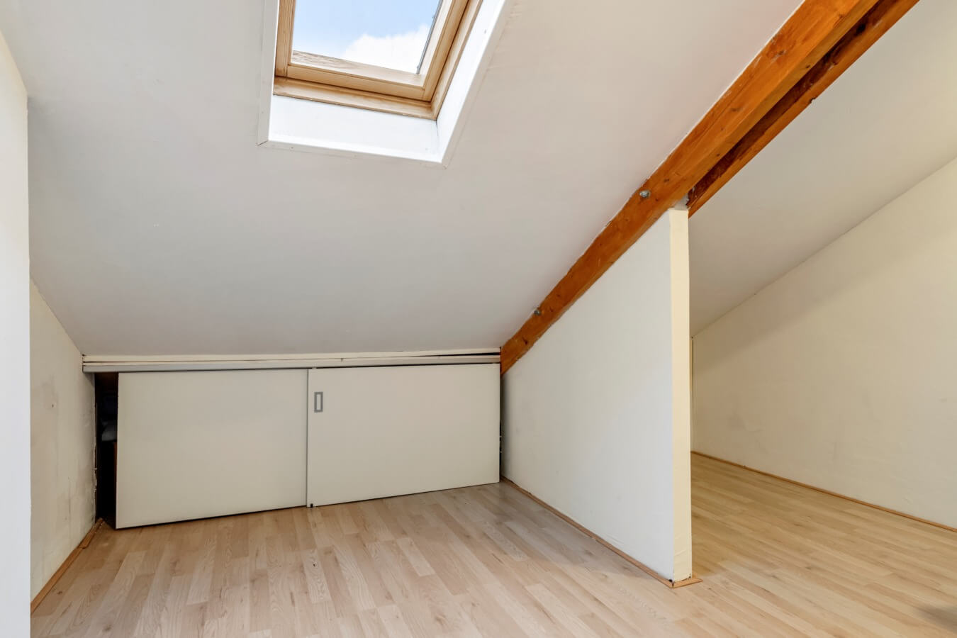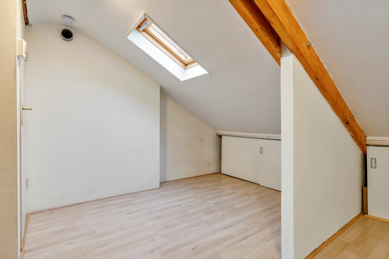 De vaste trap brengt je naar de zolder met Velux dakraam. Deze ruimte dient nu als bergruimte maar zou in de toekomst (door het plaatsen van een dakkapel) een derde slaapkamer kunnen worden. Ook hier ligt dezelfde warme laminaatvloer als op de eerste etage. Wat wil je nog meer?