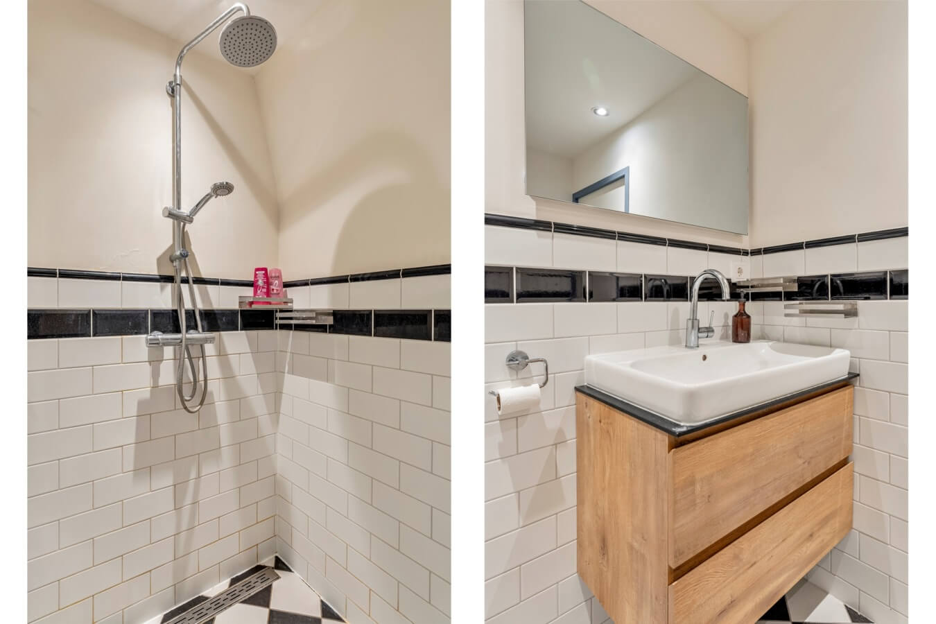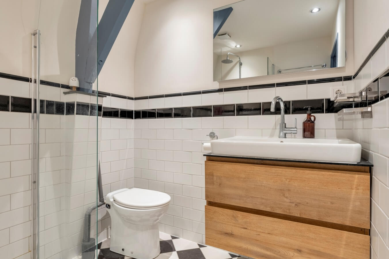 De badkamer is in 2021 gerenoveerd en neutraal afgewerkt met een ruime inloopdouche, een toilet, een breed wastafelmeubel en een spiegel met infraroodverwarming. Een fijn detail, toch?