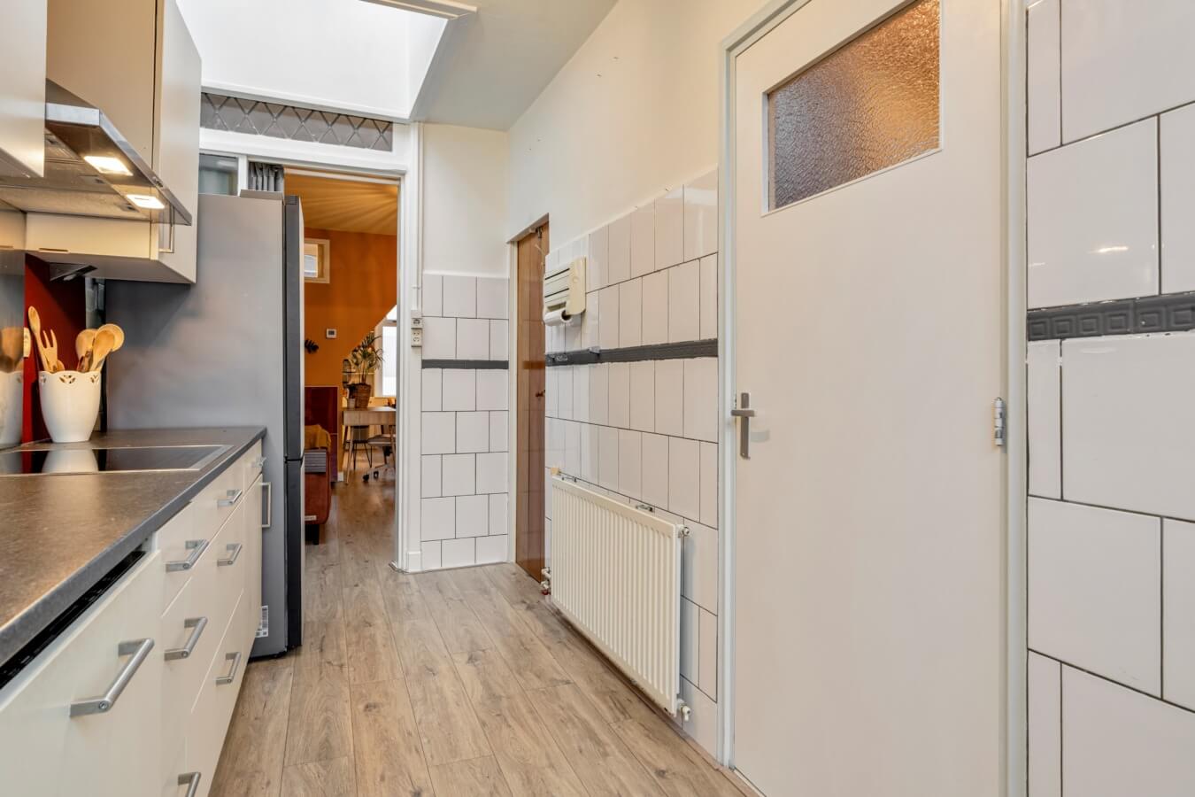 Vanuit de keuken loop je zo door naar de toiletruimte, de berging met de aansluitingen voor wasapparatuur en de bijkeuken, die weer toegang geeft tot de tuin.