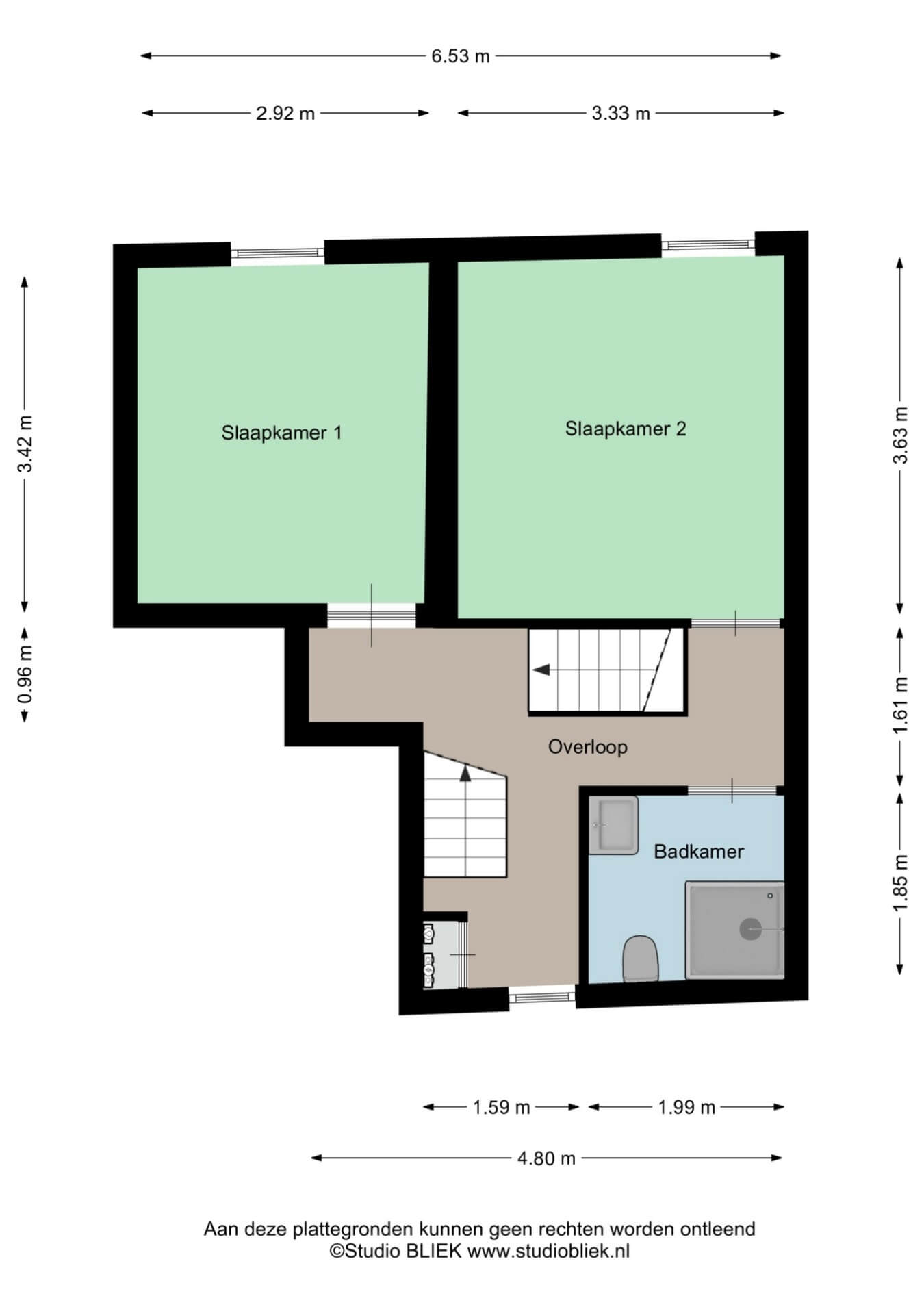 De trap in de hal brengt je naar de eerste verdieping, waar zich over de gehele breedte aan de achterzijde twee riante slaapkamers bevinden en aan de rechter voorzijde de badkamer.