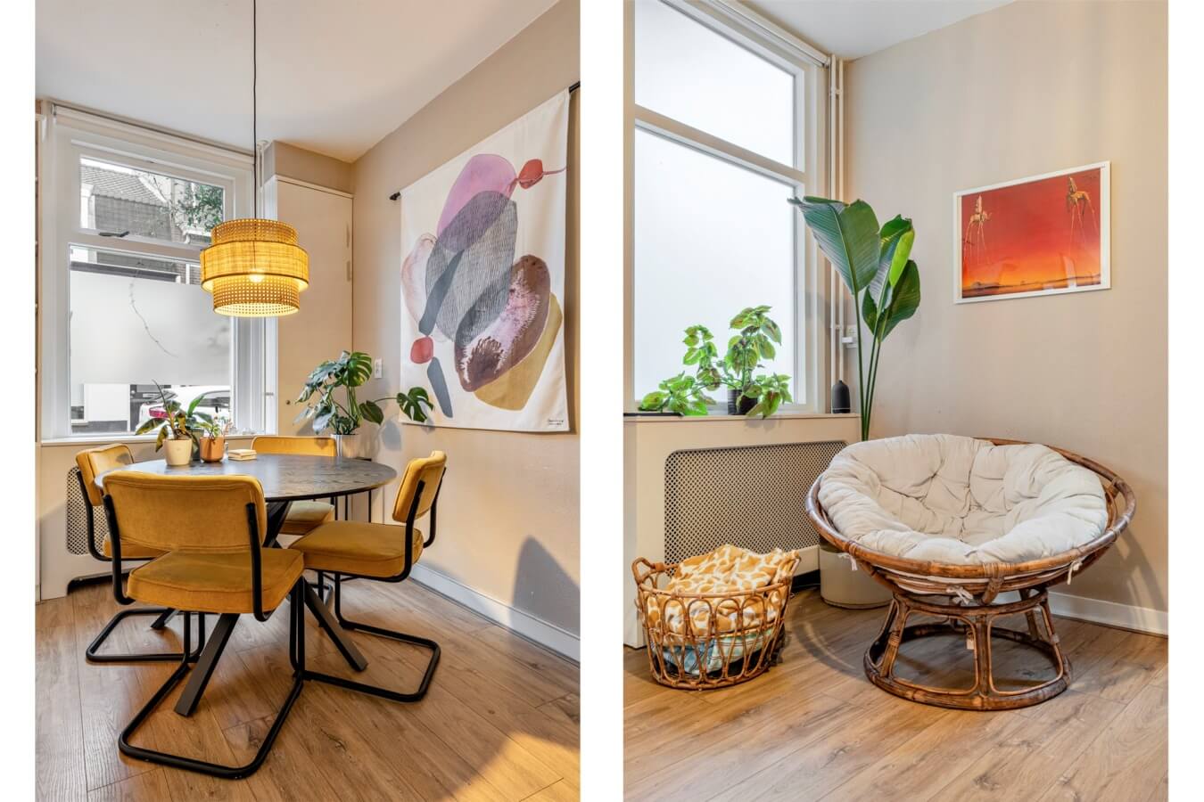 En die woonkamer? Die is aan de achterzijde uitgebouwd, waardoor de leefruimte heerlijk ruim is. Er is hier plek zat voor een grote eettafel en een royale zithoek aan weerszijden. De wanden en plafonds contrasteren mooi met de warme houtlook laminaatvloer, die naadloos doorloopt richting de keuken.