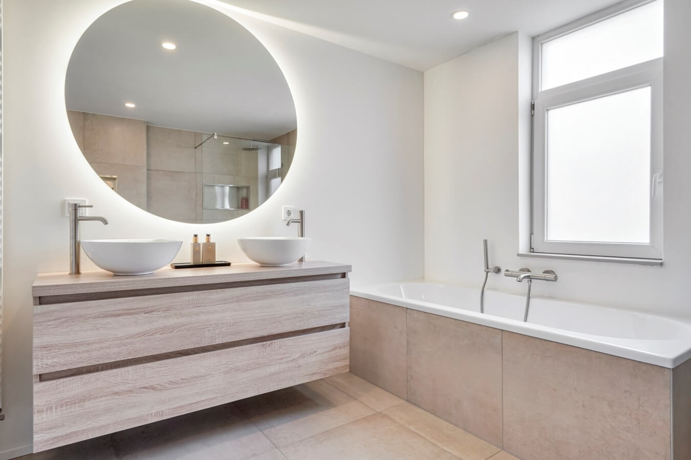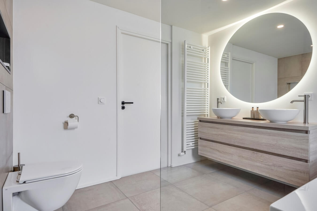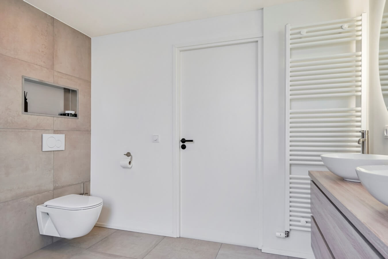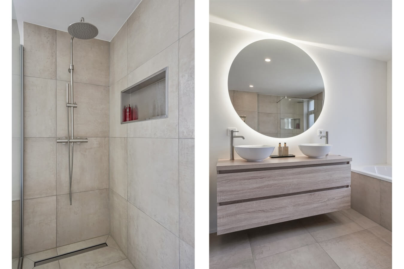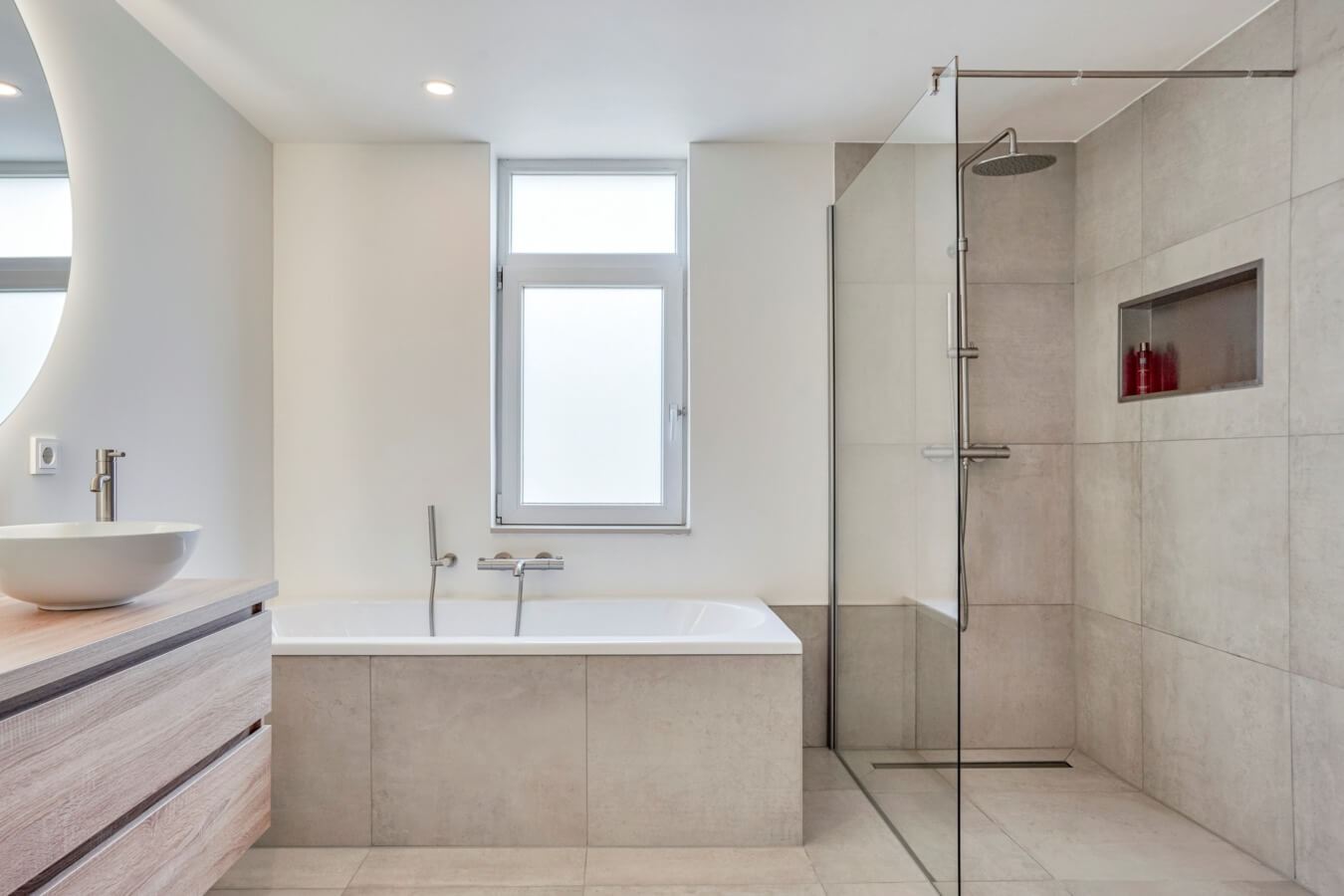 Aan de voorzijde ontdek je tevens de badkamer. Correctie: de waanzinnig luxe badkamer, die zo uit een woonblad lijkt te komen. De stijlvolle, moderne afwerkingen in neutrale kleuren zorgen hier, samen met het heerlijke ligbad, de ruime inloopregendouche en het mooie dubbele wastafelmeubel, dat je na een lange dag perfect tot rust kan komen. De ruimte is tevens uitgerust met een hangend toilet.