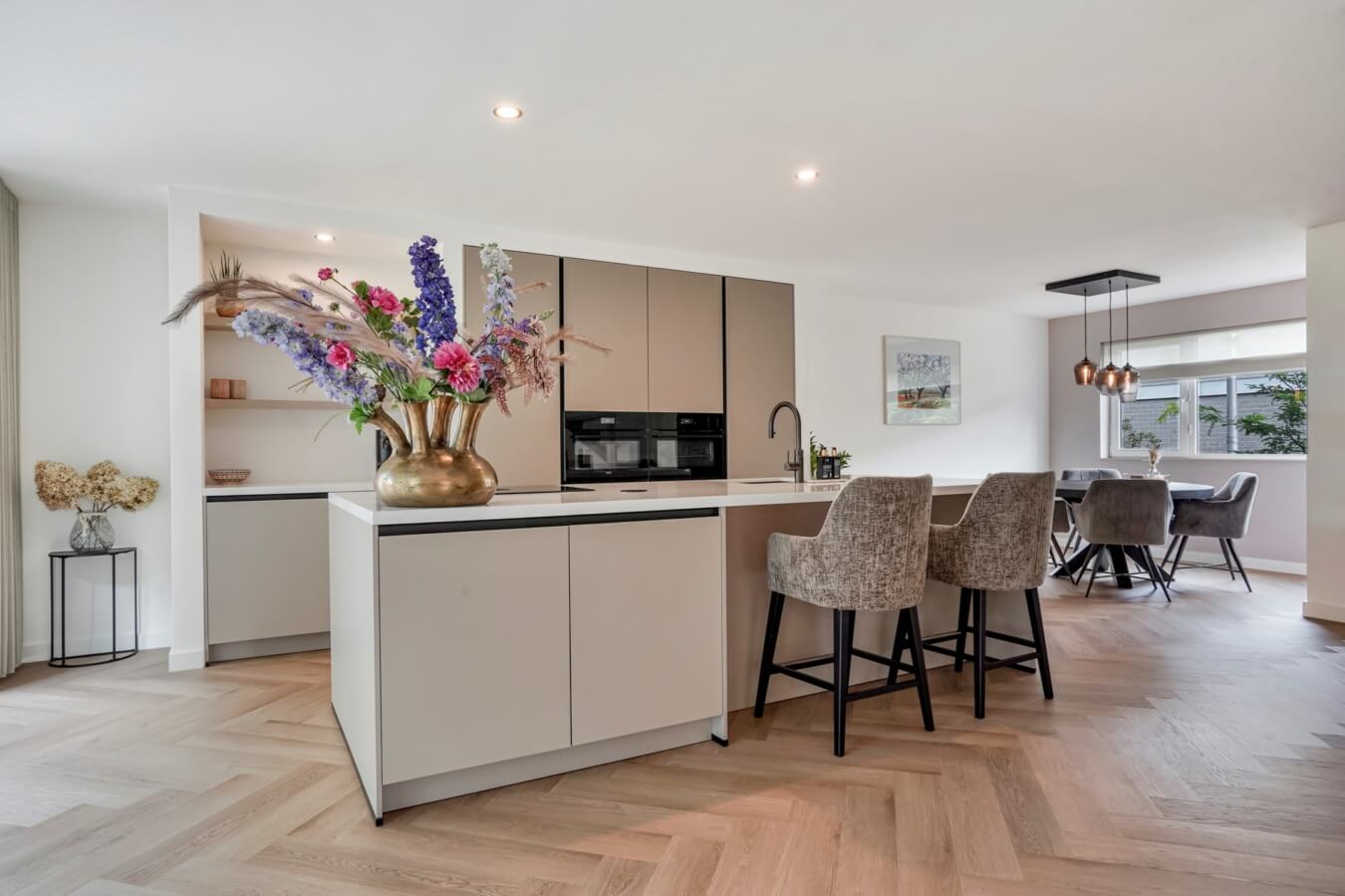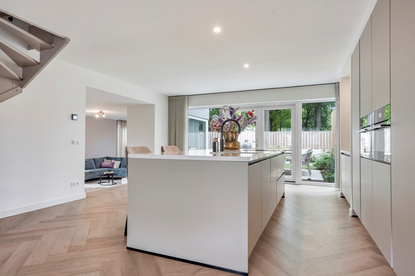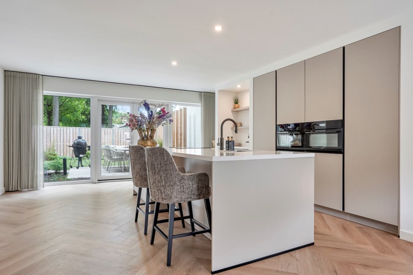 Vanuit de hal kom je terecht in het hart van het huis: de waanzinnige woonkeuken. De keuken is werkelijk een droom voor kookliefhebbers, met haar kookeiland, hypermoderne look en feel, bakken aan werk- en bergruimte en high-end apparatuur (Bora inductieplaat, Quooker, combi-/stoomoven en aparte koel- en vrieskast). Wedden dat dit een van jouw favoriete plekken in huis wordt? De openslaande tuindeuren zorgen hier voor een direct contact met de buitenruimte, een overdonderende hoeveelheid lichtinval en een super ruimtelijk gevoel alom.