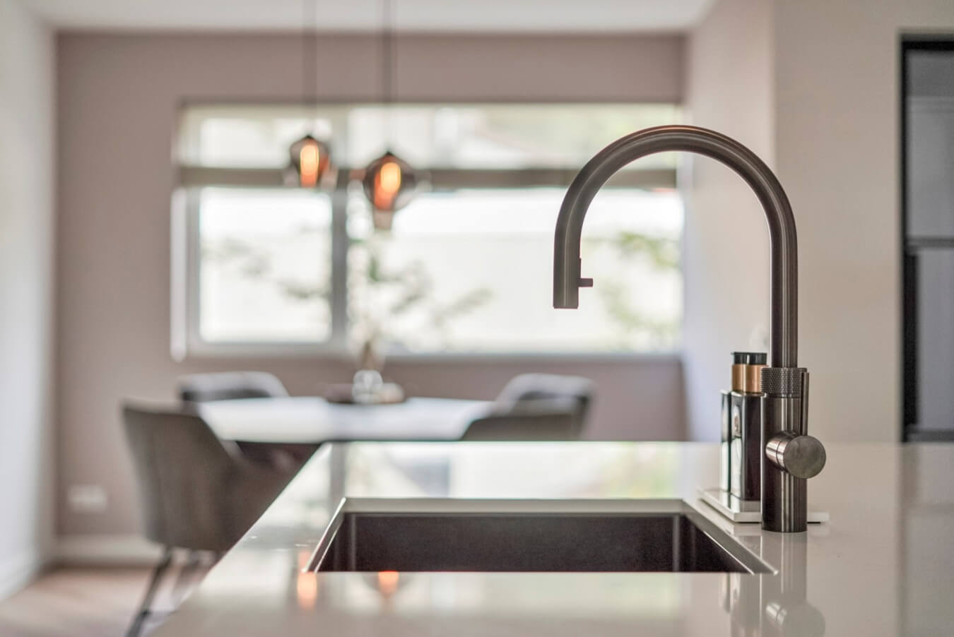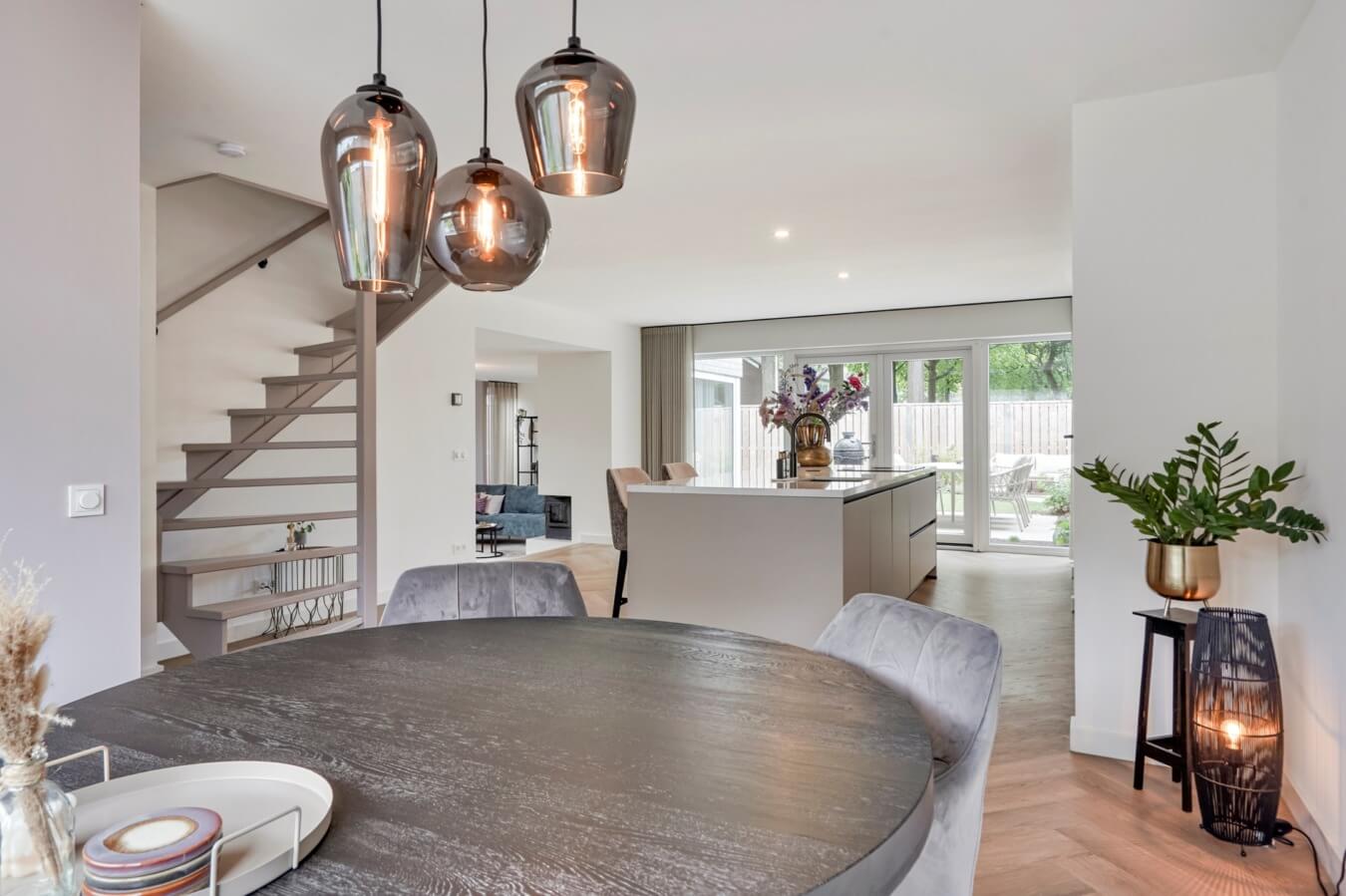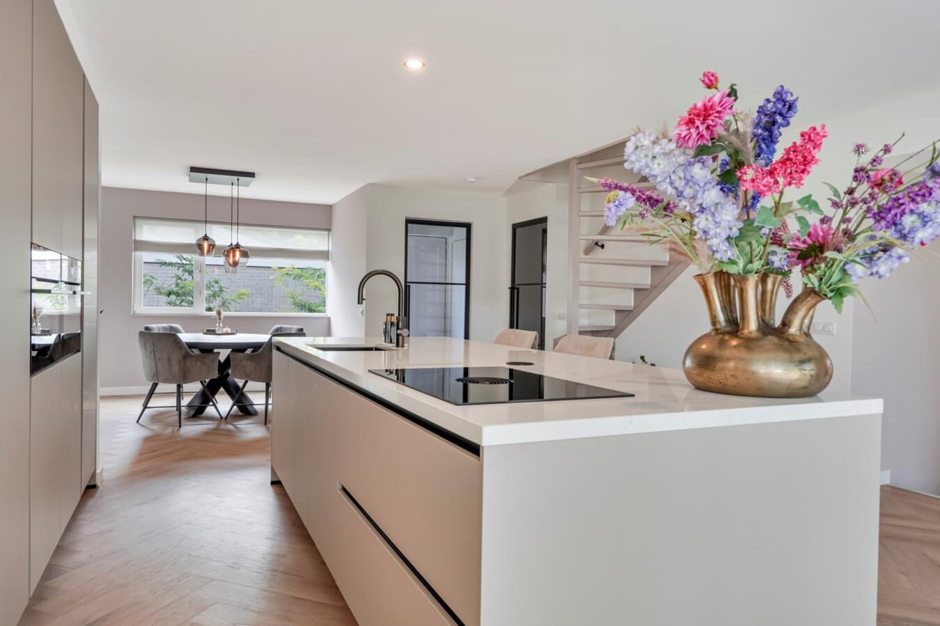 Vanuit de hal kom je terecht in het hart van het huis: de waanzinnige woonkeuken. De keuken is werkelijk een droom voor kookliefhebbers, met haar kookeiland, hypermoderne look en feel, bakken aan werk- en bergruimte en high-end apparatuur (Bora inductieplaat, Quooker, combi-/stoomoven en aparte koel- en vrieskast). Wedden dat dit een van jouw favoriete plekken in huis wordt? De openslaande tuindeuren zorgen hier voor een direct contact met de buitenruimte, een overdonderende hoeveelheid lichtinval en een super ruimtelijk gevoel alom.