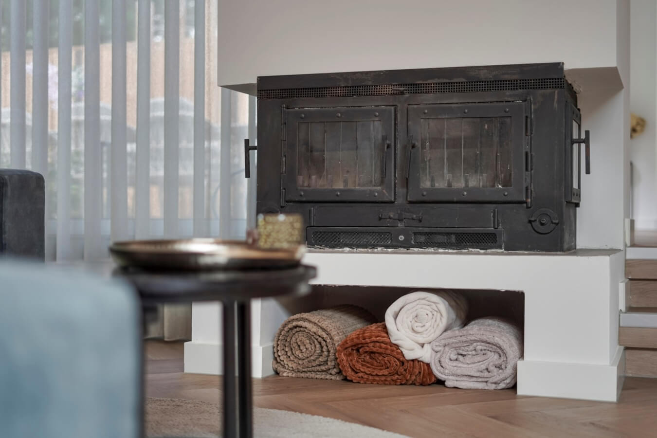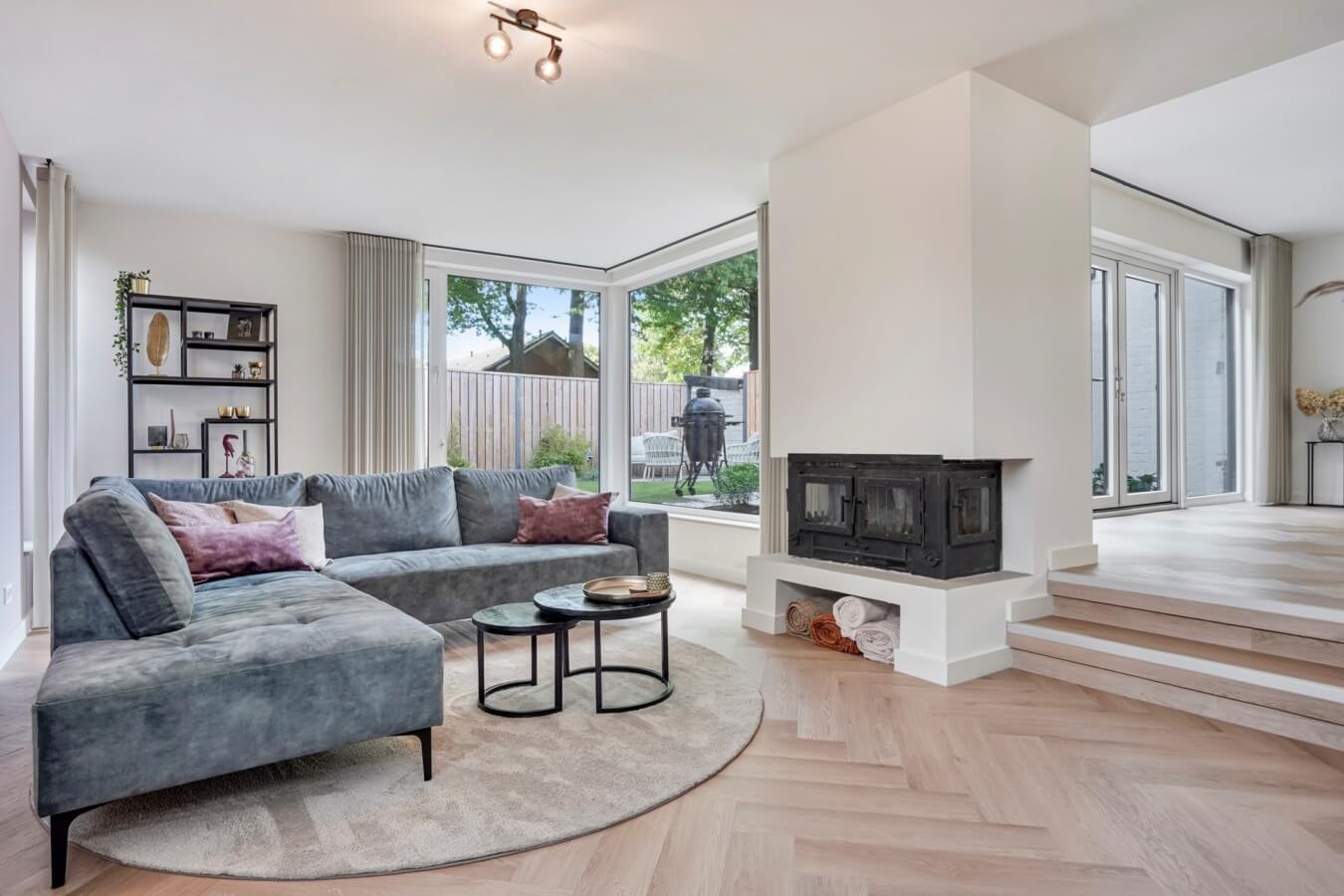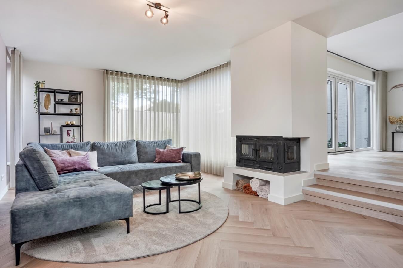 Houd dat wauw-gevoel nog maar even vast. We lopen vanuit hier namelijk twee treden naar beneden, om de prachtige zitkamer bij de grote haard te bewonderen. Ook hier is alles met oog voor detail en gevoel voor stijl benaderd. Plof lekker neer op de grote bank met een koffietje of goed glas wijn en geniet van de ontspanning die hier gegarandeerd is.
