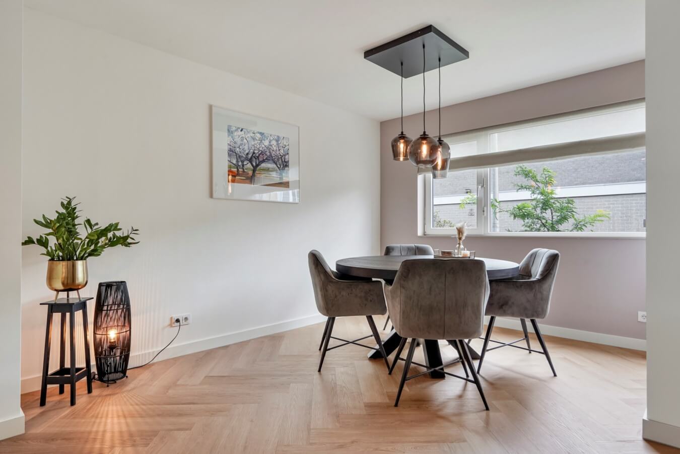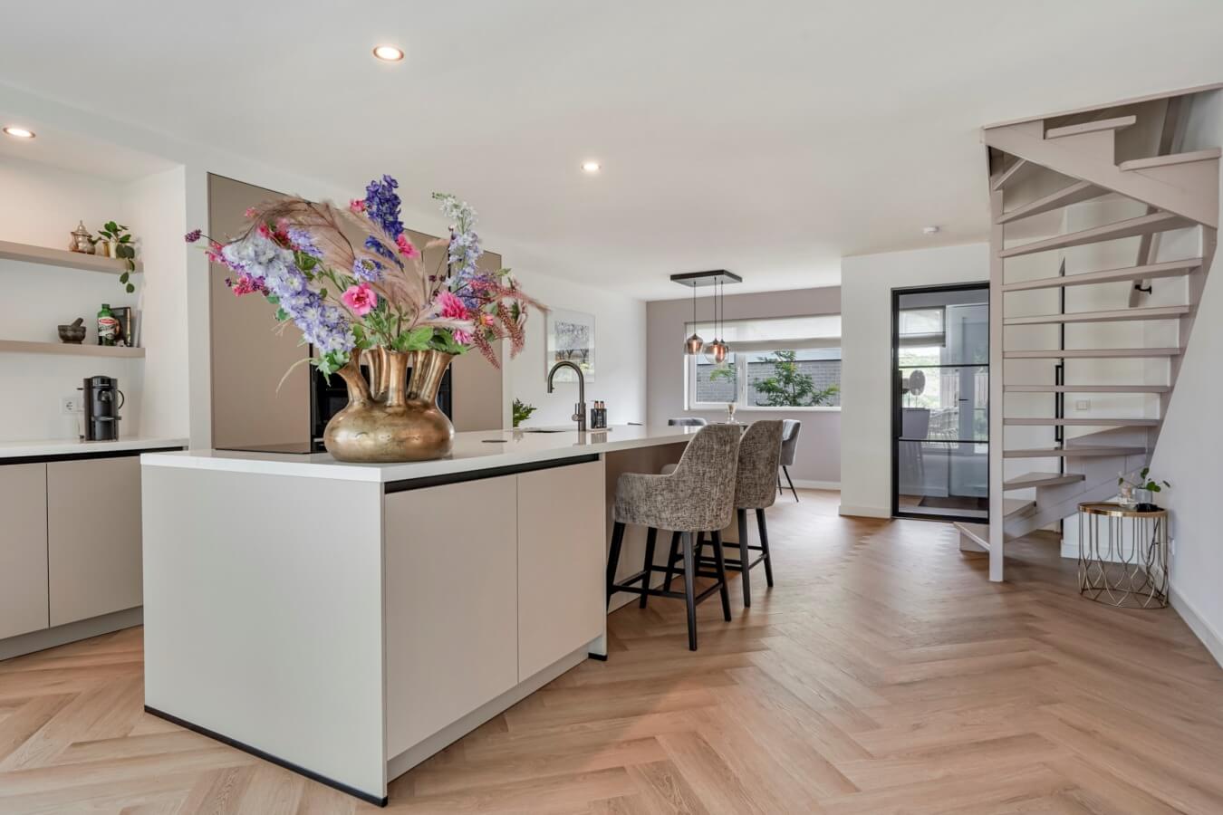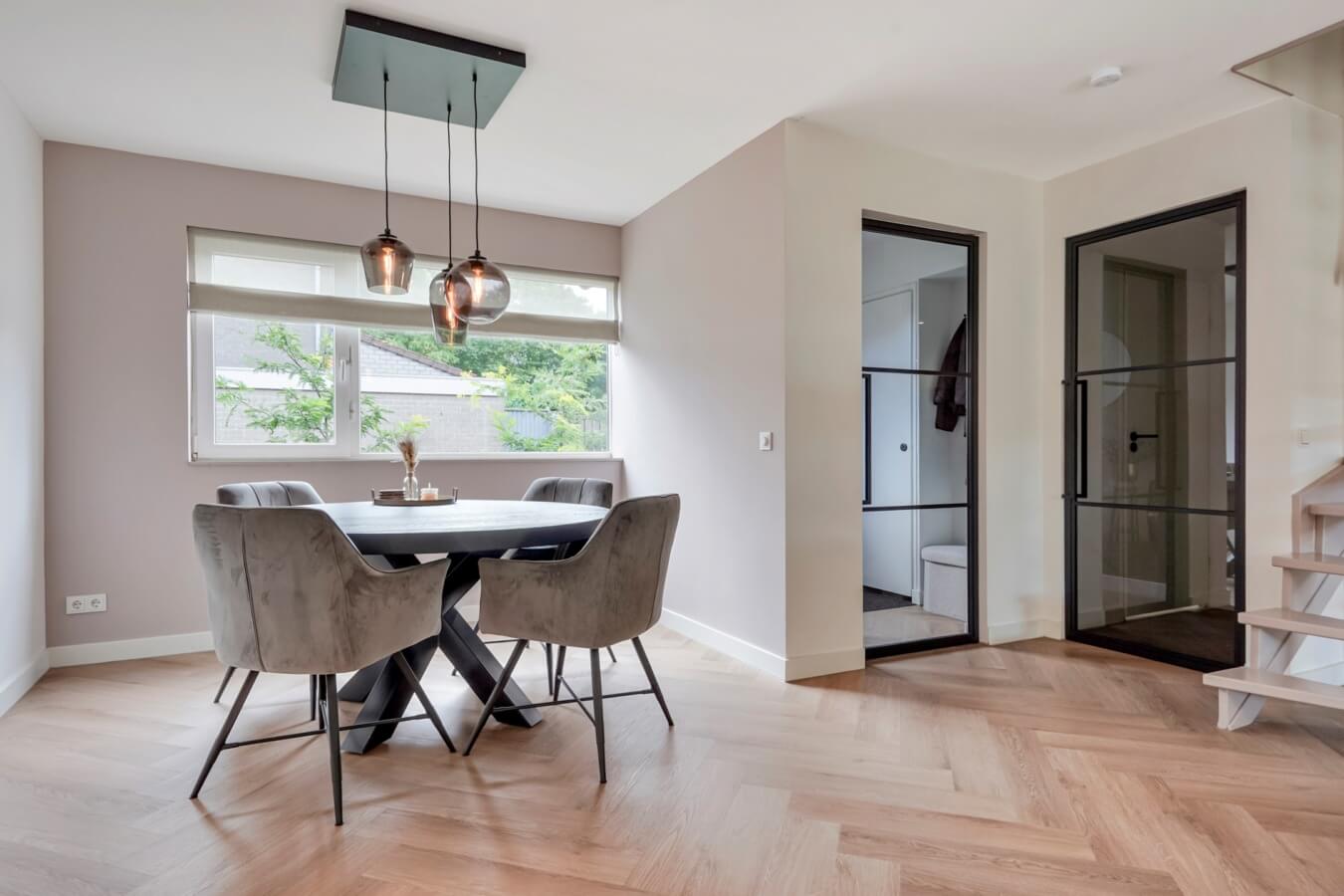 Aan de voorzijde van de leefkeuken heb je een gave plek voor een grote eettafel, waar vrienden en familie kunnen aanschuiven voor geweldige diners, die je tijdens het kokkerellen gewoon kan blijven spreken door de open setting. En dan zijn de gave details, zoals de zwarte deuren, de mooie op maat gemaakte raambekleding en de luxe visgraatvloer nog niet eens genoemd. Dit is in één woord: wauw.