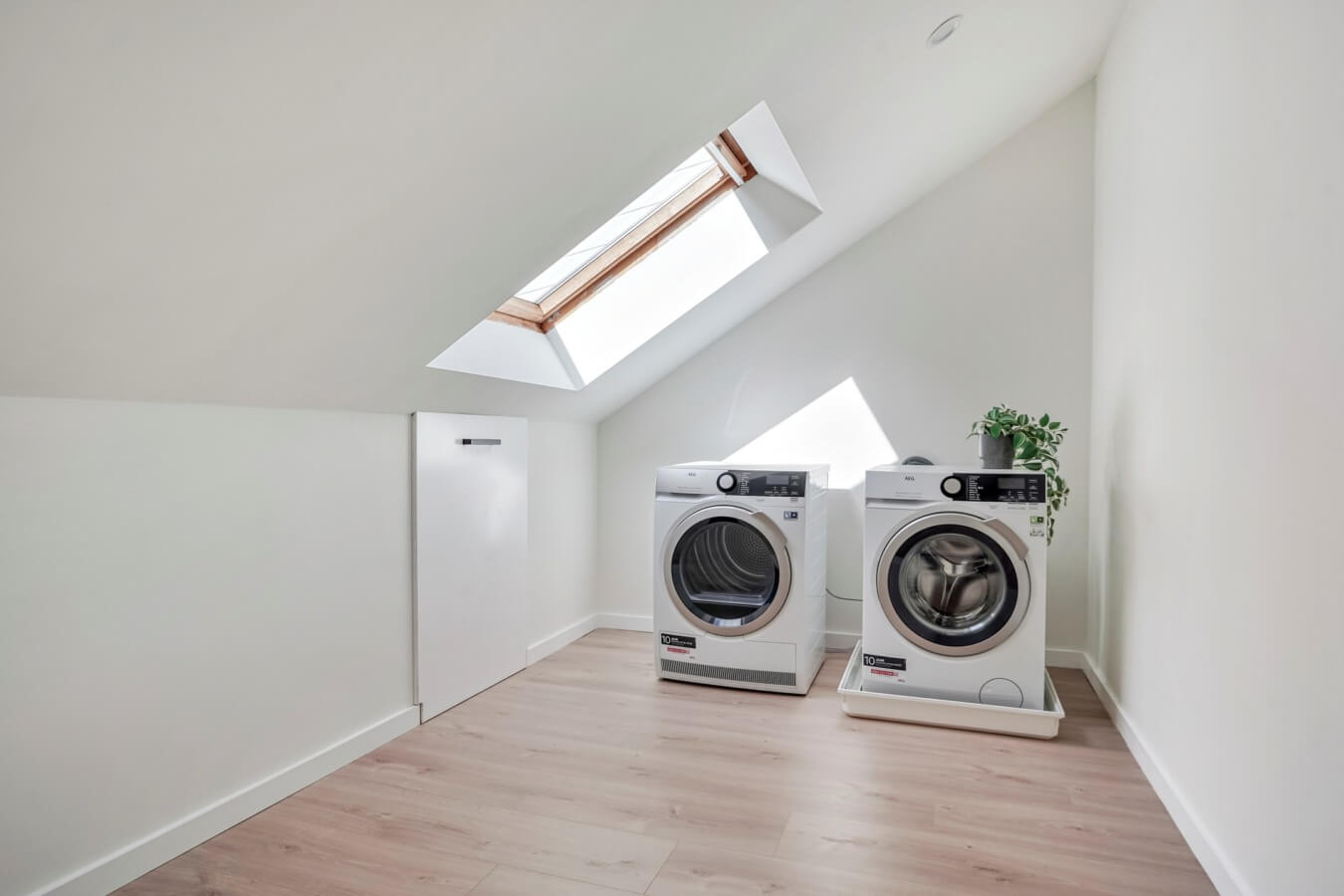 Daarnaast is er een aparte wasruimte gesitueerd, waar je de wasmachine en droger uit het zicht kan plaatsen. Hier heb je tevens toegang tot een kast met de cv-ketel, en handige bergruimte achter knieschotten. Wat wil je nog meer?