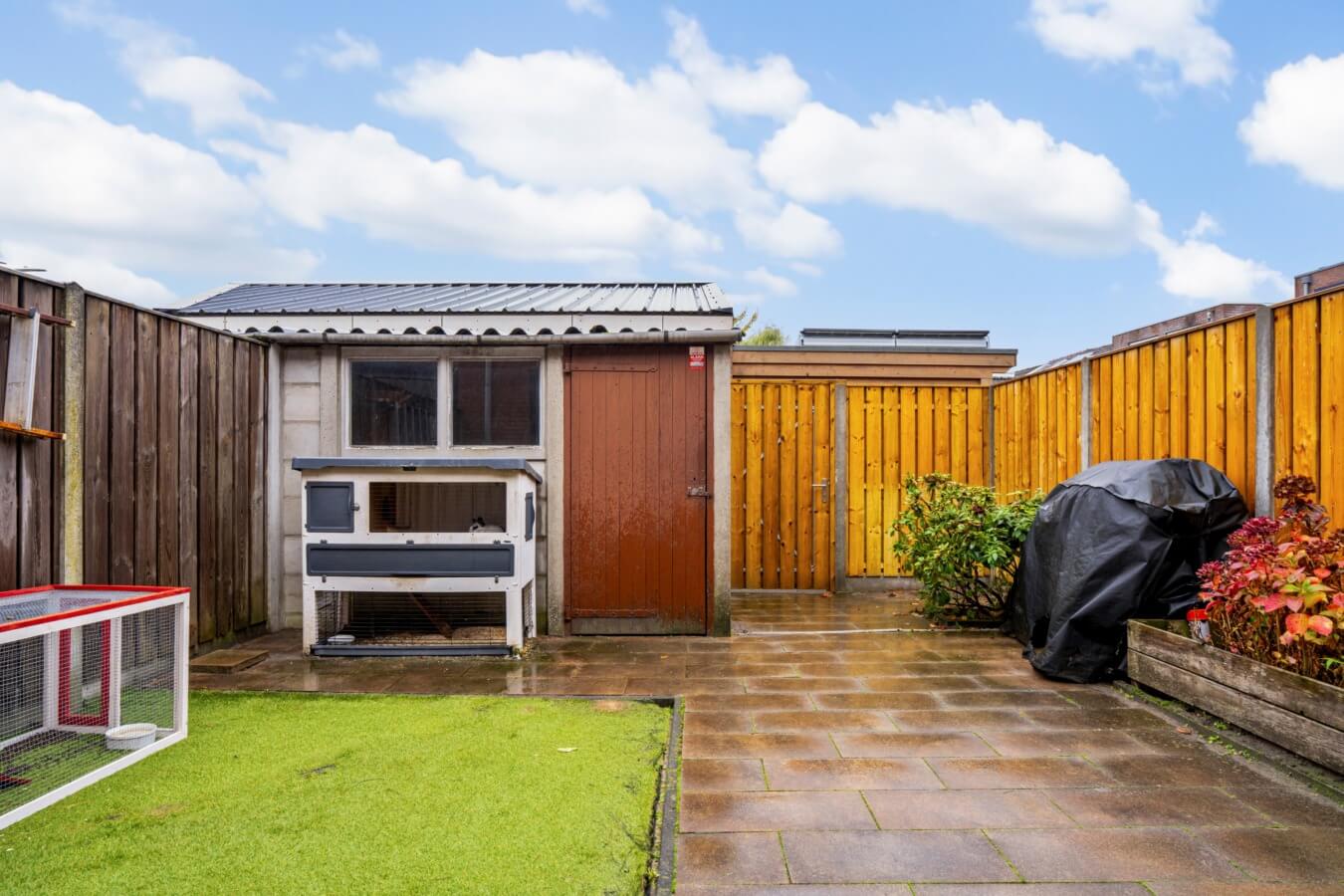 De stadstuin op het zuiden is heerlijk zonnig en onderhoudsvriendelijk met kunstgras aangelegd. Hier kun je in alle rust genieten van de vroege lentezon en de lange zomerdagen, met genoeg plek voor een loungehoek of eettafel. Achterin bevindt zich een stenen berging, perfect voor fietsen, gereedschap of extra opslag. De tuin met deels een nieuwe schutting is bereikbaar via een handige achterom.