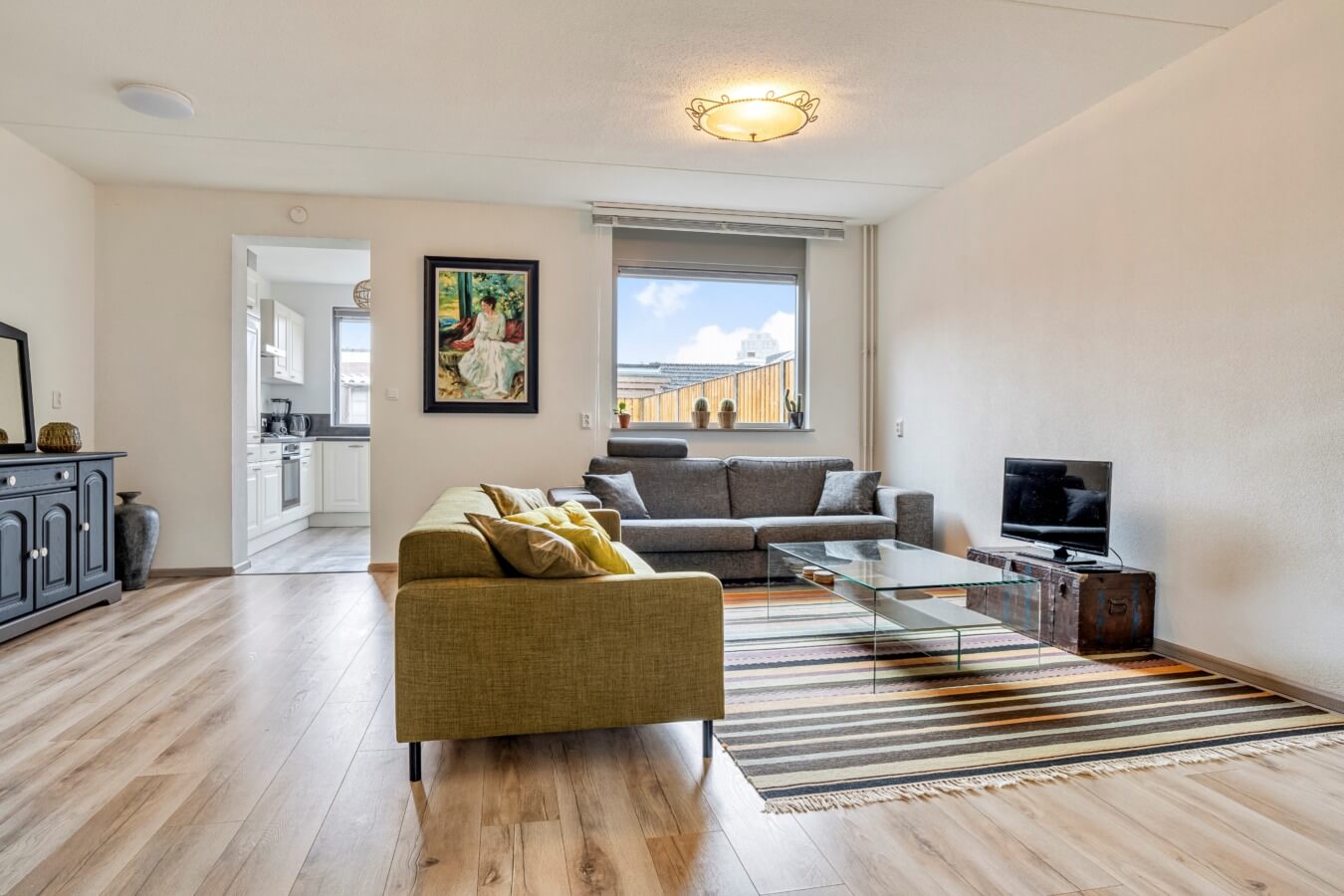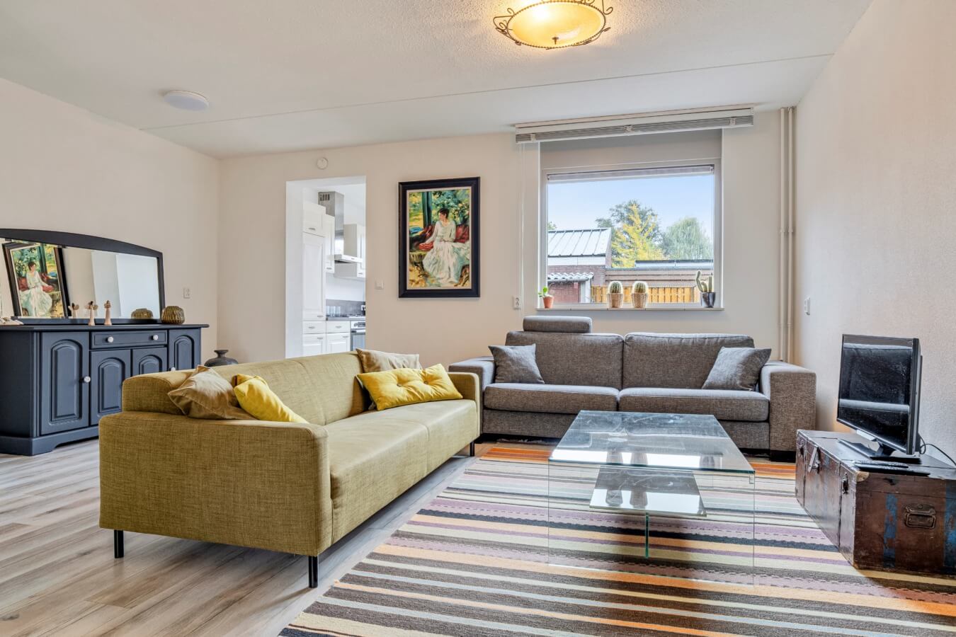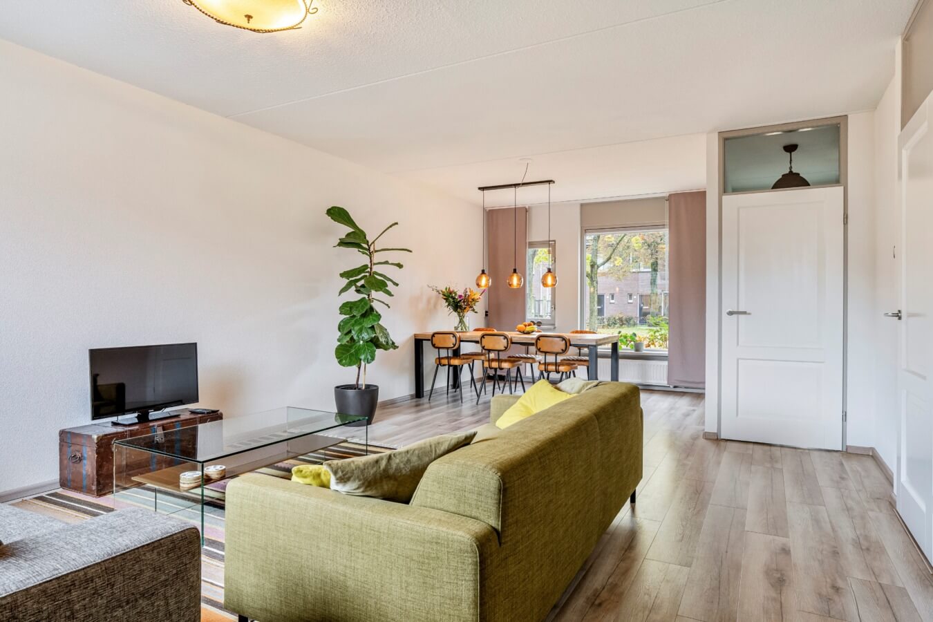 Via de hal, met toegang tot de toiletruimte met hangend closet en fonteintje, trapopgang en vernieuwde meterkast, stap je binnen in de ruime woonkamer. De living verrast direct door de royale afmetingen en het vele daglicht dat van beide kanten binnenvalt. De uitbouw aan de achterzijde zorgt voor extra leefruimte en maakt het mogelijk om eenvoudig een apart zit- en eetgedeelte te creëren. Vanuit de voorzijde van de woning kijk je aangenaam uit op het groene veldje.