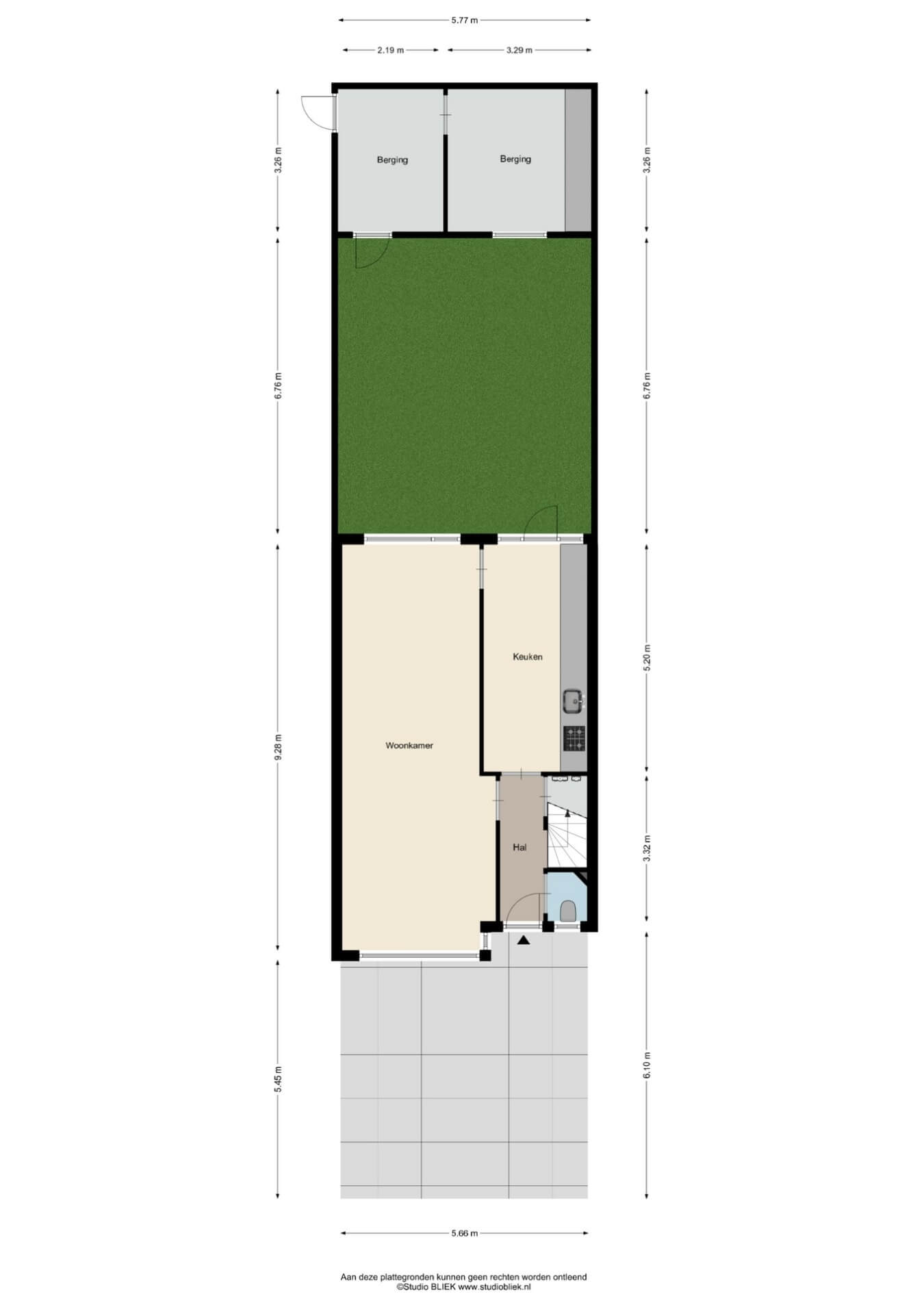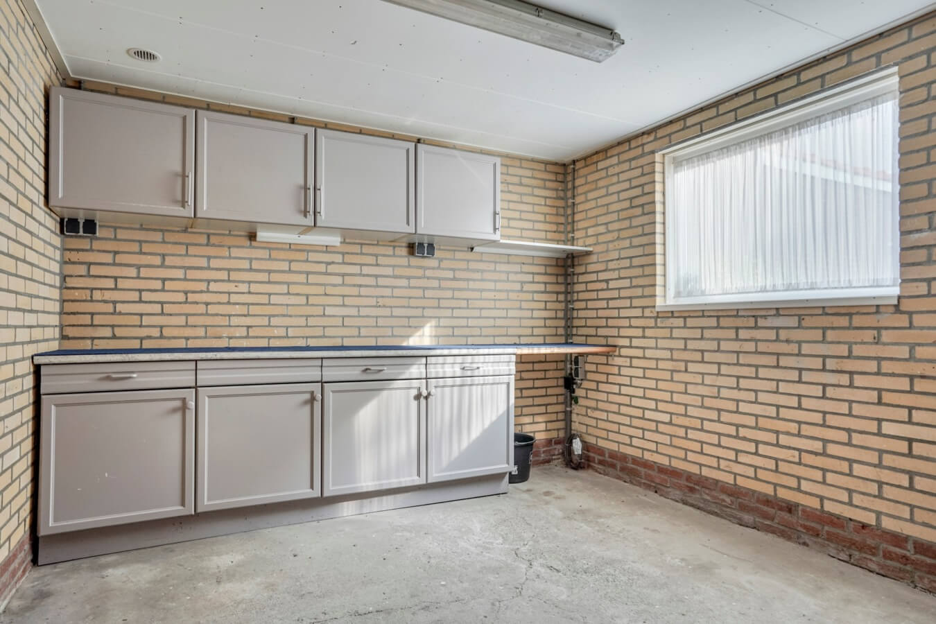 Achterin de tuin staat een royale stenen berging, die is opgedeeld in twee gedeeltes: aan de ene kant bergruimte, aan de andere kant een hobby- of werkruimte met keukenblok en raam. Ook is er een achterom.