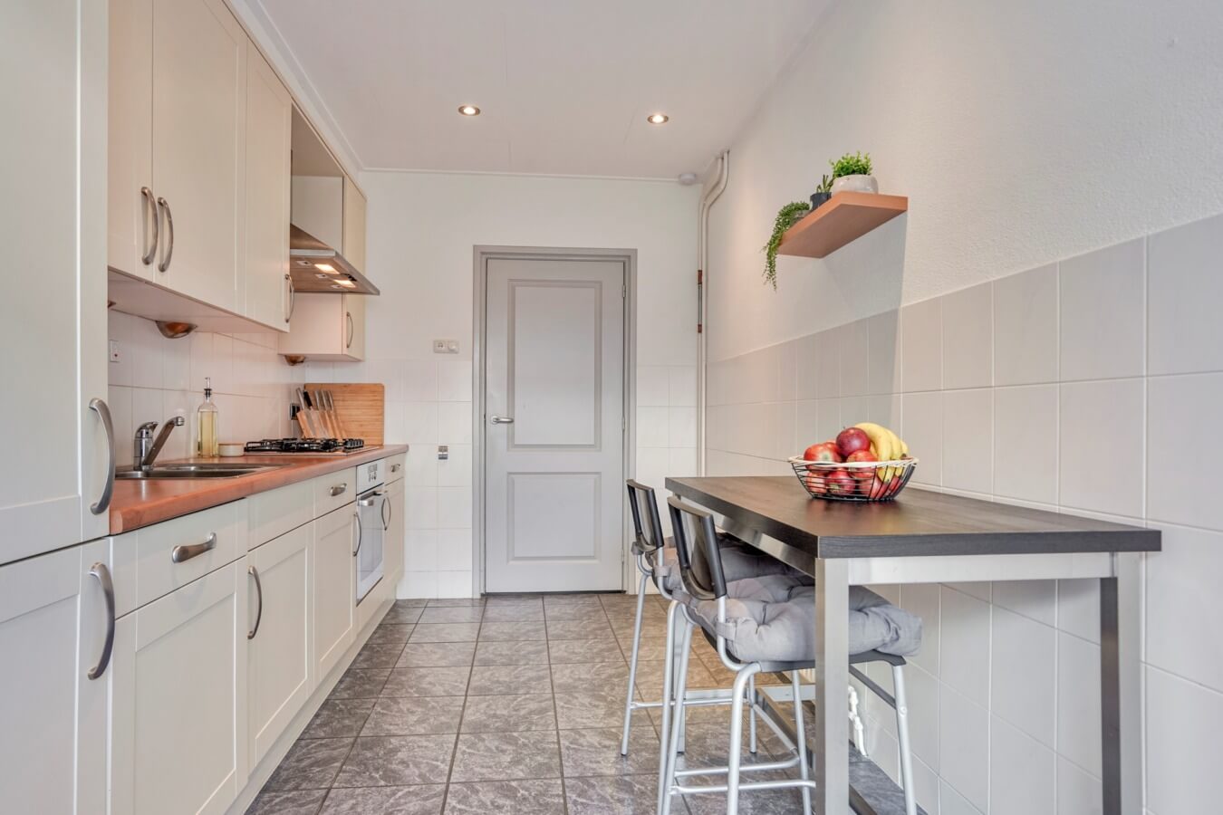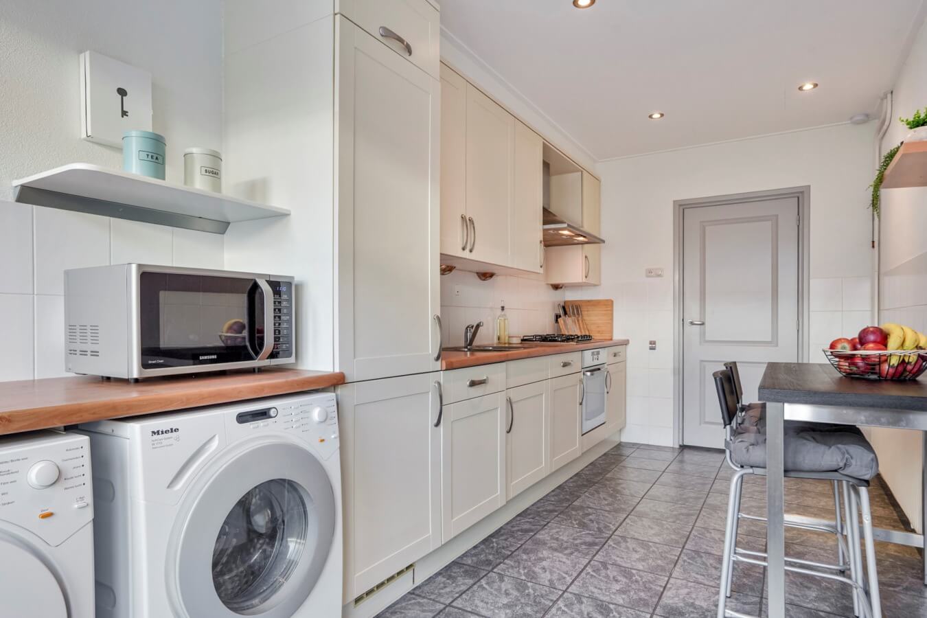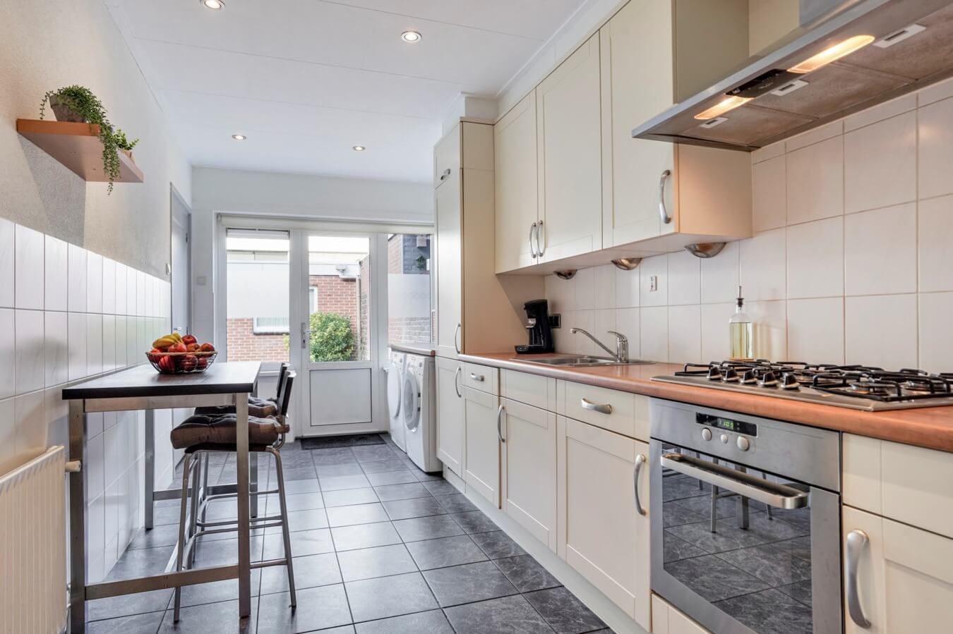 Aan de rechter achterzijde zal je de keuken ontdekken. Dit is een lange, aparte ruimte met meer dan genoeg werk- en bergruimte, een recht keukenblok en diverse inbouwapparaten zoals een oven, koelkast, vriezer, 5-pits gasfornuis, rvs-afzuigkap en een vaatwasser. Hier vind je ook de aansluitingen voor wasapparatuur en de deur naar de tuin.