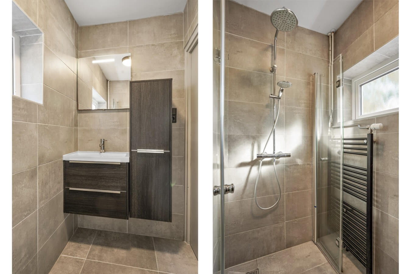 De kleine maar fijne badkamer (2017) is voorzien van een inloopdouche, een wastafelmeubel, een designradiator en een raam voor frisse lucht. Meer heb je ook niet nodig, toch?