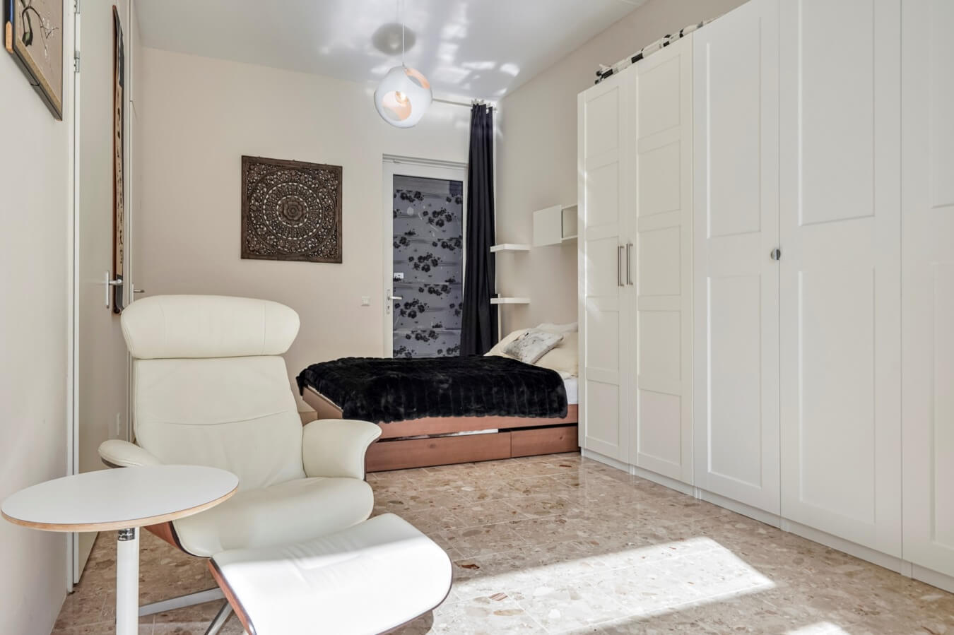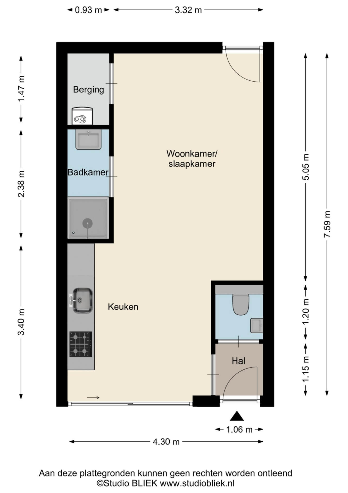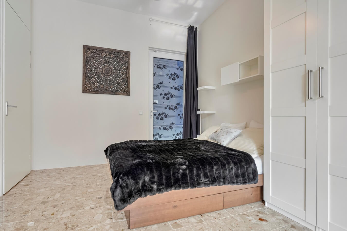 De toegang tot de woning bevindt zich aan de Kloosterstraat, je hoeft dus geen gebruik te maken van de centrale toegangspoort van het complex. Je komt de studio binnen in de hal. Hier bevindt zich de toiletruimte. Deze is afgewerkt in een combinatie van grote witte en antraciet tegels. De ruimte is uitgerust met een wandcloset en een fonteintje. Je kunt ook gebruikmaken van de achterdeur om de woning te betreden, als dat je voorkeur heeft.