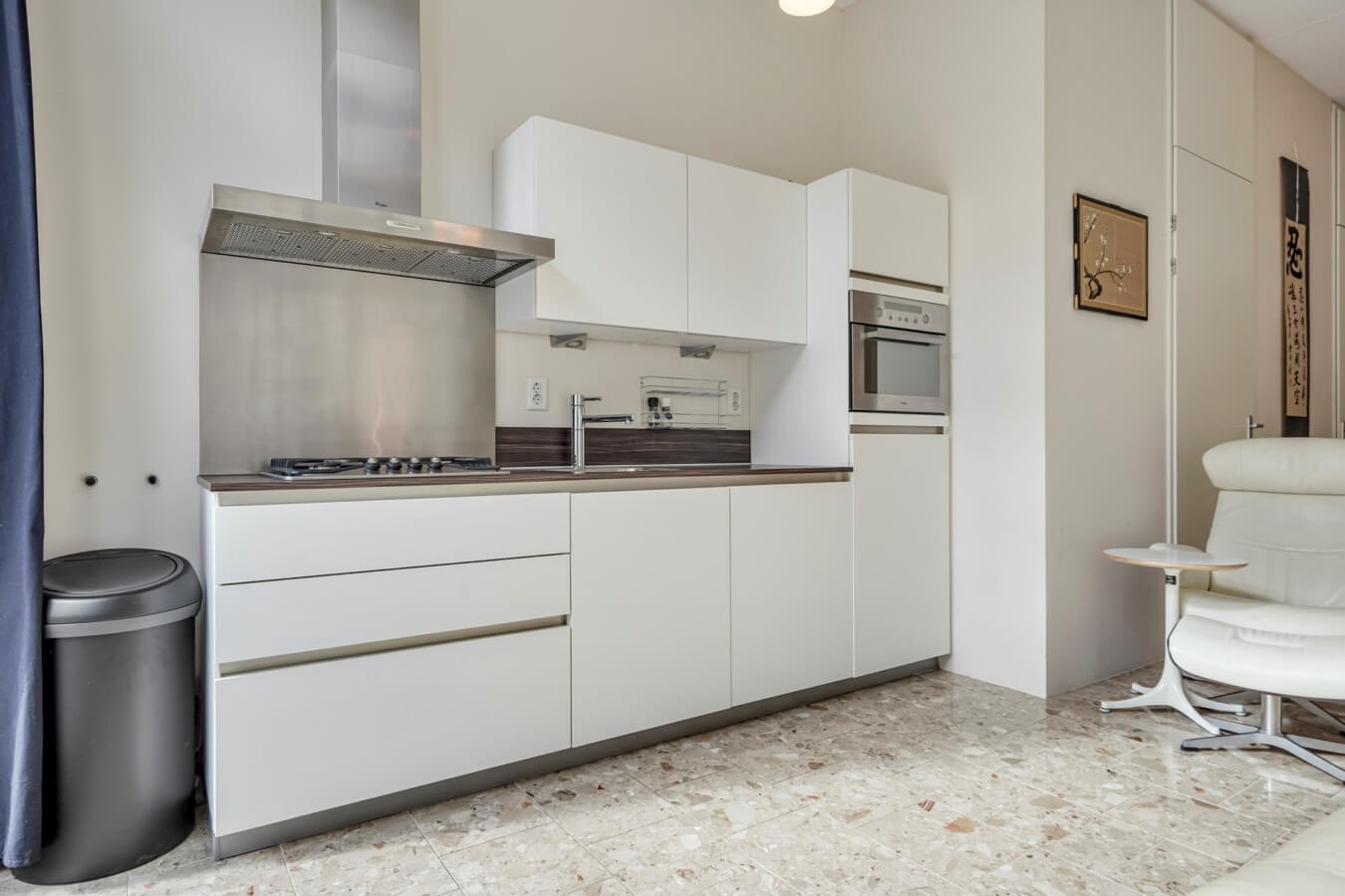 De open keuken is aan de voorzijde gesitueerd. De rechte opstelling is zeer compleet uitgevoerd en voorzien van een vaatwasser, combi-oven, gaskookplaat met vier pitten, brede rvs-afzuigkap en een koelkast met vriesvak. De fronten zijn wit van kleur, wat fraai combineert met het wenge kleurige werkblad en de vloer. Aan de voorzijde biedt een grote raampartij/schuifpui uitzicht op de stadse woonomgeving.