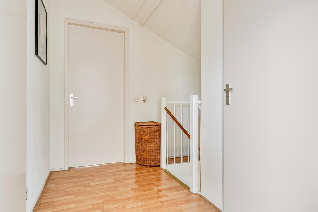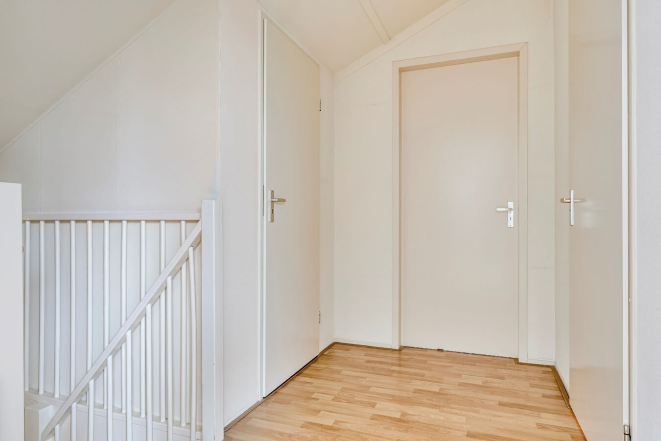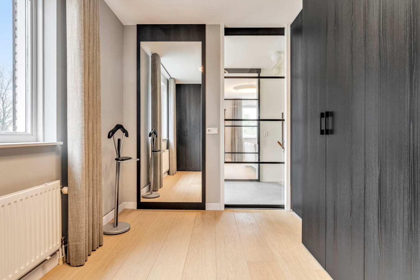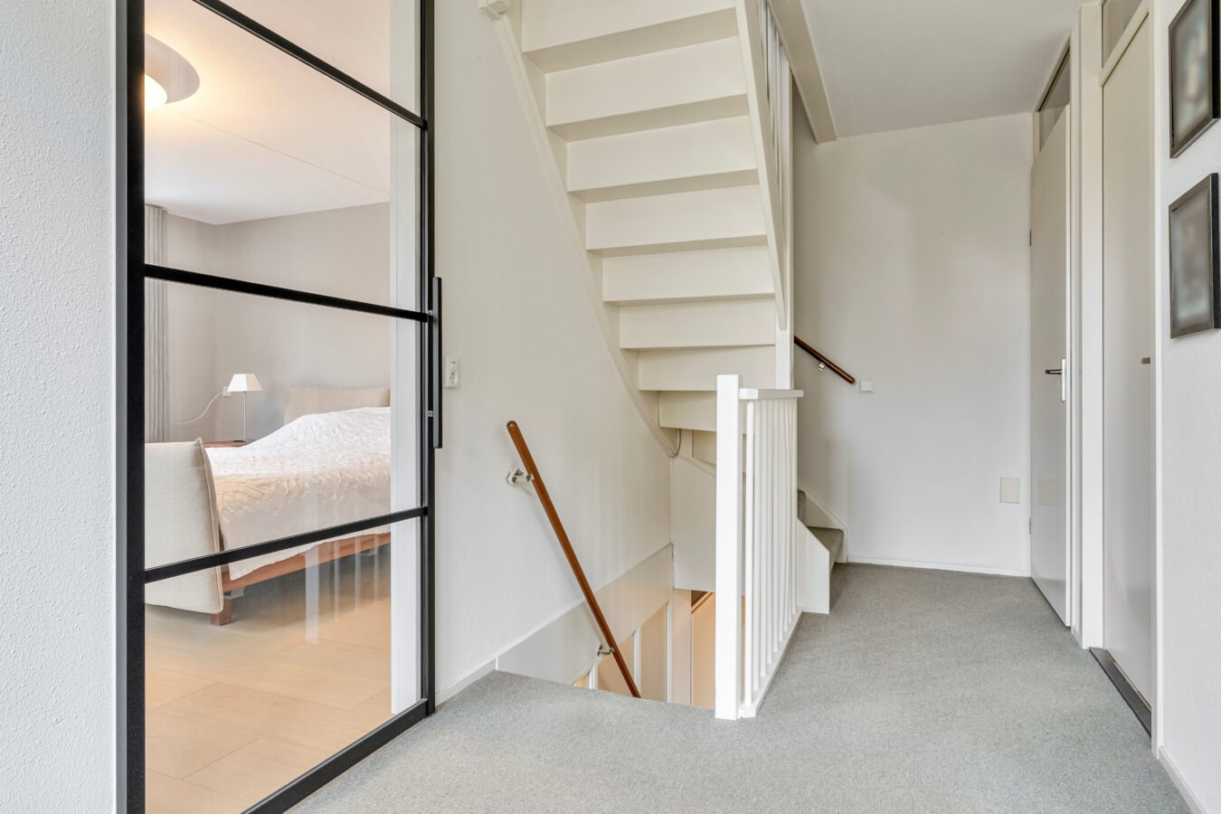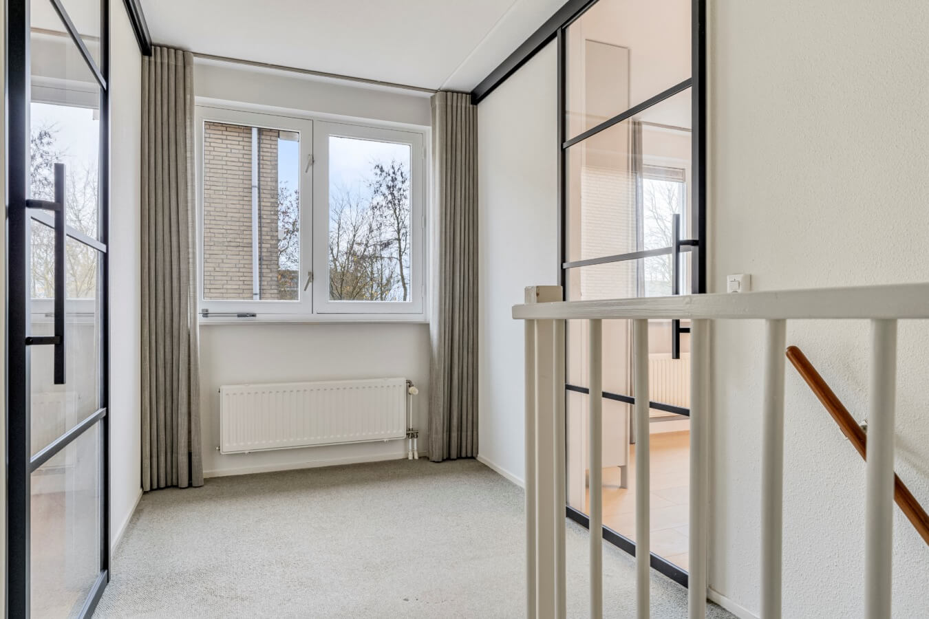 Via de trap in de hal kom je op de brede overloop van de eerste verdieping terecht. Hier heb je toegang tot twee slaapkamers, de eerste badkamer, een separate toiletruimte en de trap naar de zolderverdieping. De strakke zwarte deuren naar de kamers geven de verdieping een moderne uitstraling. Extra fijn: de volledige etage beschikt over elektrische rolluiken.