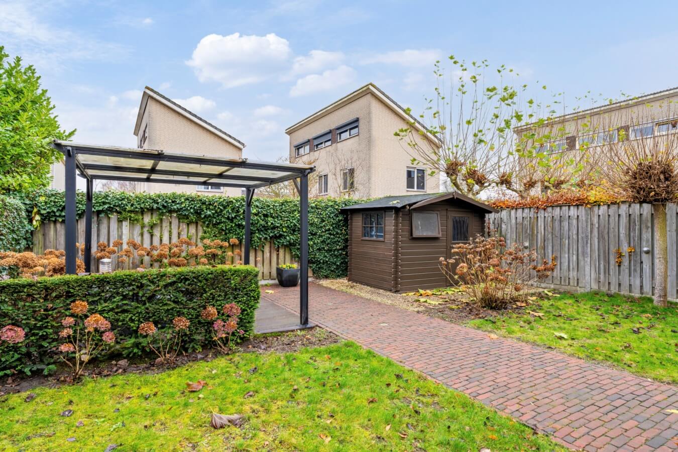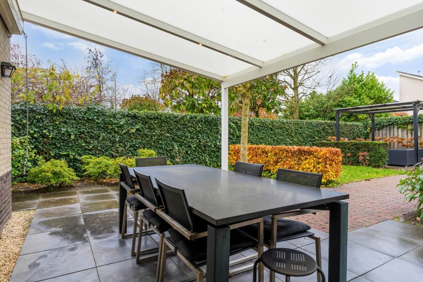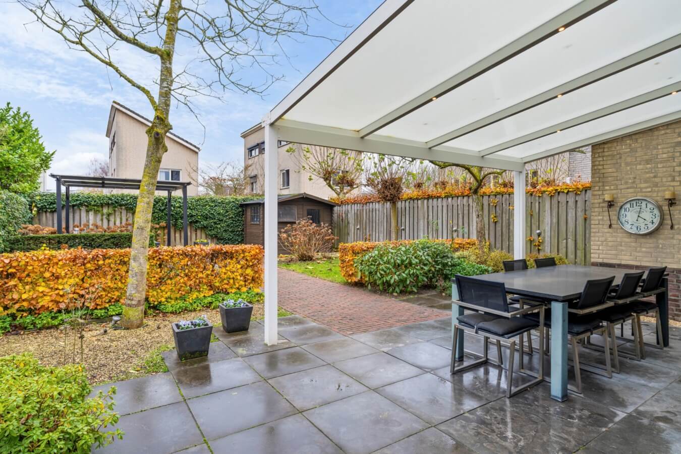 Je beschikt hier niet alleen over meerdere ruime terrassen en stukken gazon in de zon, maar ook over een zonneluifel, een houten tuinhuisje en een overkapping en pergola die beschutting bieden bij minder zonnige dagen. Kortom: een tuin waar je straks eindeloos van het buitenleven zal genieten. Vanuit hier heb toegang tot de ruime garage. Laat die lente- en zomerdagen maar komen!