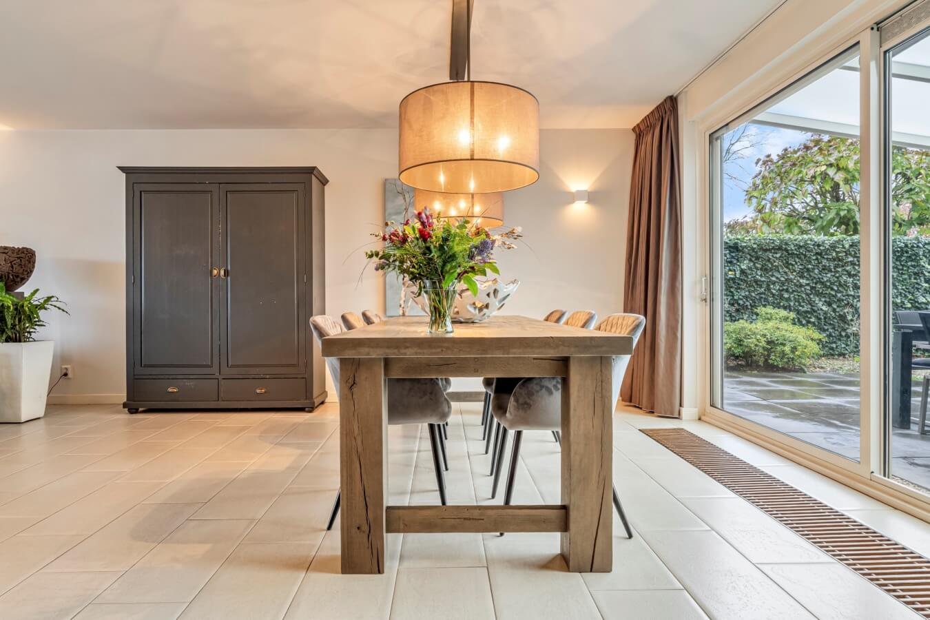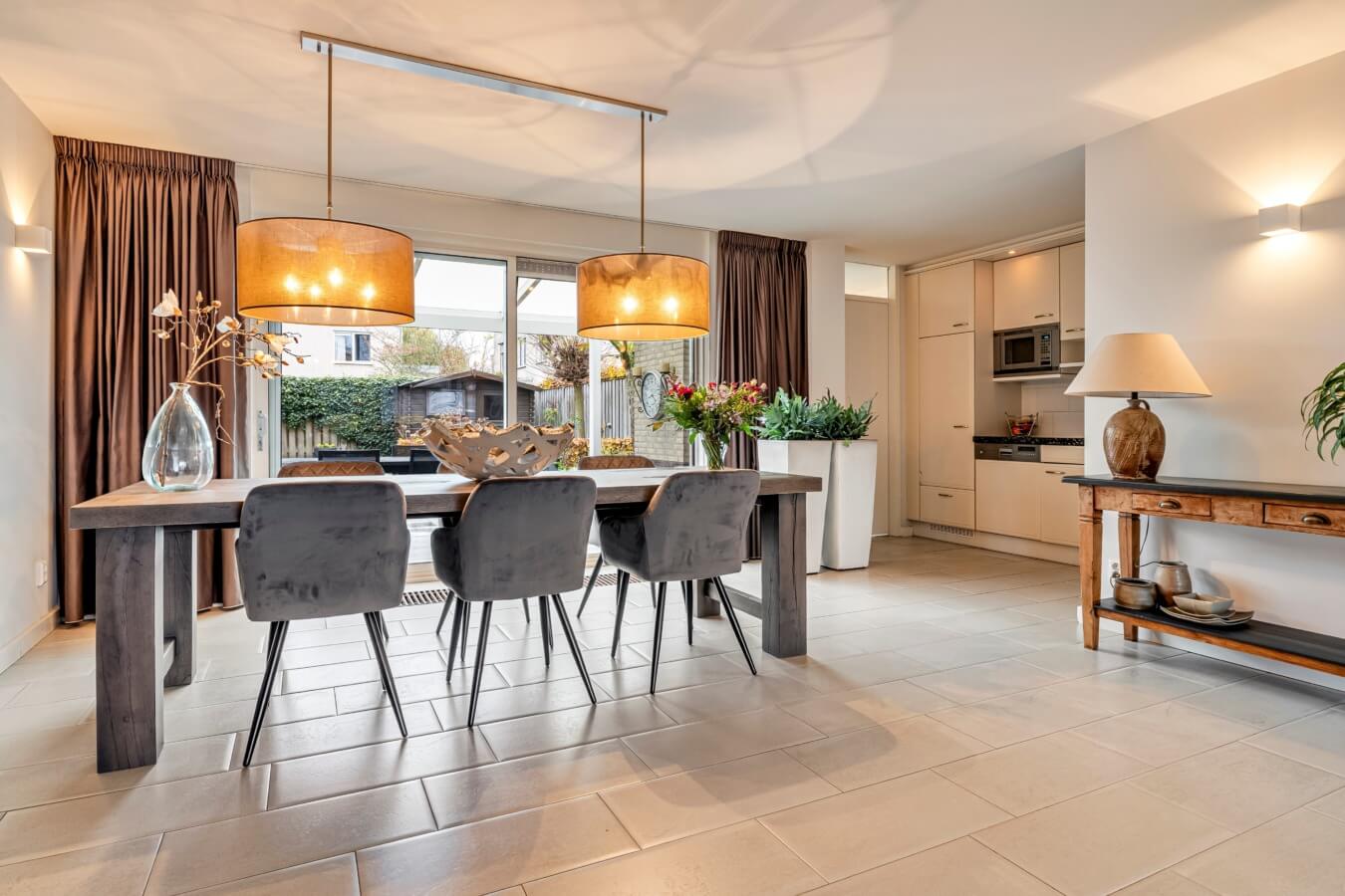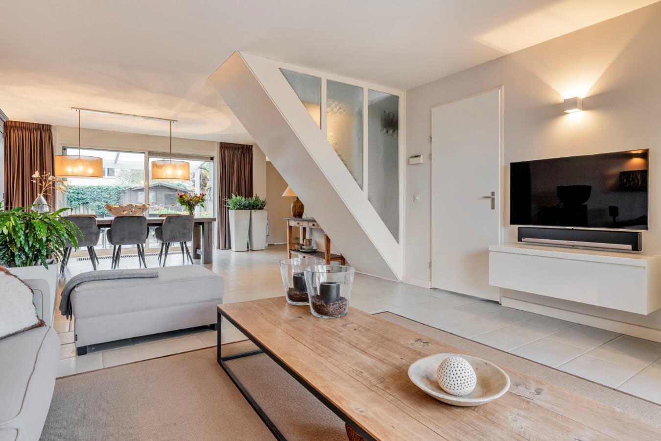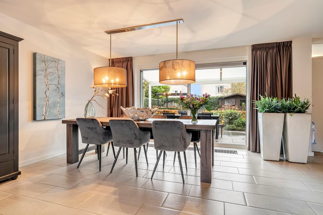 En die woonkamer komt in de vorm van een tuingerichte living met een zee van ruimte, bakken aan lichtinval en een nette lichte tegelvloer. Dankzij deze hoeveelheid ruimte en het semi separate woon- en eetgedeelte aan weerszijden van het trappenhuis, is er plek voor een royale zithoek nabij de sfeervolle erker aan de voorzijde. Het raam aan de voorzijde is voorzien van een elektrisch bedienbare screen m.b.v. een afstandsbediening. Voor een mooie eethoek is op haar beurt ruimte bij de schuifpui naar de tuin en de keuken.