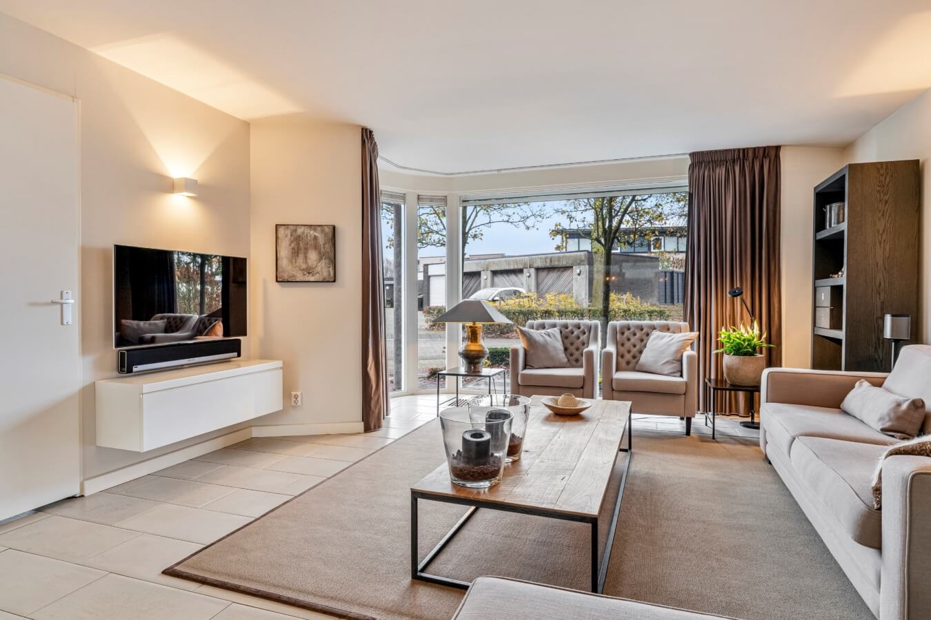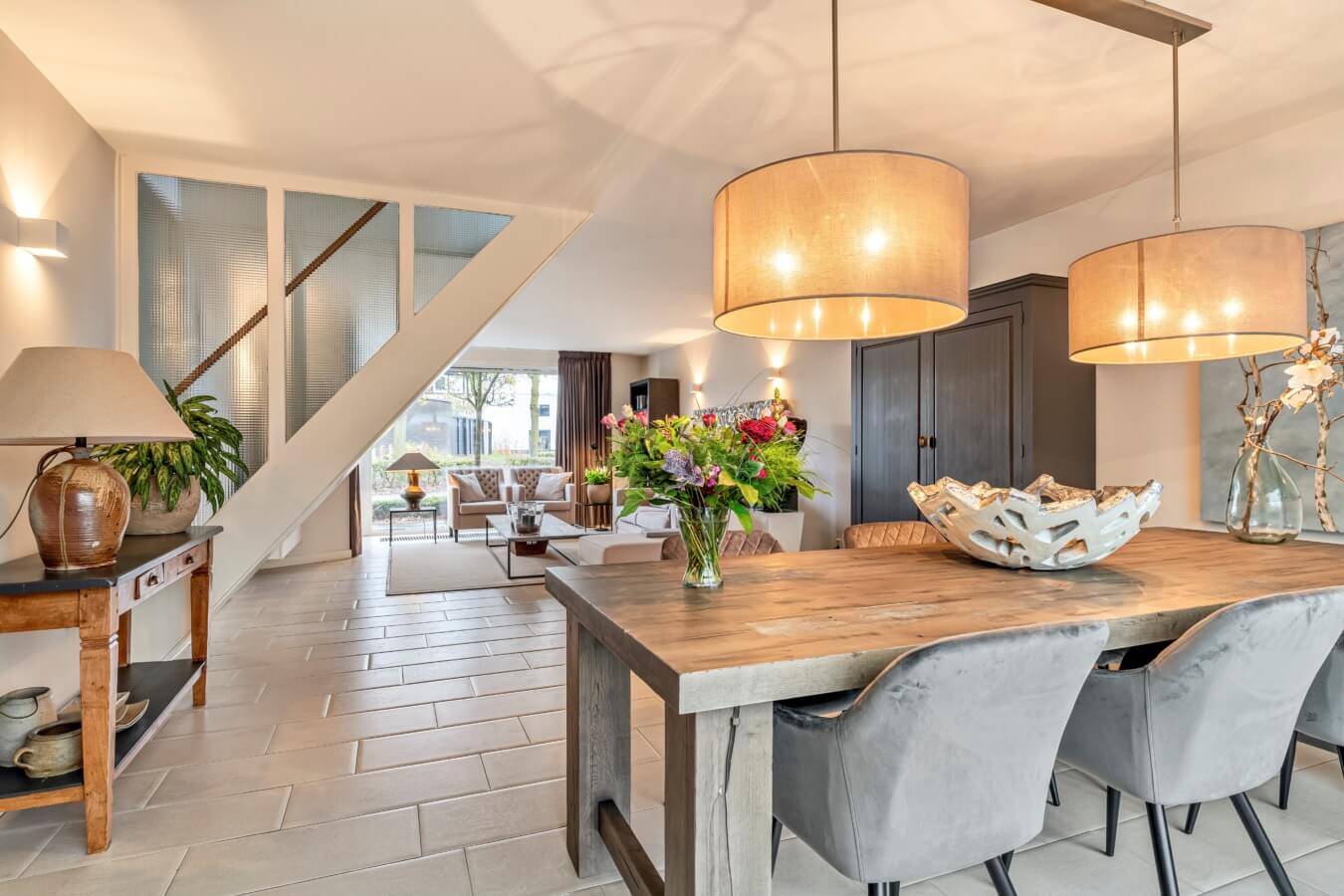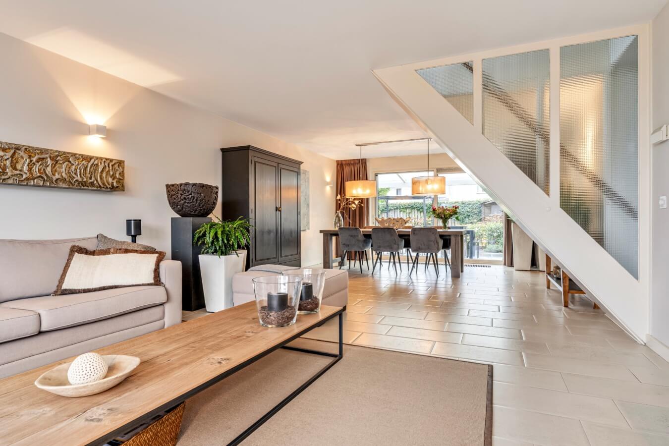 En die woonkamer komt in de vorm van een tuingerichte living met een zee van ruimte, bakken aan lichtinval en een nette lichte tegelvloer. Dankzij deze hoeveelheid ruimte en het semi separate woon- en eetgedeelte aan weerszijden van het trappenhuis, is er plek voor een royale zithoek nabij de sfeervolle erker aan de voorzijde. Het raam aan de voorzijde is voorzien van een elektrisch bedienbare screen m.b.v. een afstandsbediening. Voor een mooie eethoek is op haar beurt ruimte bij de schuifpui naar de tuin en de keuken.