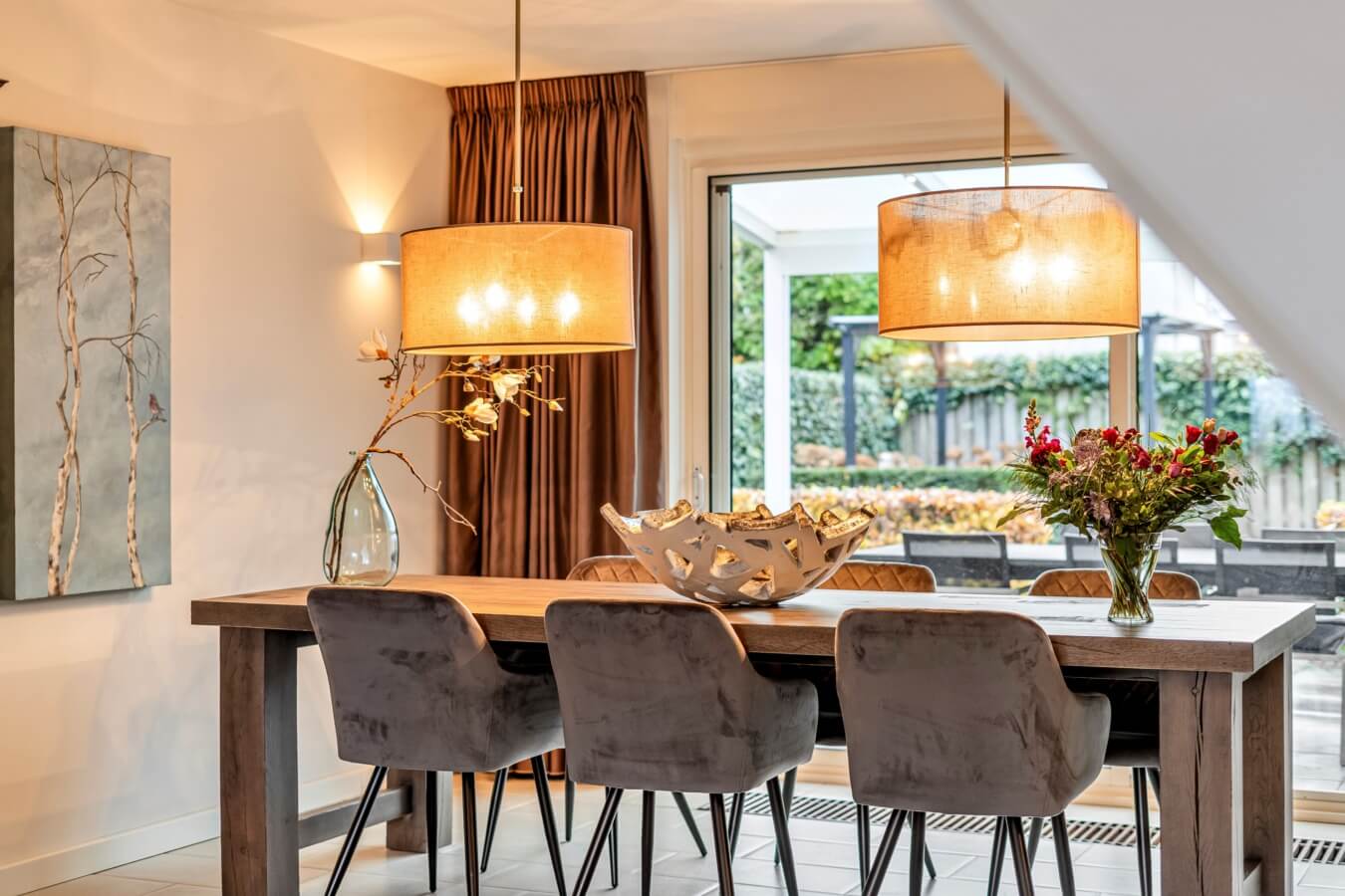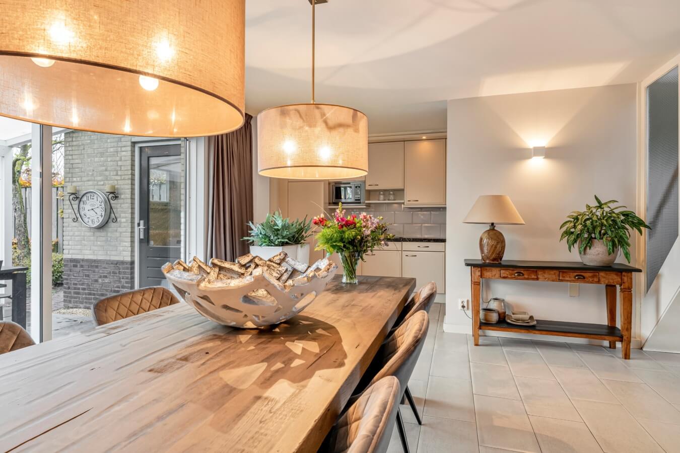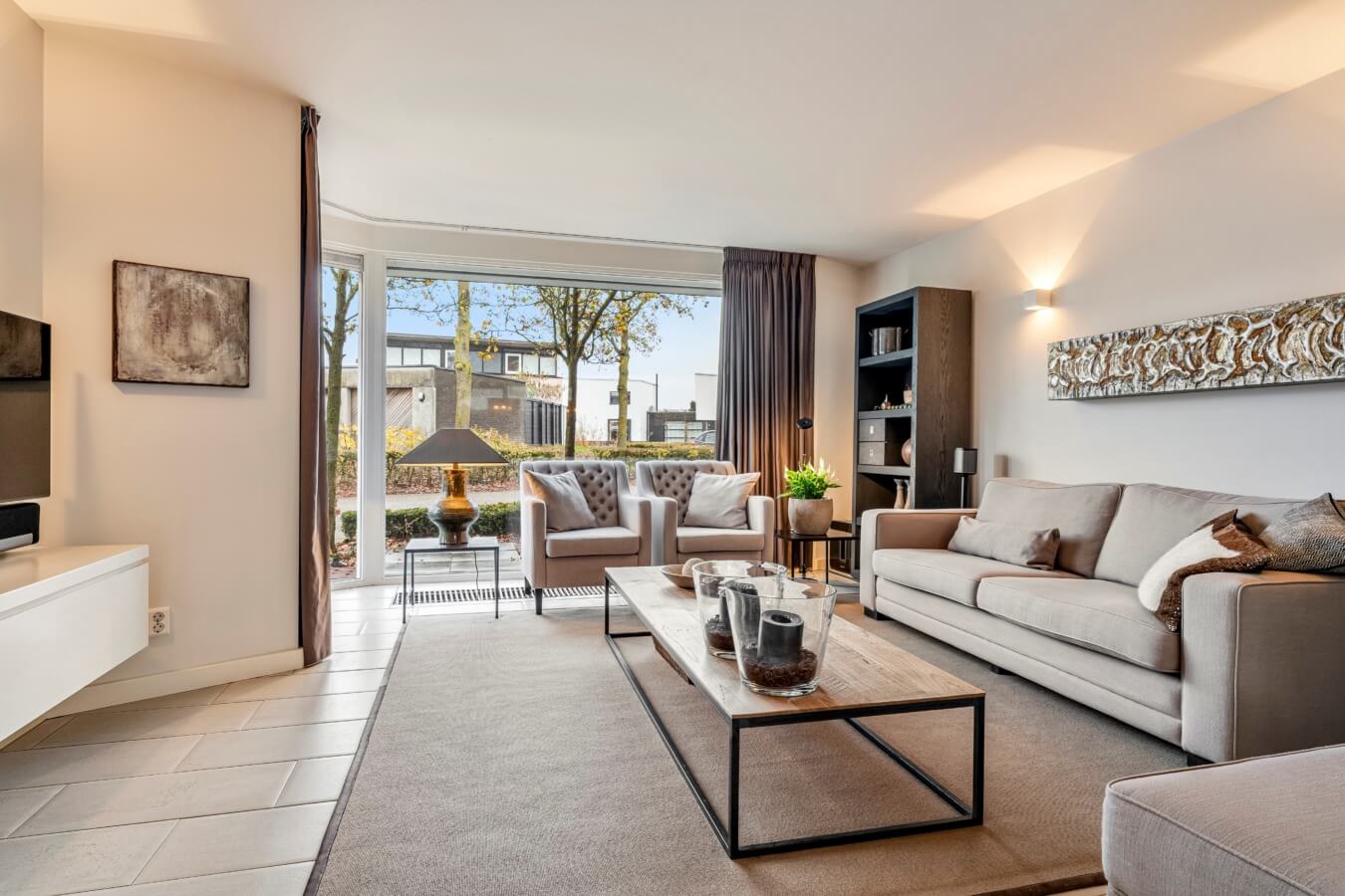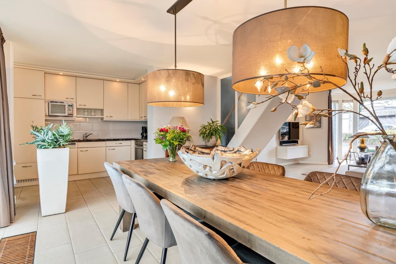 En die woonkamer komt in de vorm van een tuingerichte living met een zee van ruimte, bakken aan lichtinval en een nette lichte tegelvloer. Dankzij deze hoeveelheid ruimte en het semi separate woon- en eetgedeelte aan weerszijden van het trappenhuis, is er plek voor een royale zithoek nabij de sfeervolle erker aan de voorzijde. Het raam aan de voorzijde is voorzien van een elektrisch bedienbare screen m.b.v. een afstandsbediening. Voor een mooie eethoek is op haar beurt ruimte bij de schuifpui naar de tuin en de keuken.