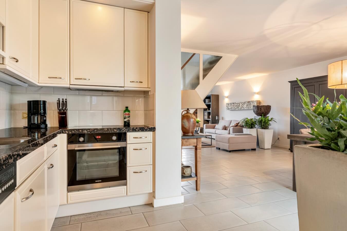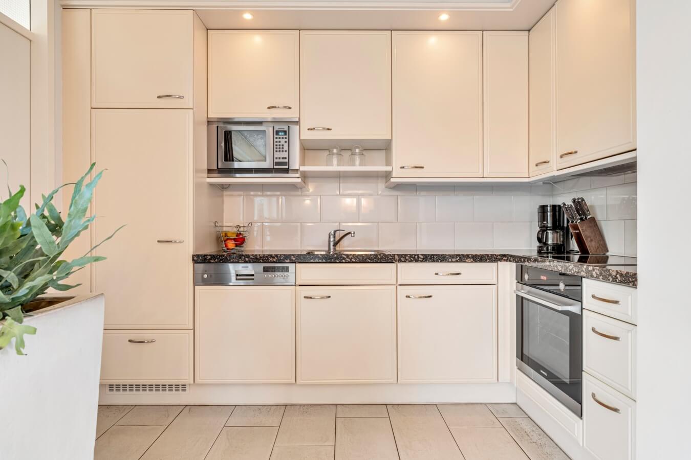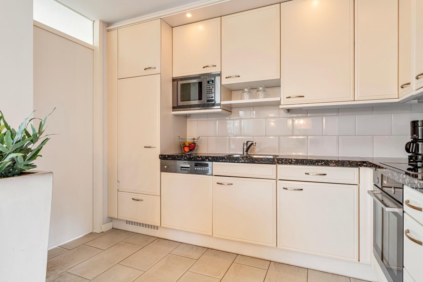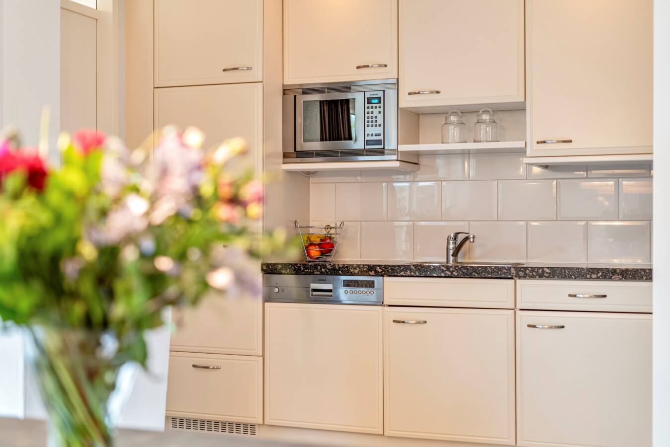 Over de keuken gesproken: deze ontdek je in een hoek van de living, heeft een lichte look en feel en is voorzien van diverse soorten inbouwapparatuur waaronder een inductie kookplaat, afzuigkap, koelkast, oven, magnetron, vaatwasser en meer dan genoeg werk- en bergruimte. De open setting bij de eettafel, wat ervoor zorgt dat jij tijdens het kokkerellen interactie kan houden met jouw favoriete gezelschap, heb je in ieder geval vast in de pocket. Eet smakelijk!