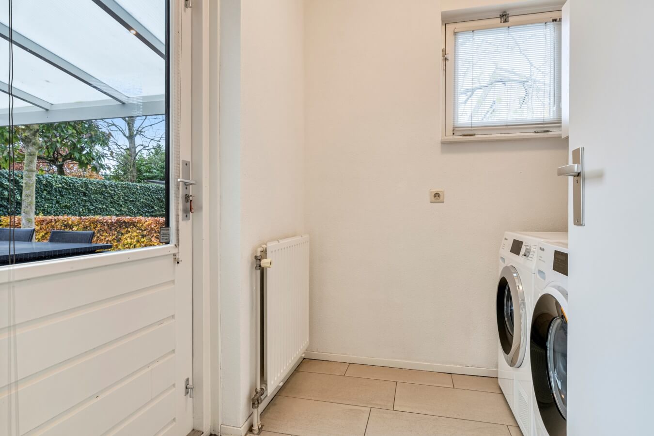 Voor we het vergeten: de keuken loopt door in een handige bijkeuken. Hier vind je de aansluitingen voor wasapparatuur en een tweede doorgang naar de achtertuin.