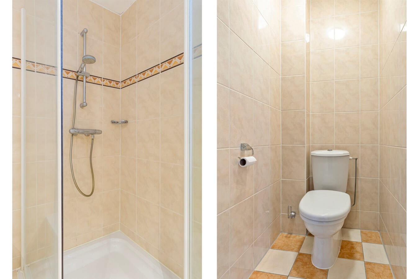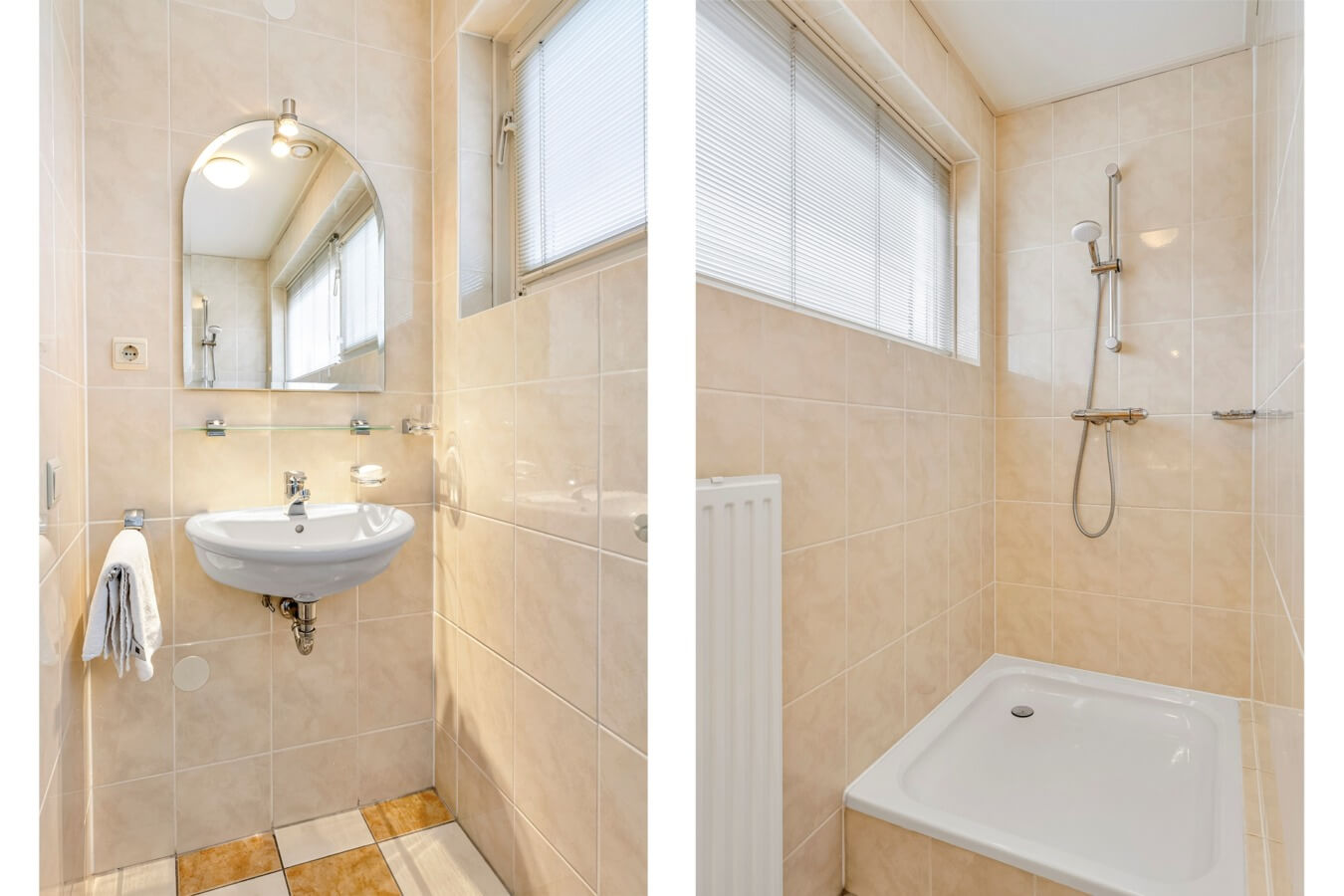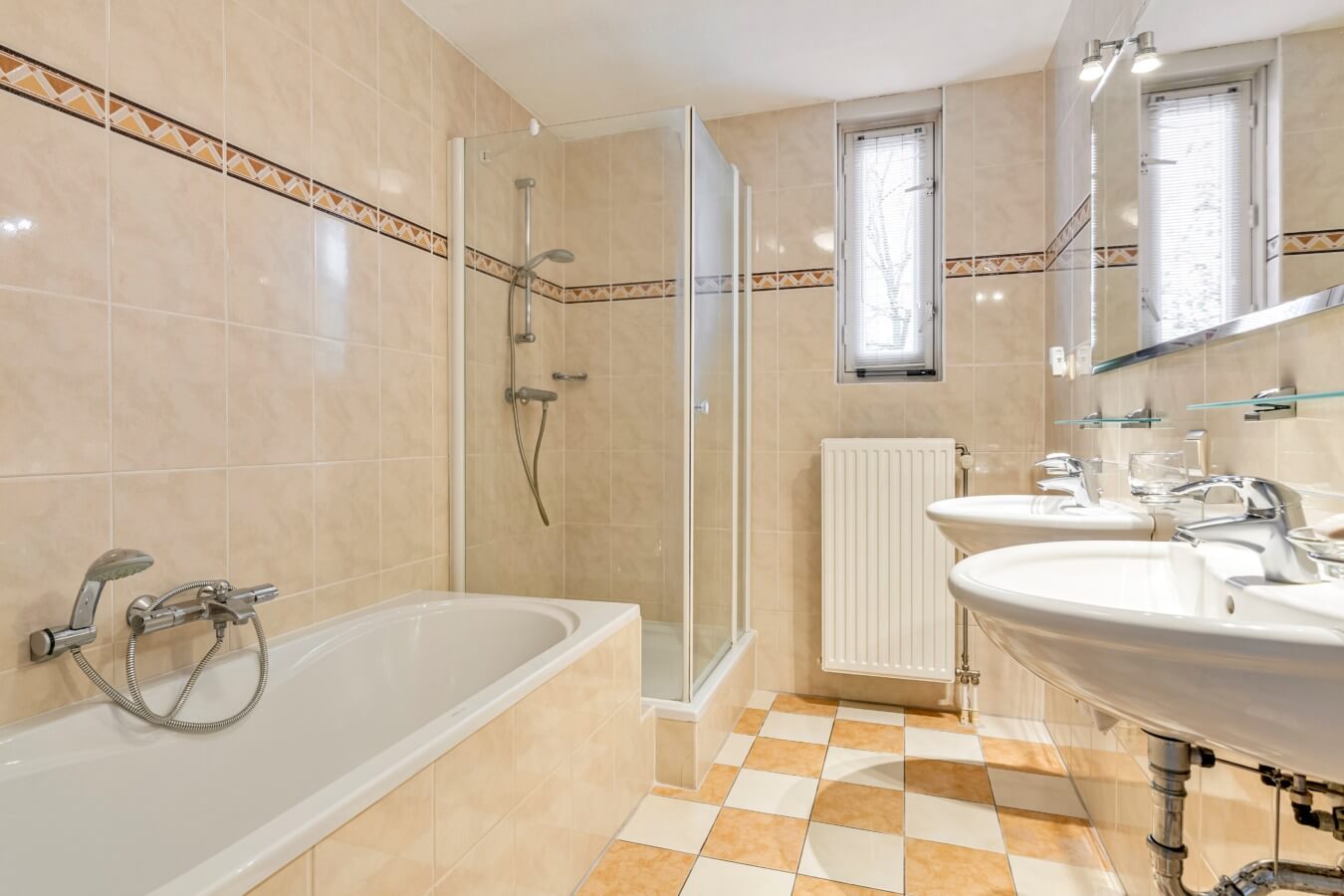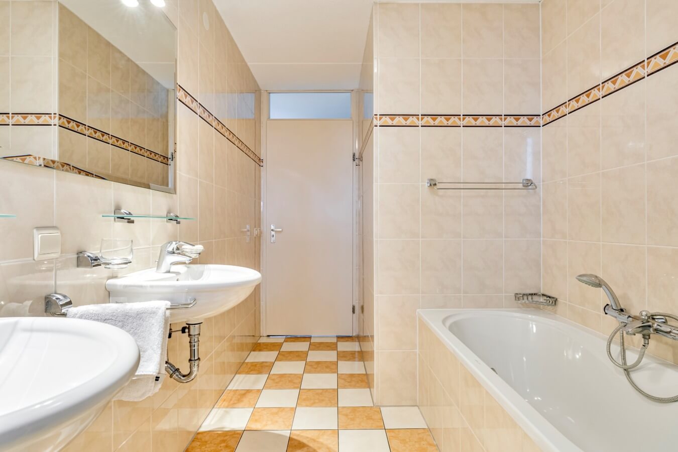 De badkamer, aan de rechter voorzijde, is uitgerust met een ligbad, douchecabine en twee wastafels met spiegelkast. Kortom: alles wat je nodig hebt.