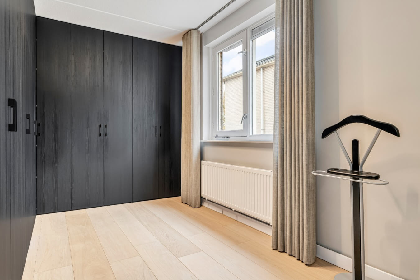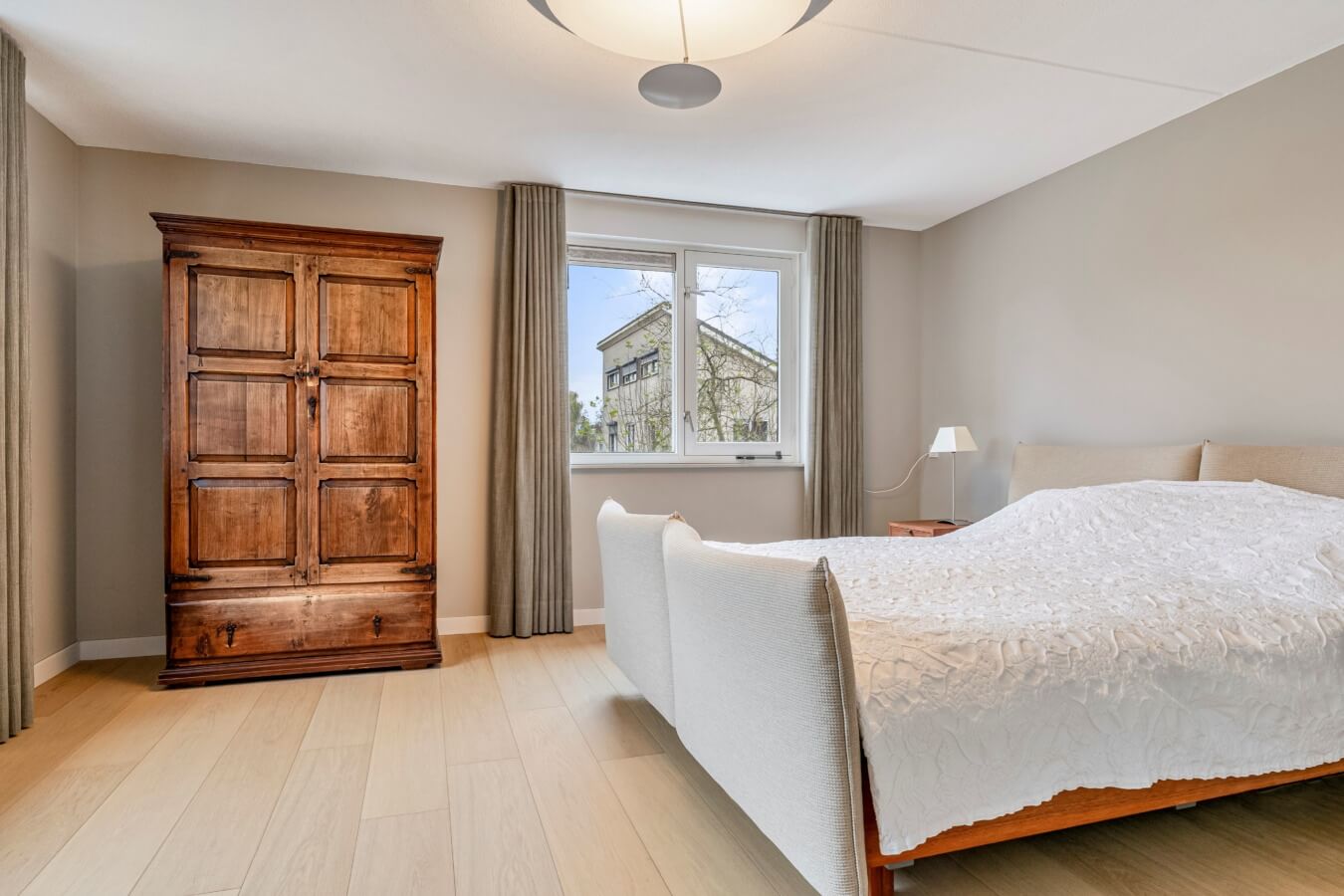 De grootste slaapkamer van de verdieping ontdek je over de volledige breedte aan de achterzijde van de woning. Als je hier geen fijne master bedroom van kan maken, dan weten wij het ook niet meer. De keurige afwerkingen, het neutrale kleurgebruik waardoor je het naar jouw wens kan stylen, aangenaam veel lichtinval, en meer dan genoeg ruimte voor alle gewenste meubels: de kamer heeft het allemaal.