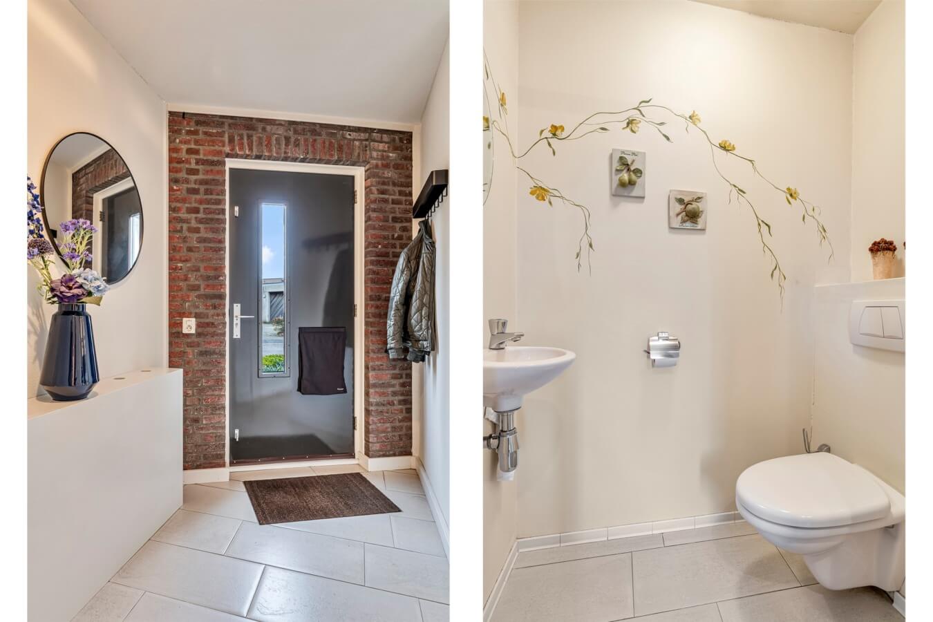 Je stapt de woning binnen in de entree, die een prettige toon zet met haar ruimte en neutrale kleurgebruik. De hal is voorzien van de meterkast, de toiletruimte met hangend closet en fonteintje, de trap naar boven en de deur naar de woonkamer.