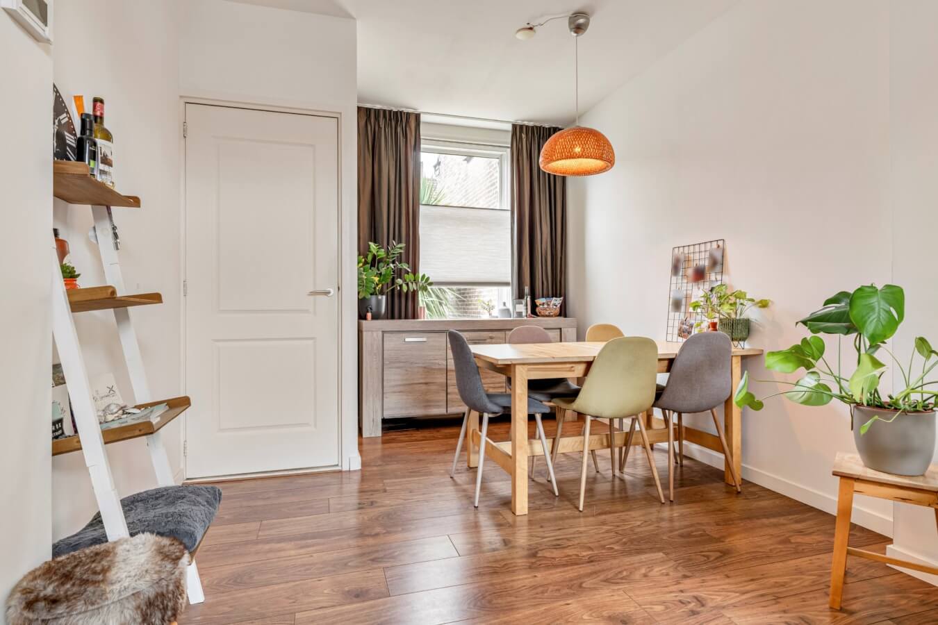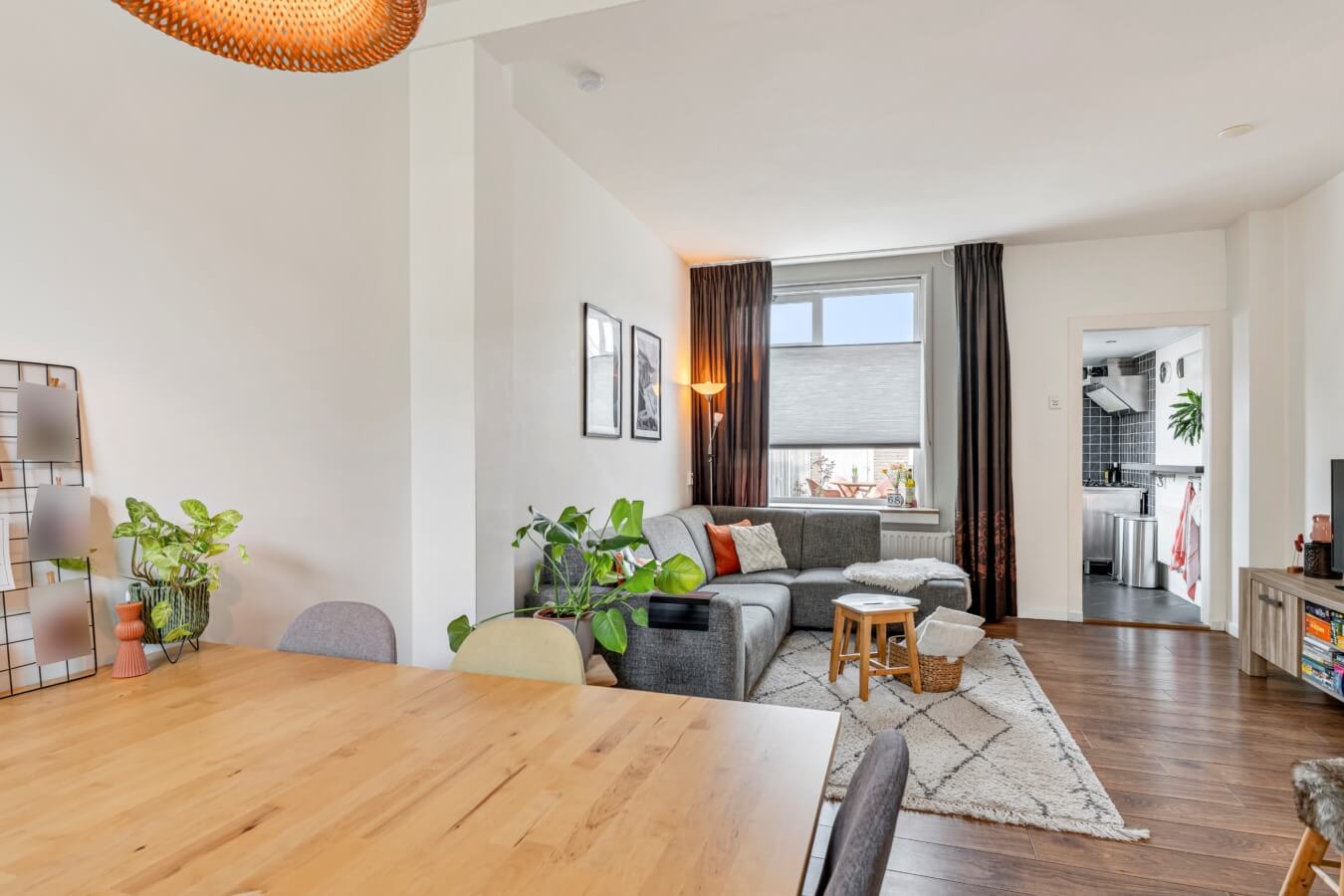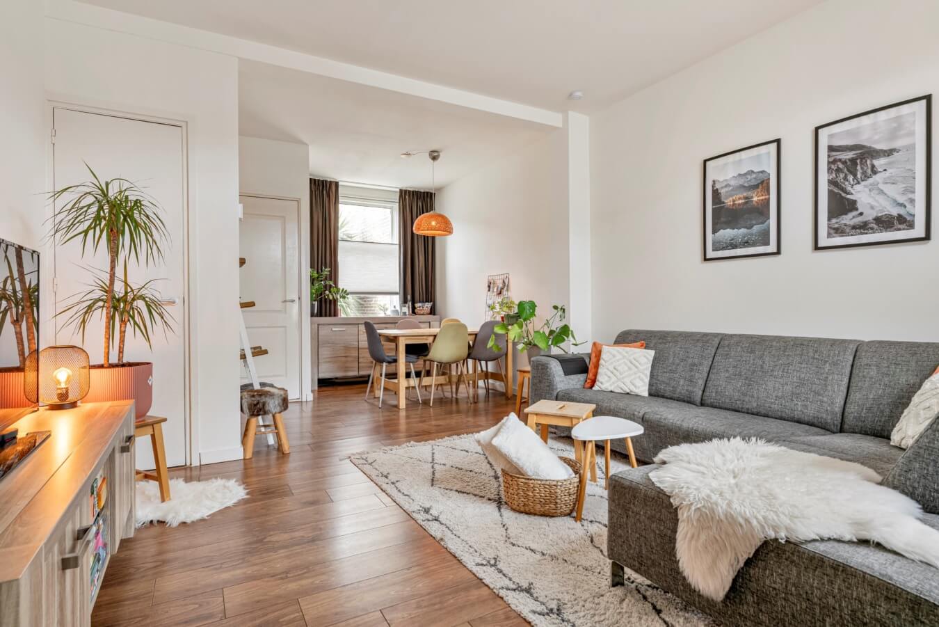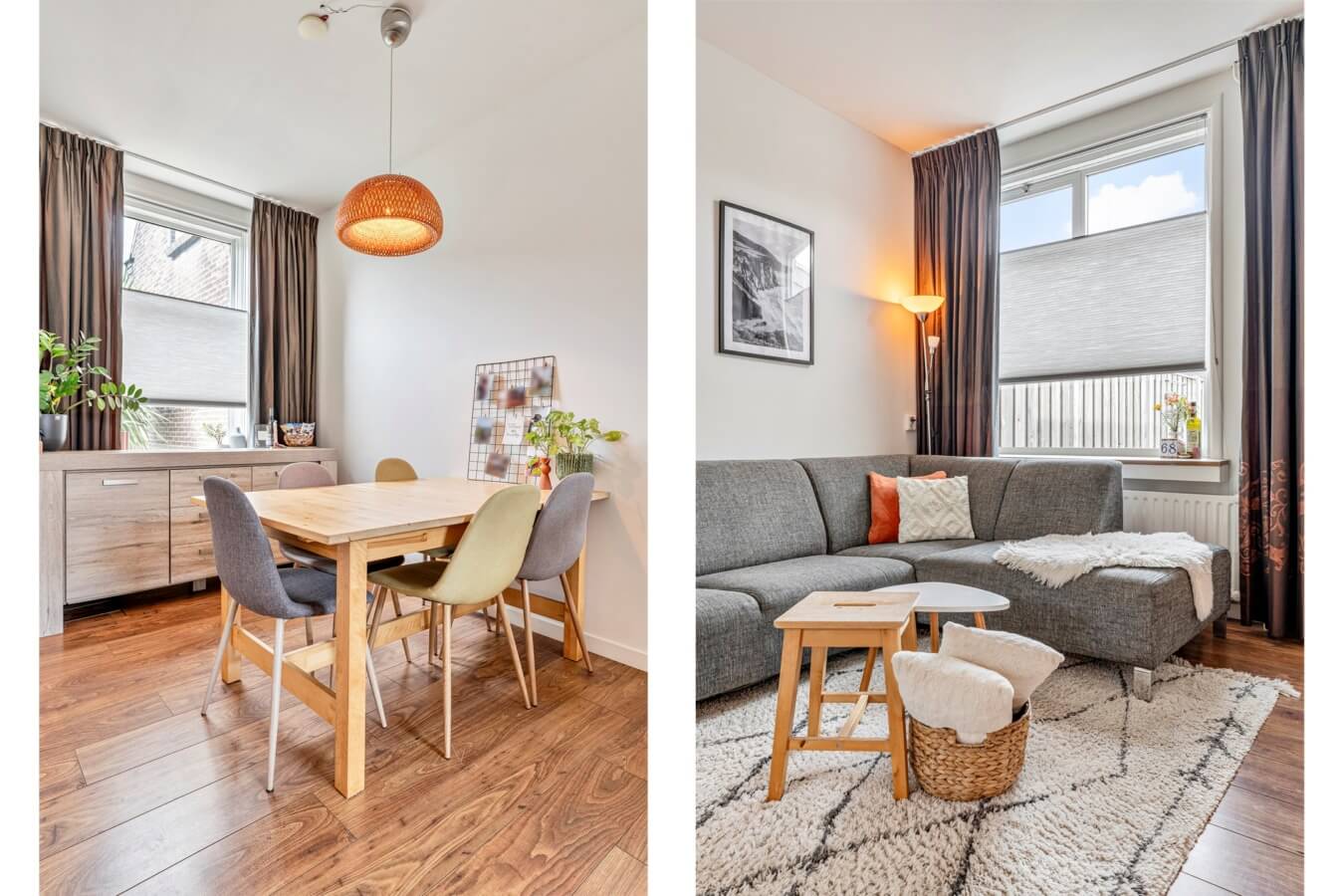 En in die living vallen de nette afwerkingen, de fraaie daglichtinval door de raampartijen aan weerszijden en gezellige details alom meteen op. Door de vorm van de ruimte kan je in de kamer gemakkelijk een in elkaar overlopend zit- en eetgedeelte creëren, net zoals de huidige bewoners dat hebben gedaan.