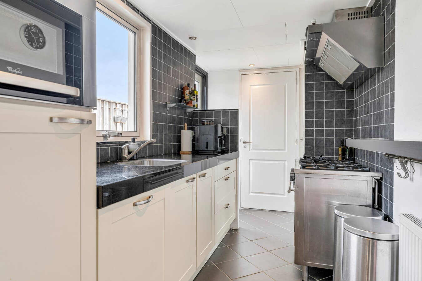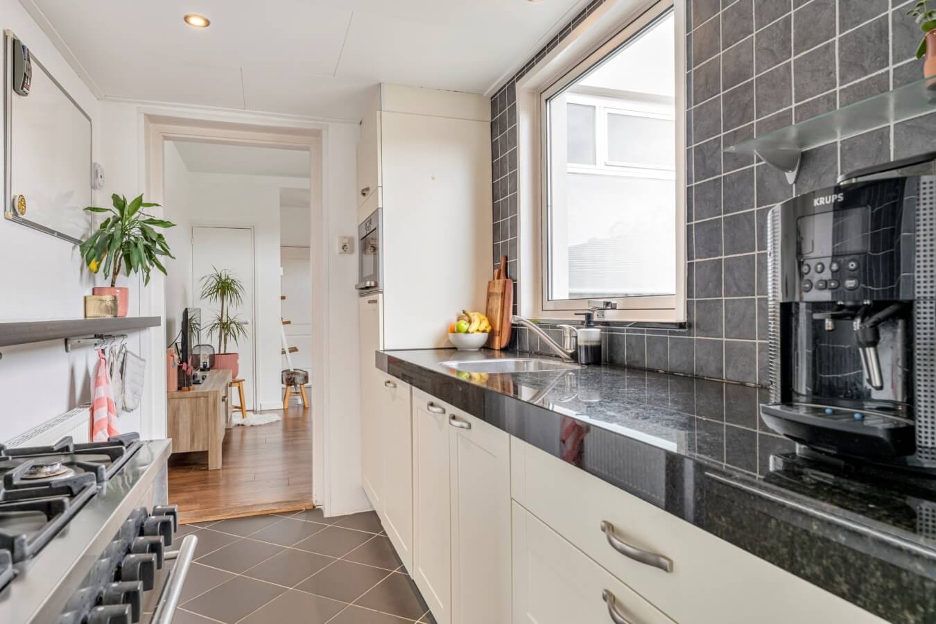 Achter de woonkamer bevindt zich de fijne semi-open keuken, die is opgesteld in een wandopstelling en voorzien is van diverse inbouwapparatuur, waaronder een koelkast (2023), vaatwasser, magnetron, een 6-pits gasfornuis met grote oven en een afzuigkap. Laat je vrienden maar komen voor een avondje pizza’s eten!