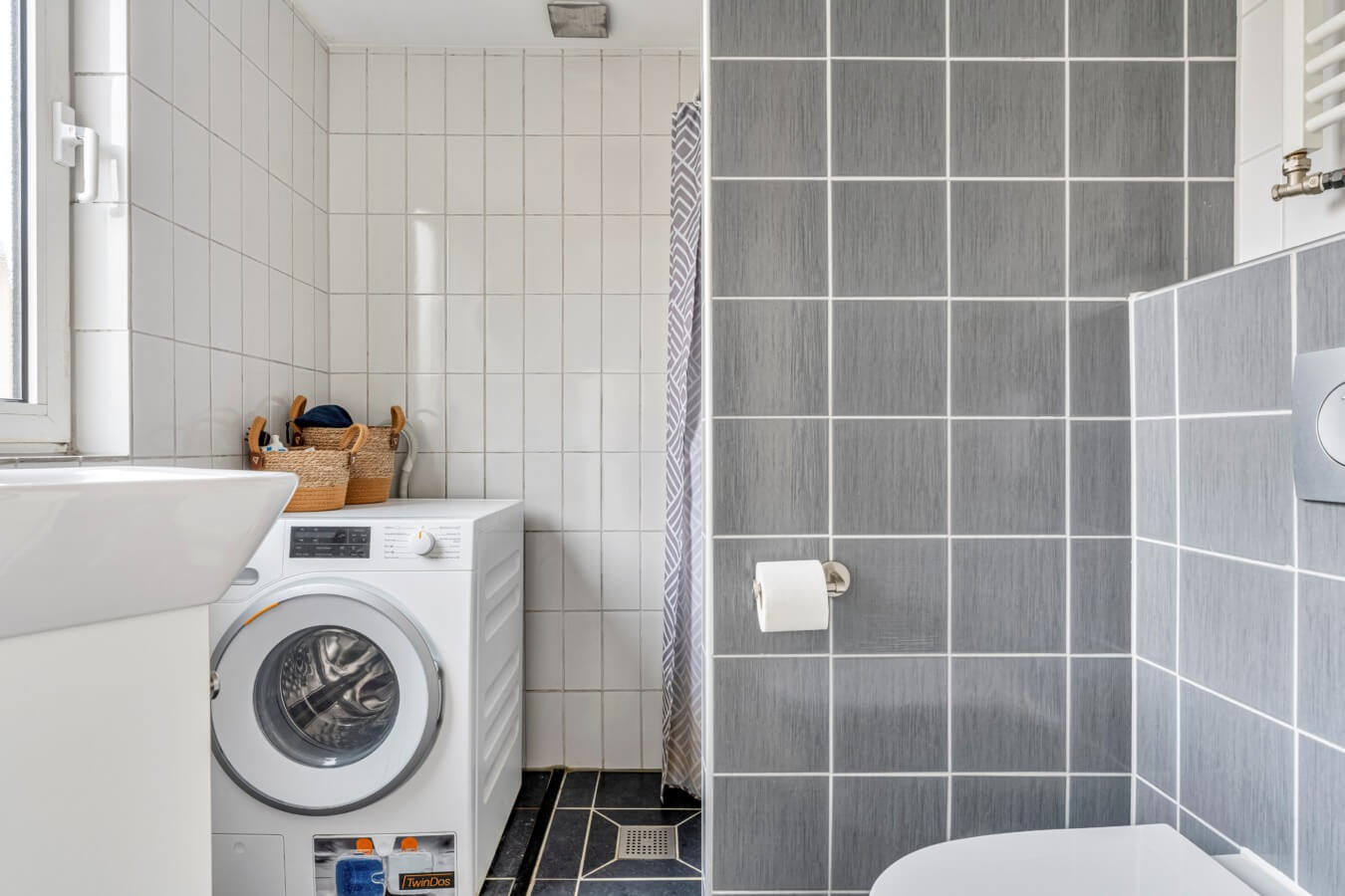Loop je verder door de keuken bevindt zich de toegang tot de badkamer. Een fijne, praktisch ingerichte badkamer, die voorzien is van een toilet, wastafel, inloopdouche en de aansluitingen voor wasapparatuur.