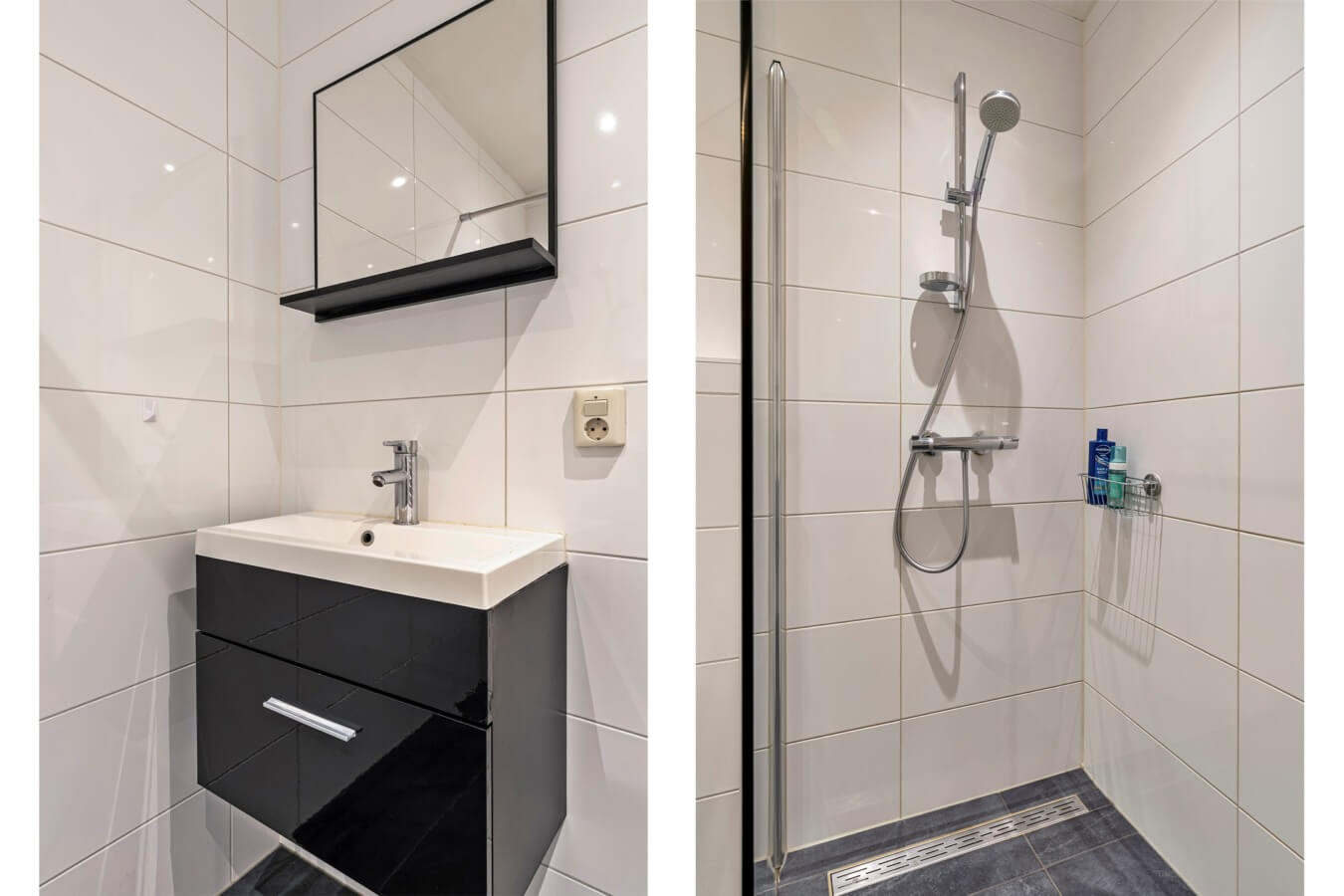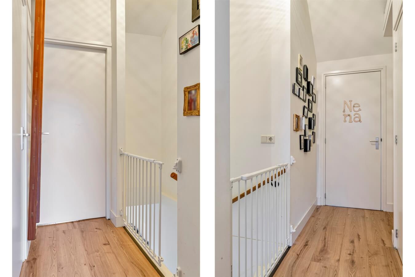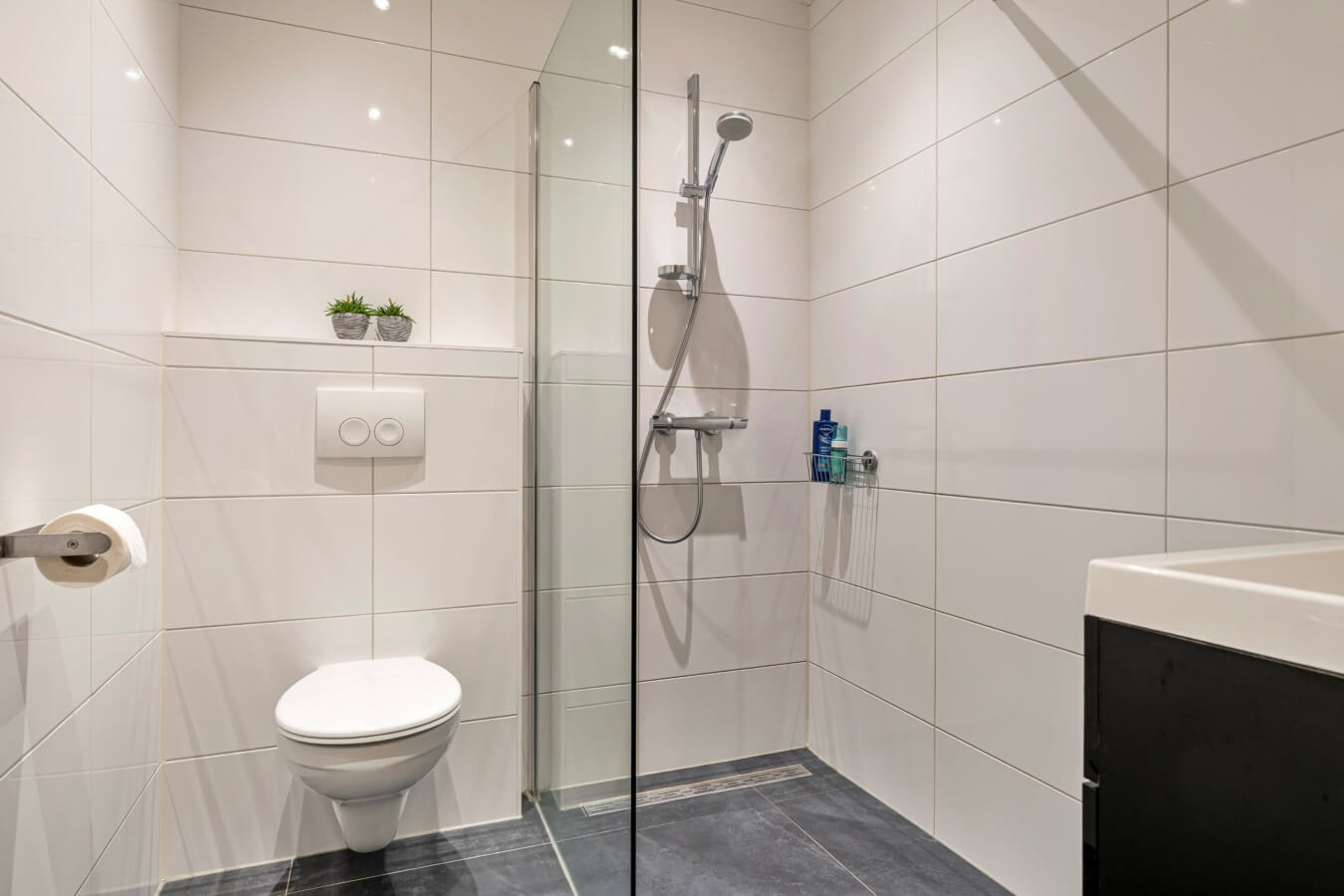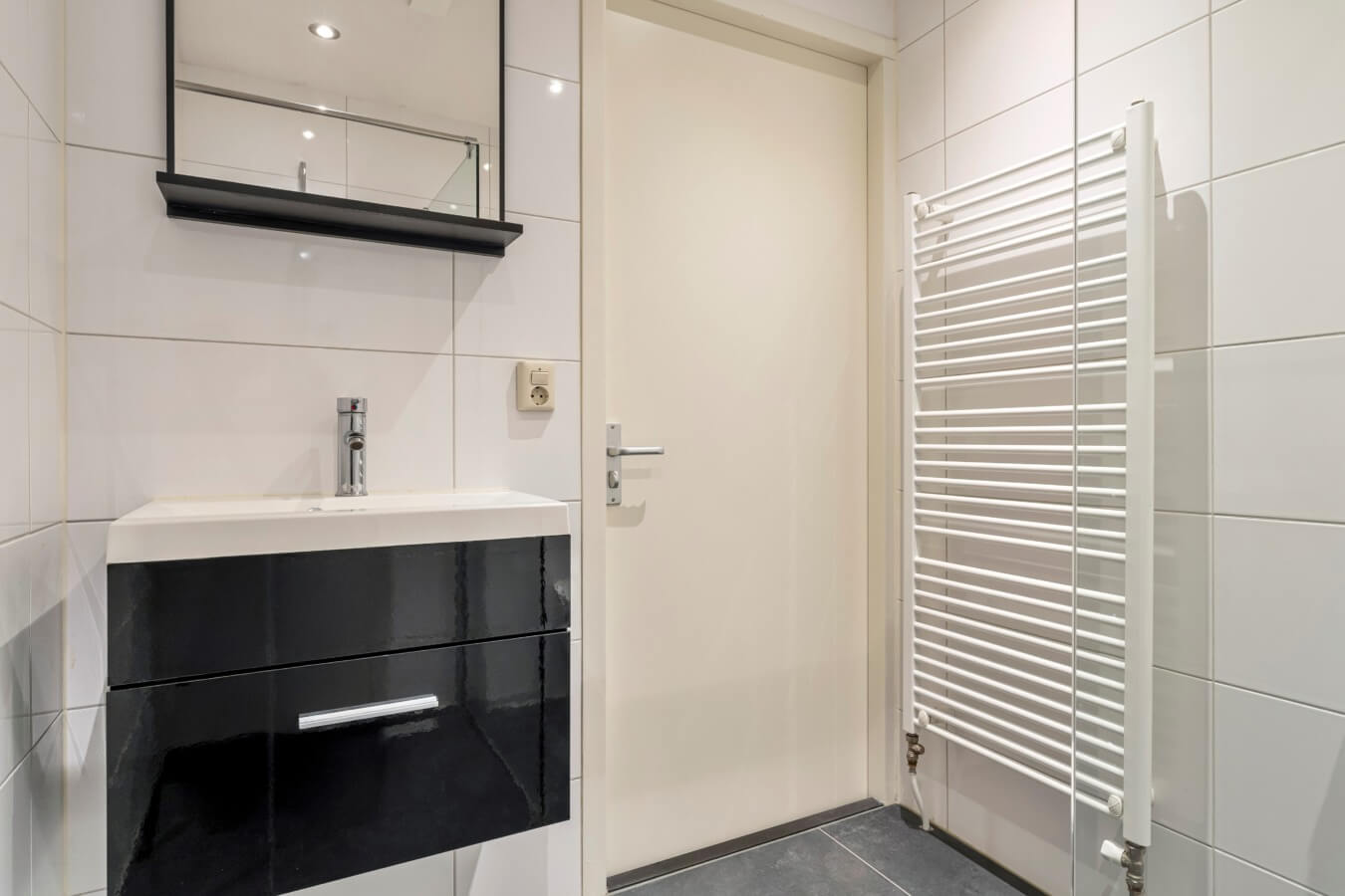 Overloop met toegang tot drie slaapkamers van ca. 6 m², 6 m² en 10 m². De slaapkamers zijn voorzien van laminaatvloeren, strak stucwerk en een dakkapel. De moderne badkamer beschikt over een douche met thermostaatkraan, toilet, wastafel en design radiator.