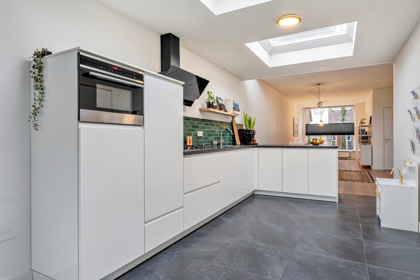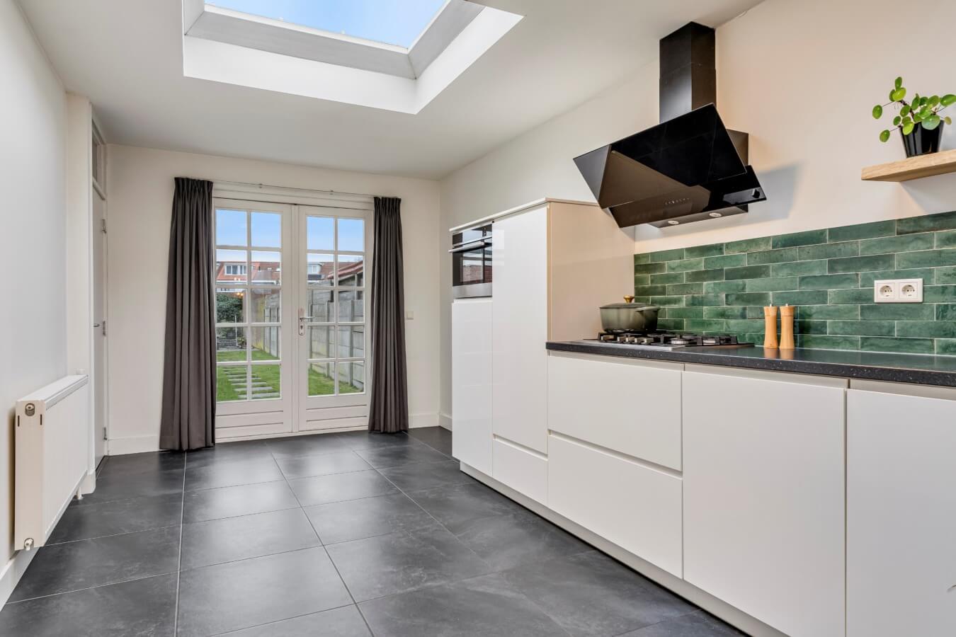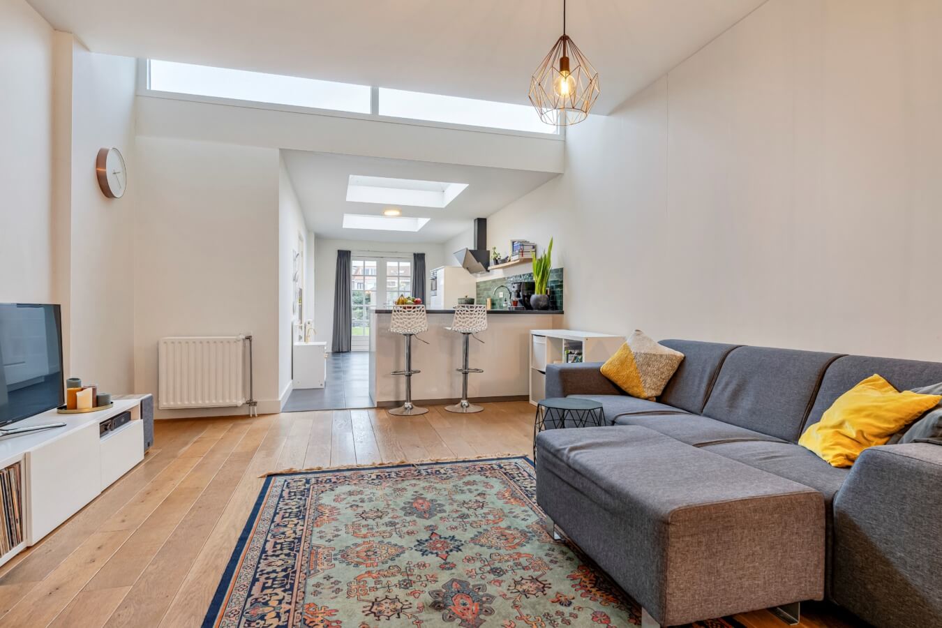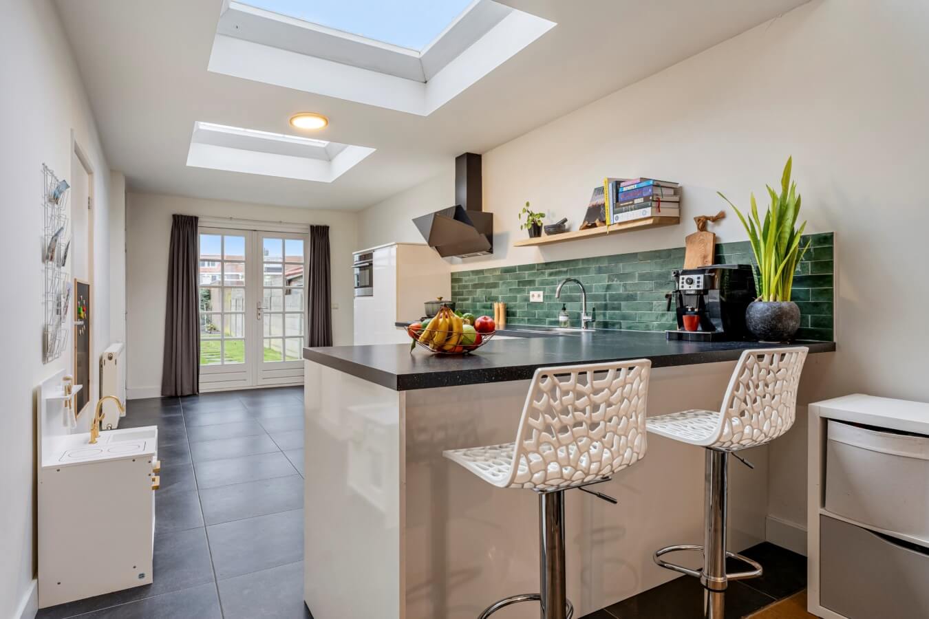 De moderne open keuken in hoekopstelling met eetbar vormt het hart van de woning. De keuken is afgewerkt met een tegelvloer, twee lichtkoepels en openslaande deuren naar de tuin. Voorzien van diverse inbouwapparatuur zoals een koelkast, 5-pits gasfornuis, design afzuigschouw, vaatwasser en combimagnetron. De totale living (woonkamer en woonkeuken) van ca. 50 m² is bijzonder ruim en licht.