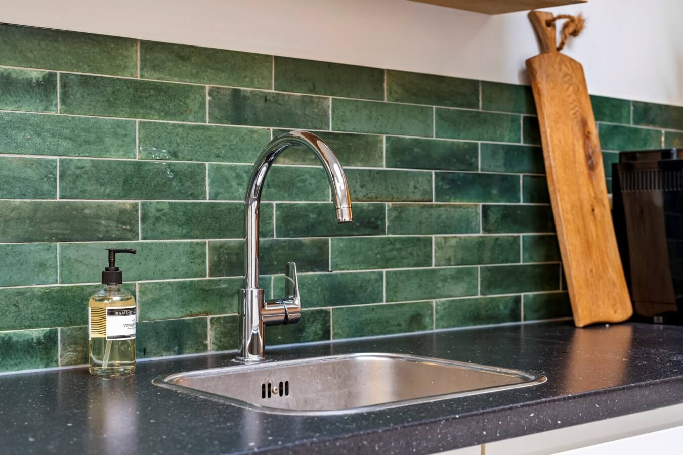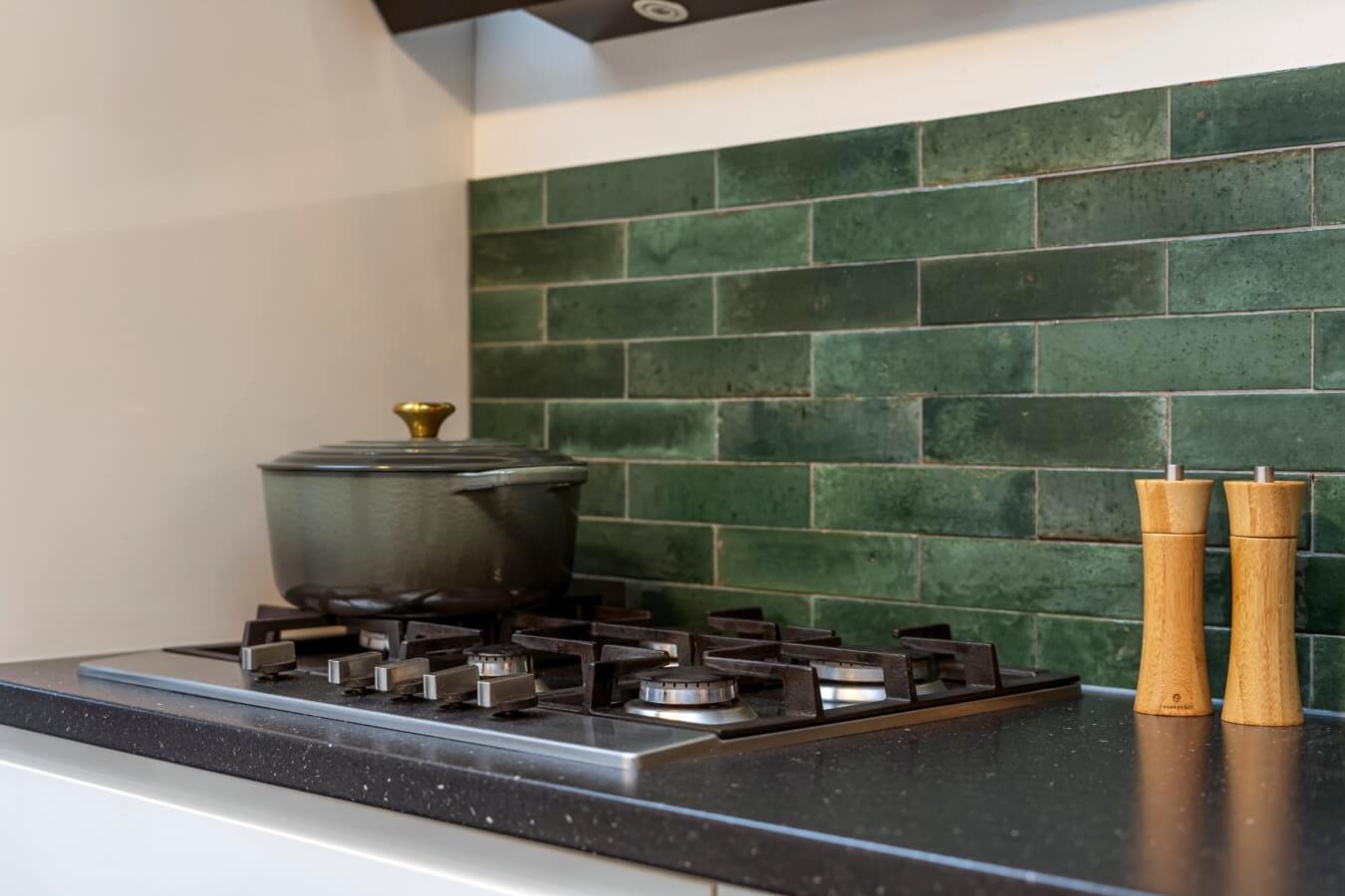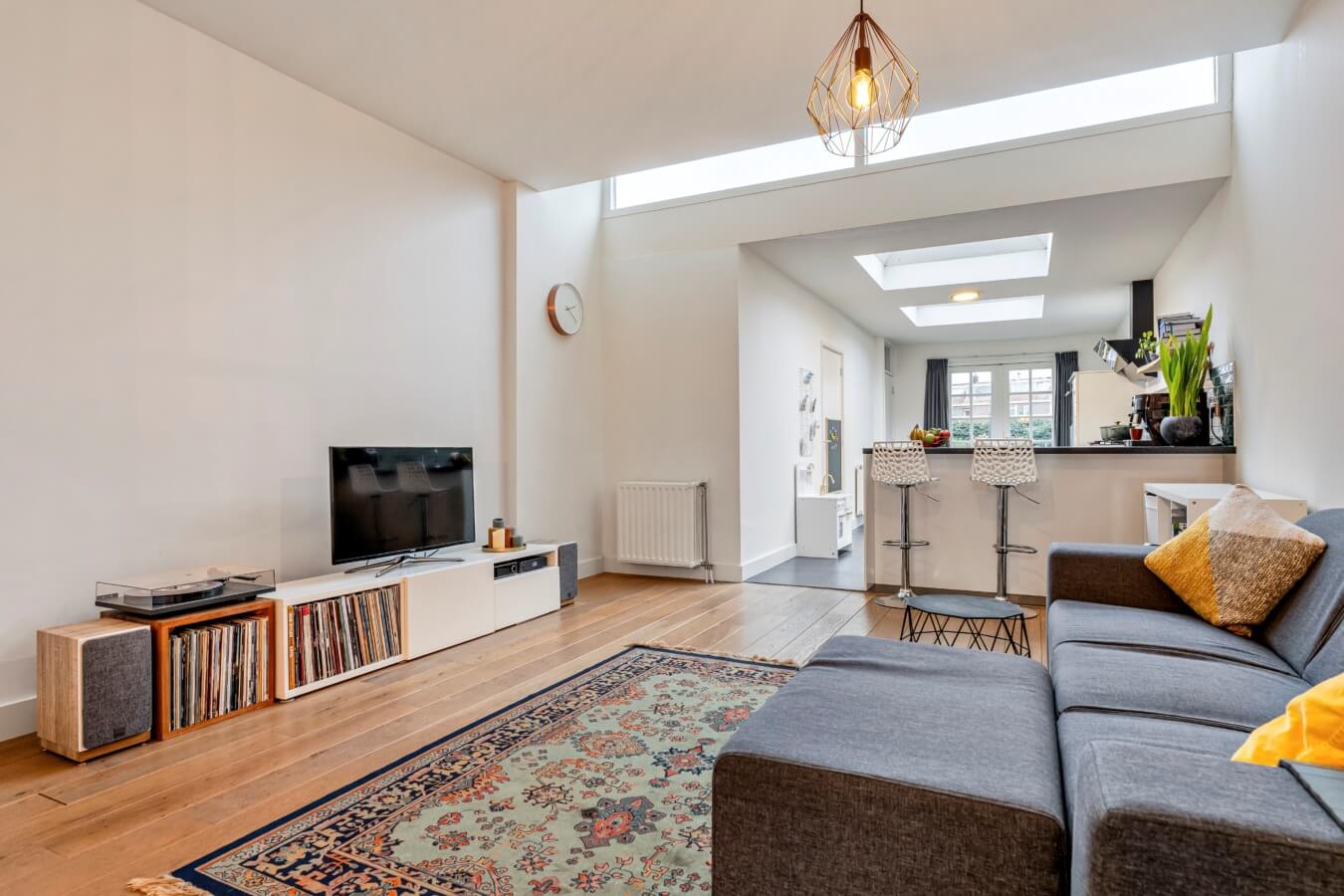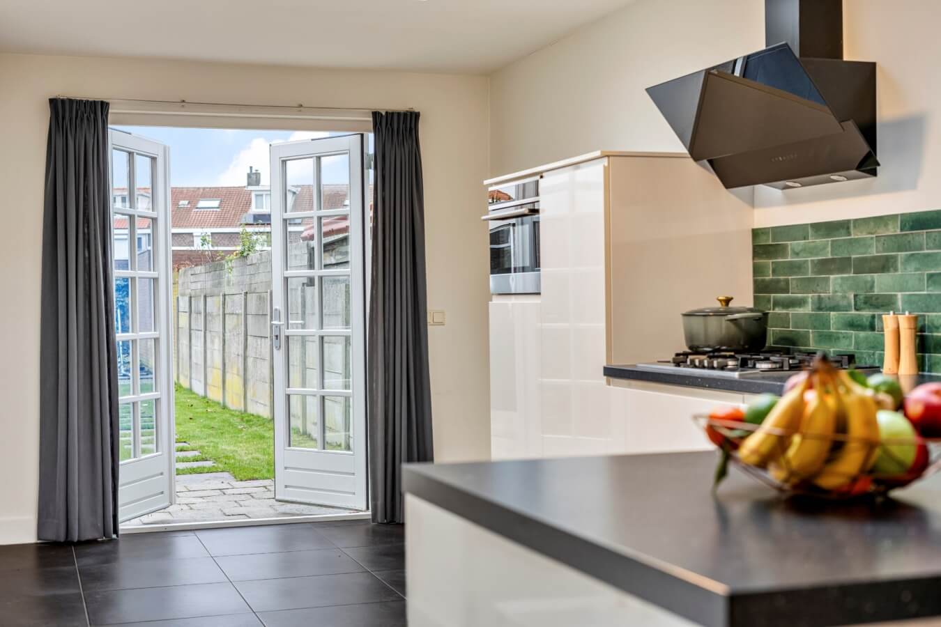 De moderne open keuken in hoekopstelling met eetbar vormt het hart van de woning. De keuken is afgewerkt met een tegelvloer, twee lichtkoepels en openslaande deuren naar de tuin. Voorzien van diverse inbouwapparatuur zoals een koelkast, 5-pits gasfornuis, design afzuigschouw, vaatwasser en combimagnetron. De totale living (woonkamer en woonkeuken) van ca. 50 m² is bijzonder ruim en licht.