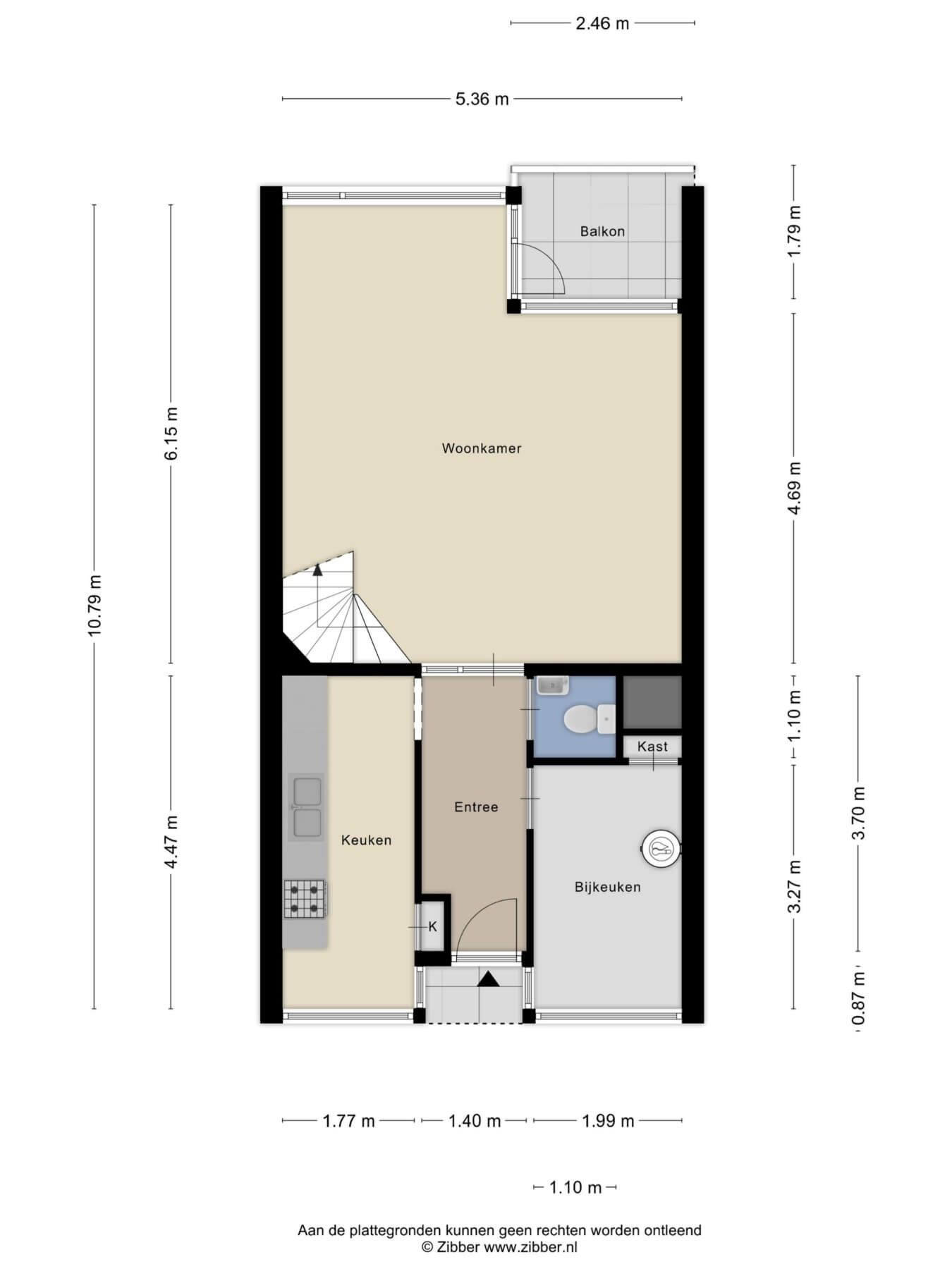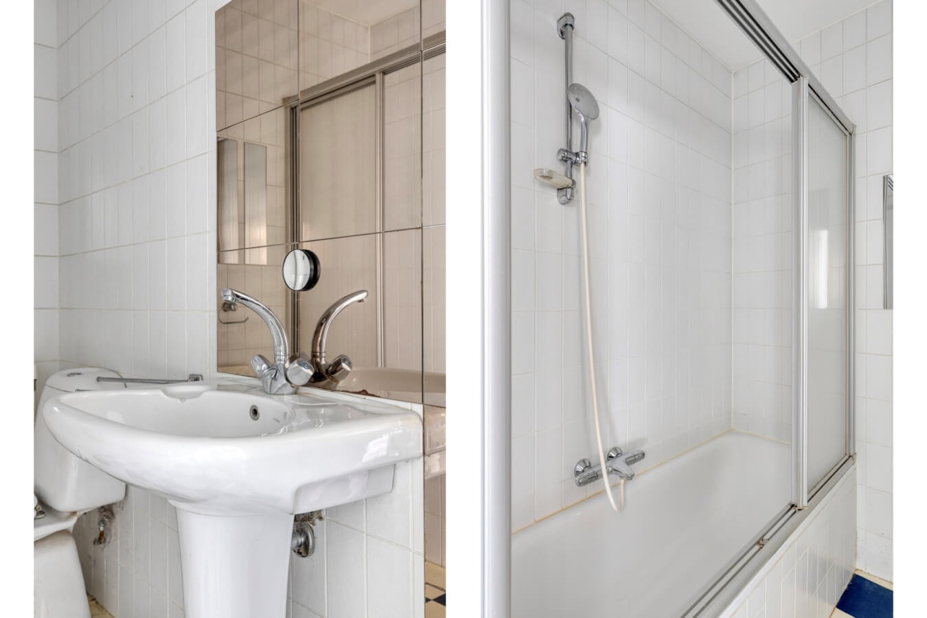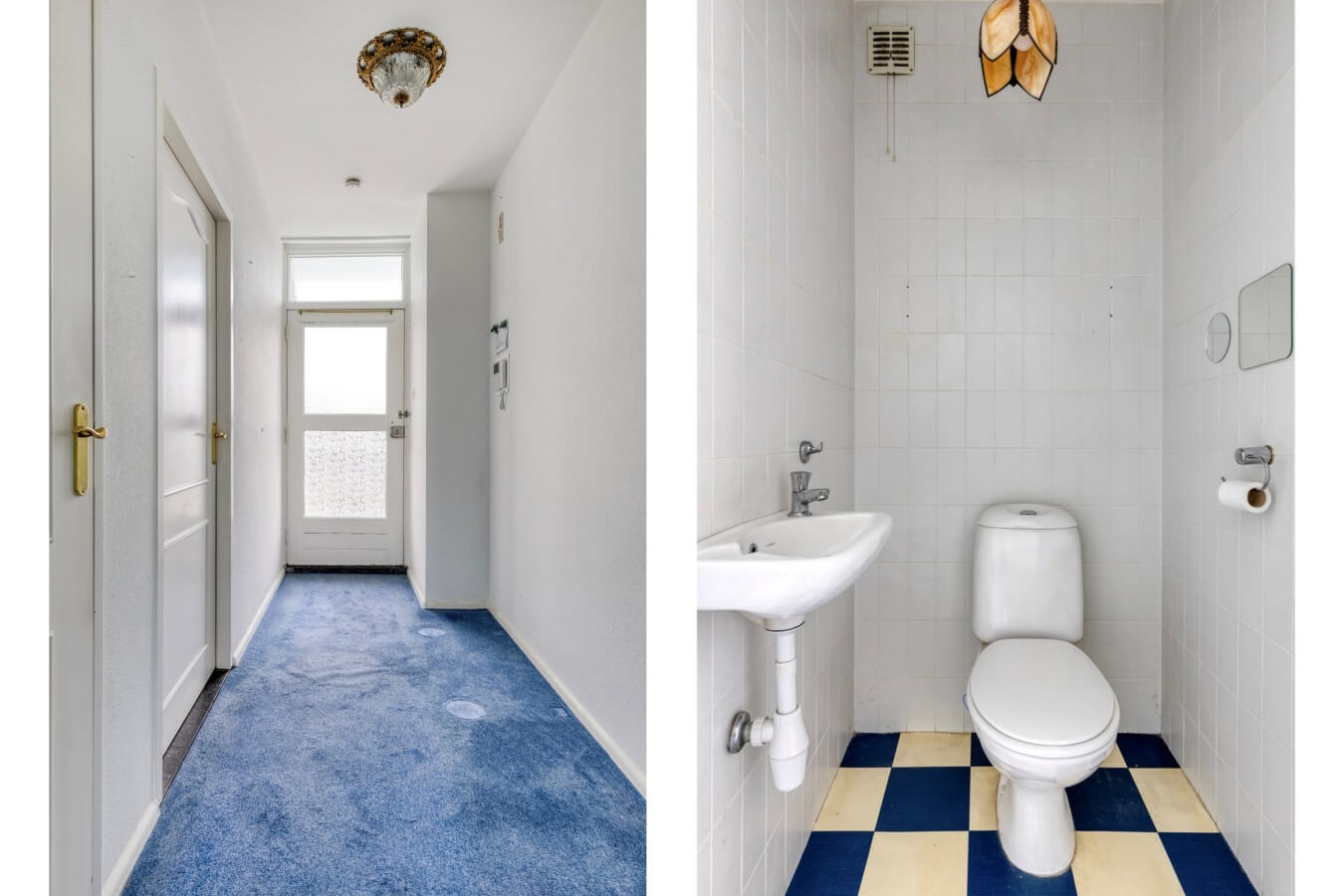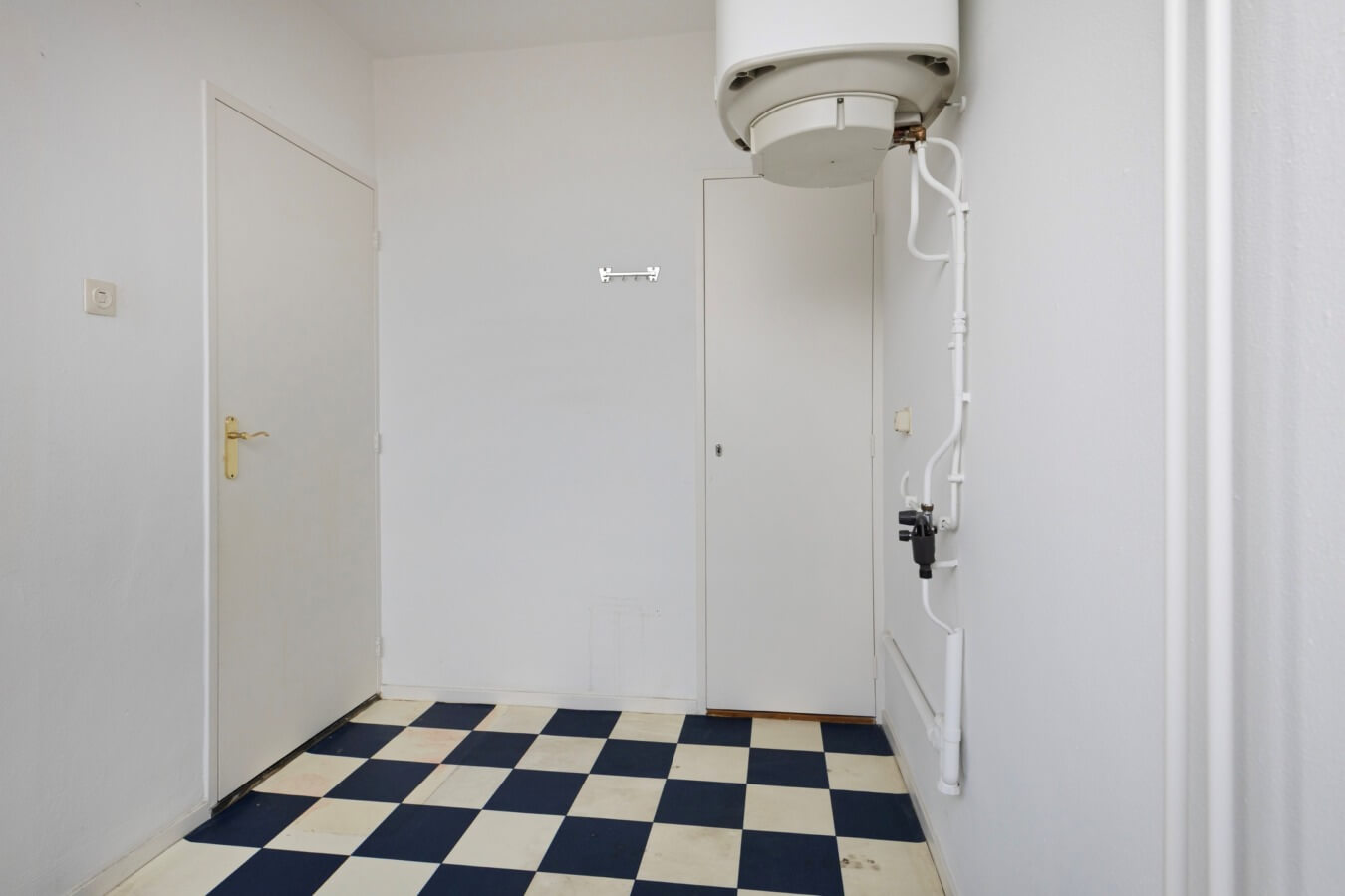Wanneer je de voordeur van de woning opent, kom je terecht in de hal. De hal biedt toegang tot de toiletruimte met fonteintje, maar ook tot de gesloten keuken, de woonkamer en de bijkeuken met de geiser en een inbouwkast die de woning rijk is.