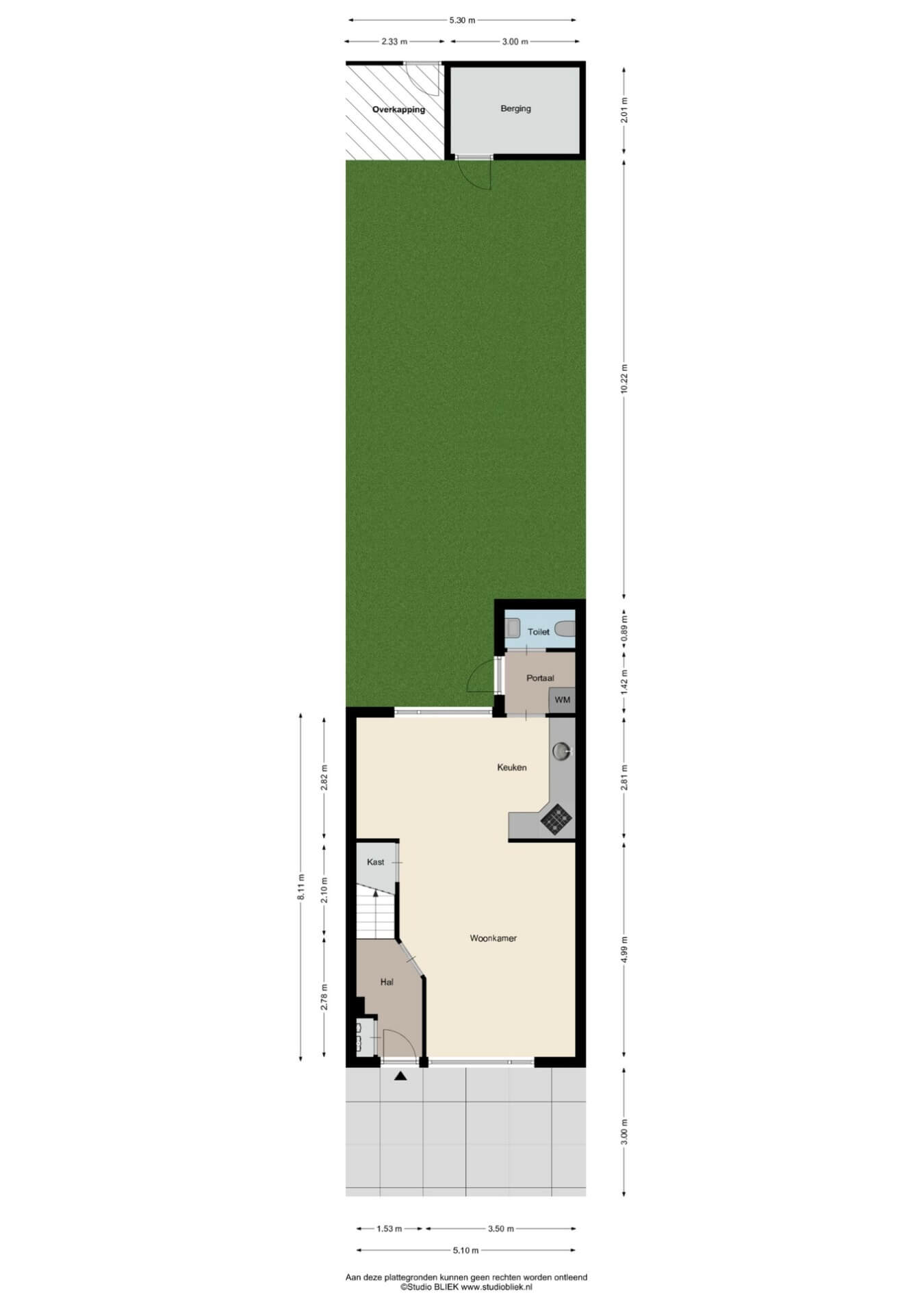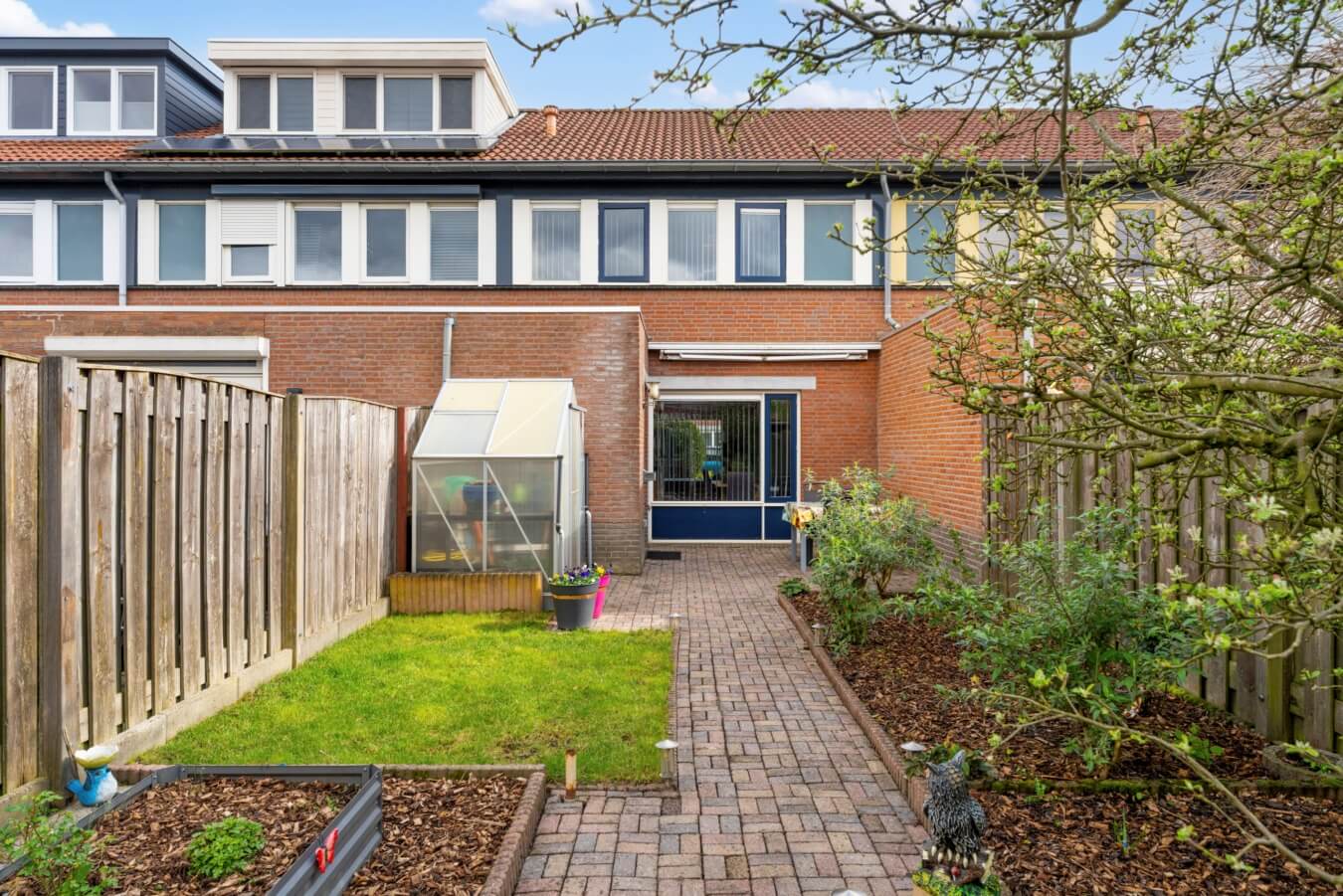 – Een diepe tuin met kas, fruitbomen, berging en achterom.