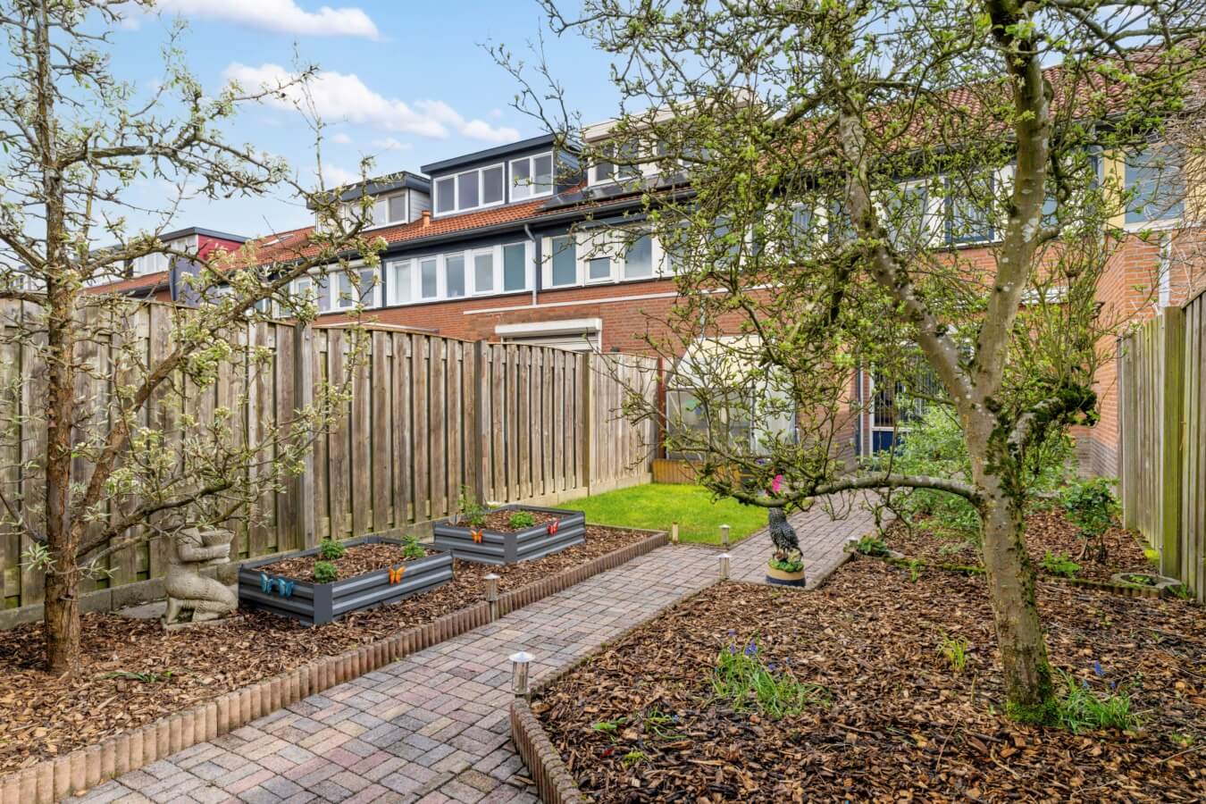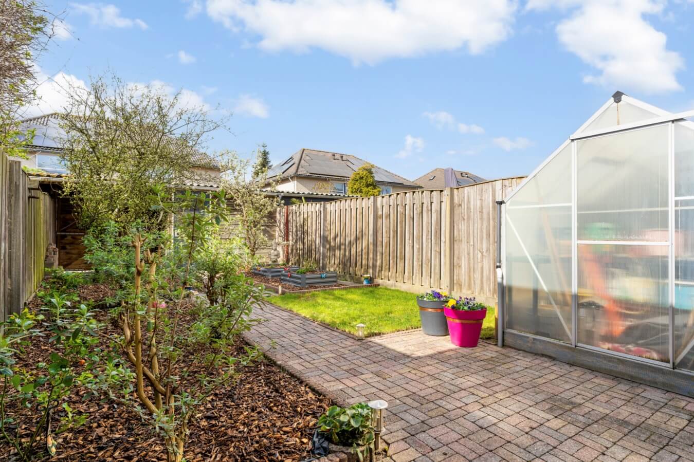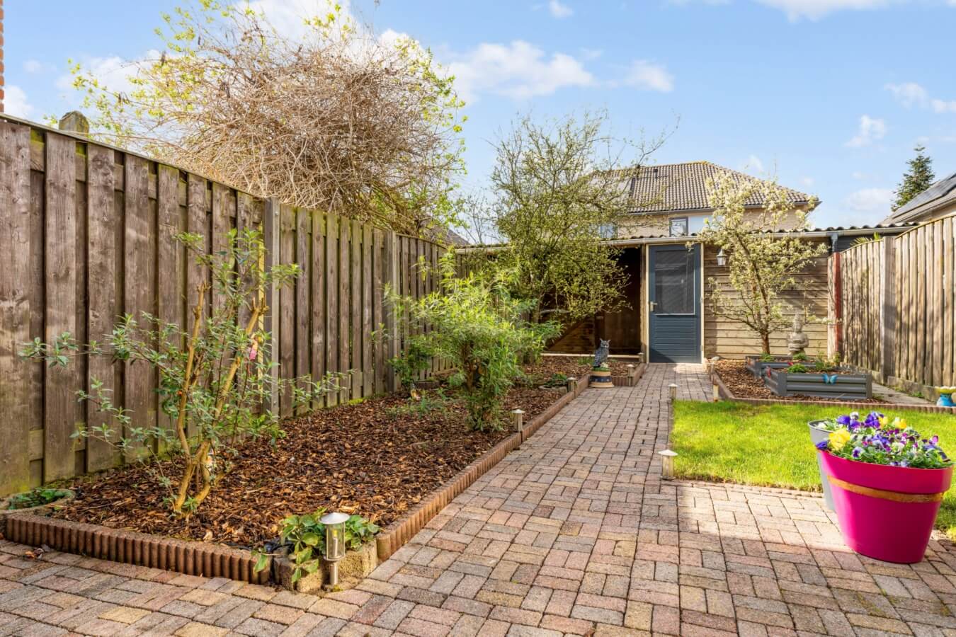 De achtertuin is een echte verrassing, met haar diepte en meerdere plekjes in de zon.