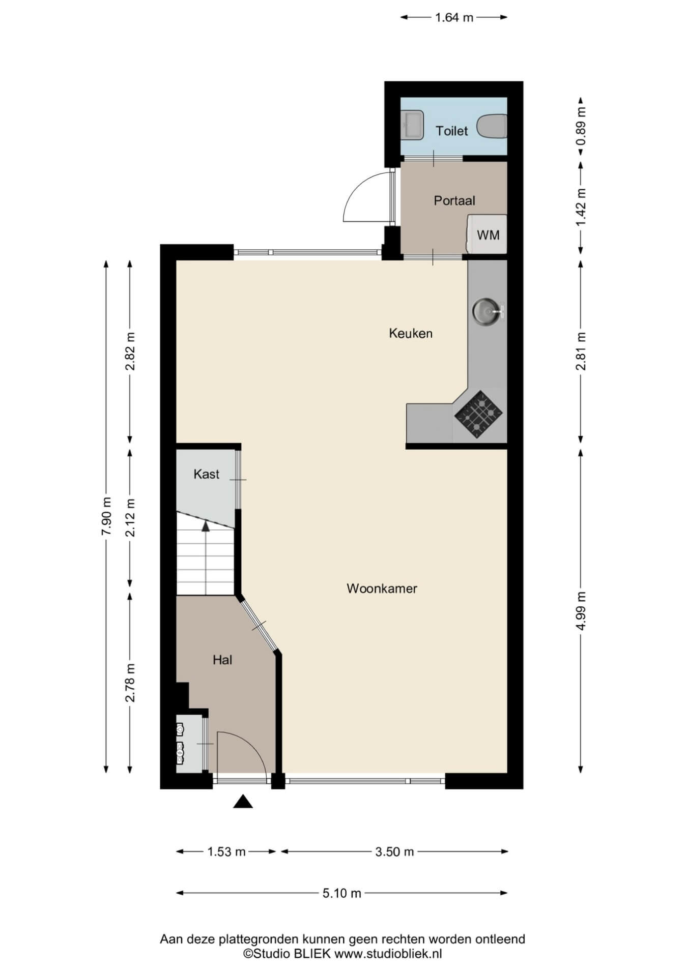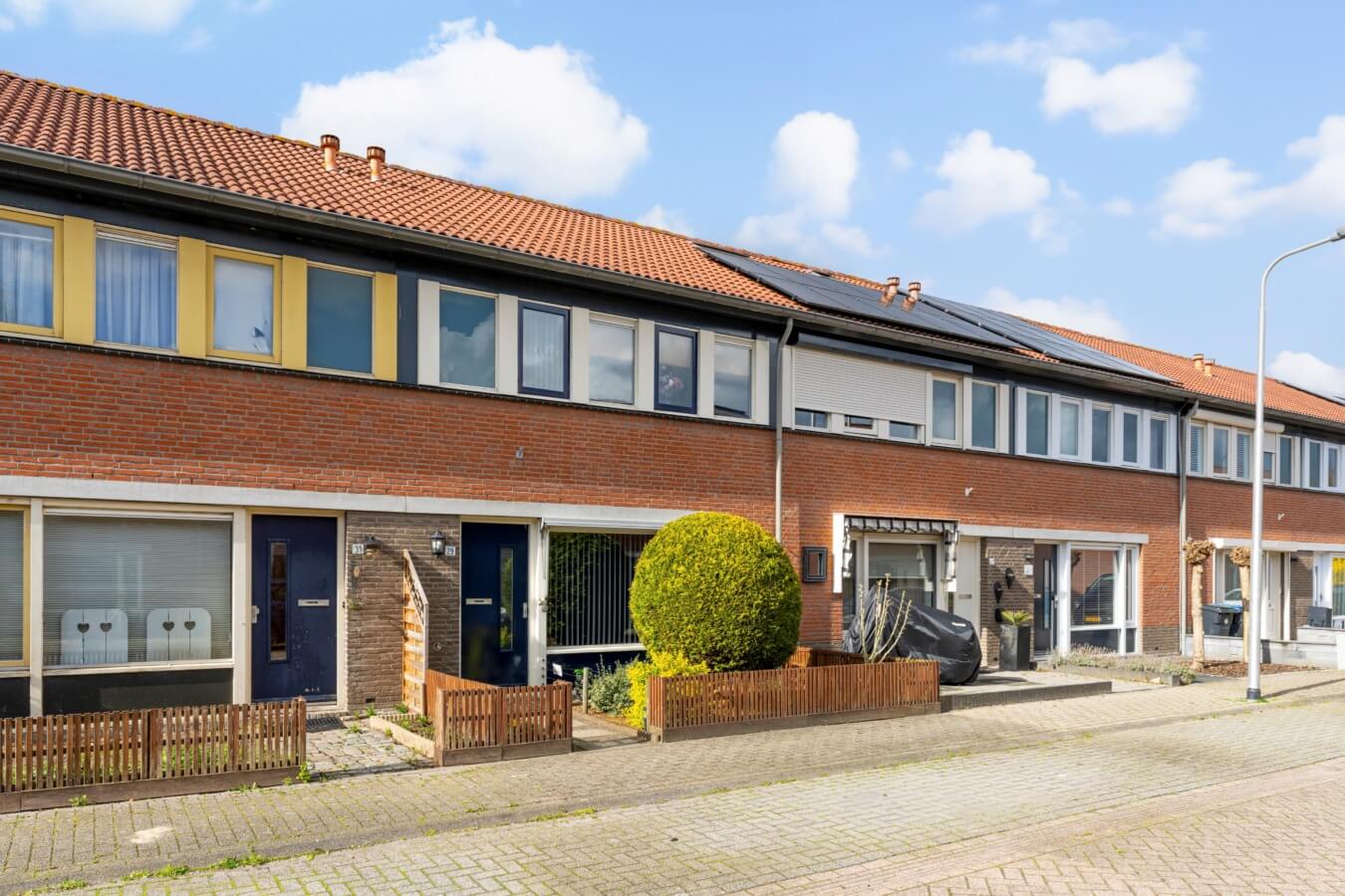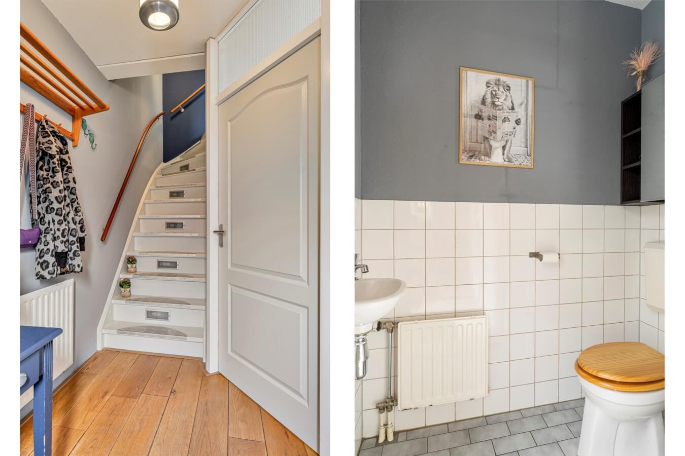 Via de netjes aangelegde voortuin loop je naar de voordeur van de woning. Vervolgens stap je binnen in de hal, waar je de meterkast, de trapopgang en de deur naar de woonkamer zal ontdekken.