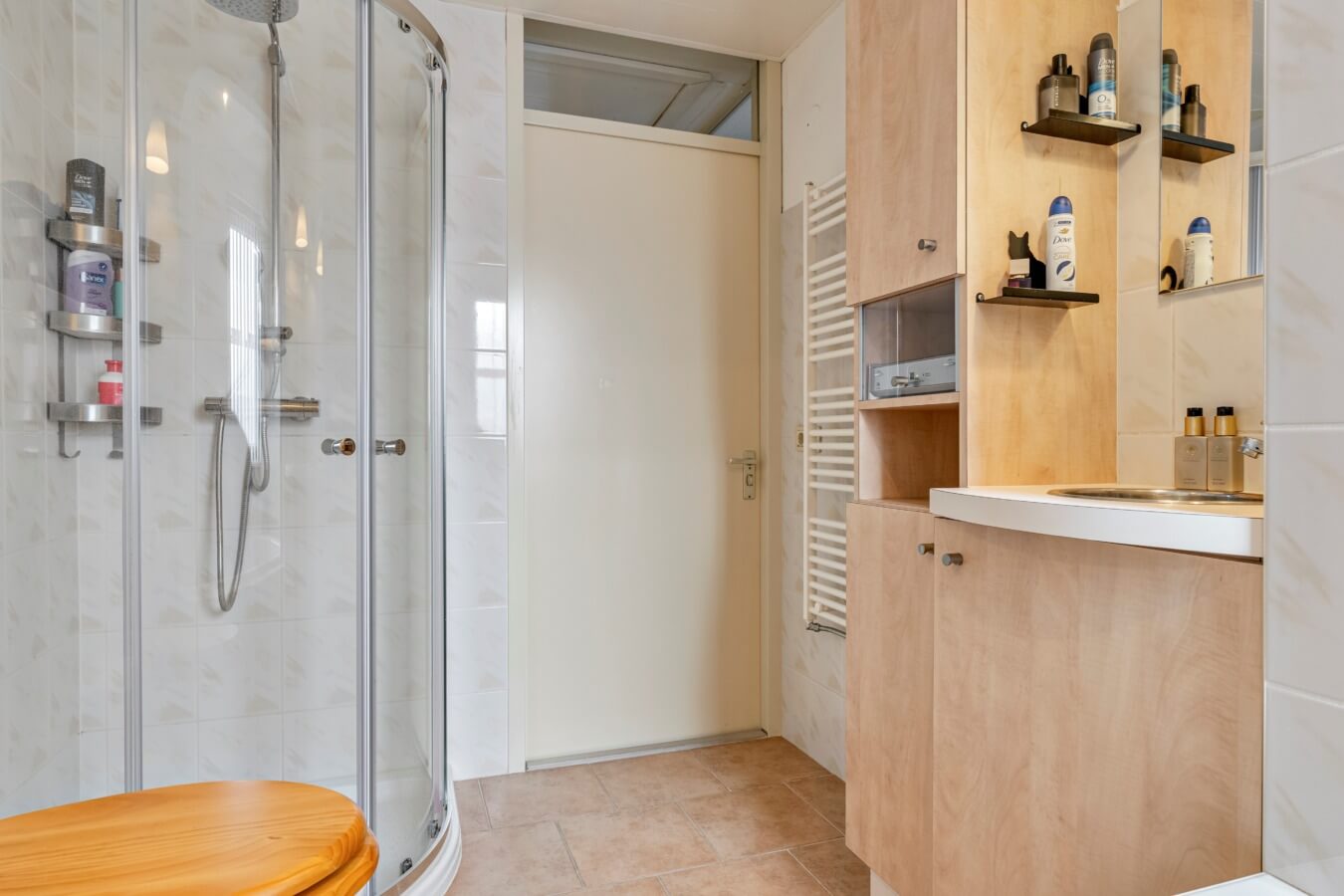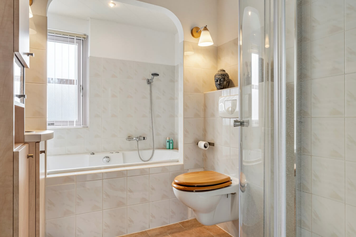De badkamer, die voorzien is van een ligbad, douchecabine, een wastafelmeubel en een toilet, is dus de laatste in het rijtje op deze verdieping. Ook hier geldt: functioneel en keurig, met mogelijkheden om het naar eigen wens te stylen.