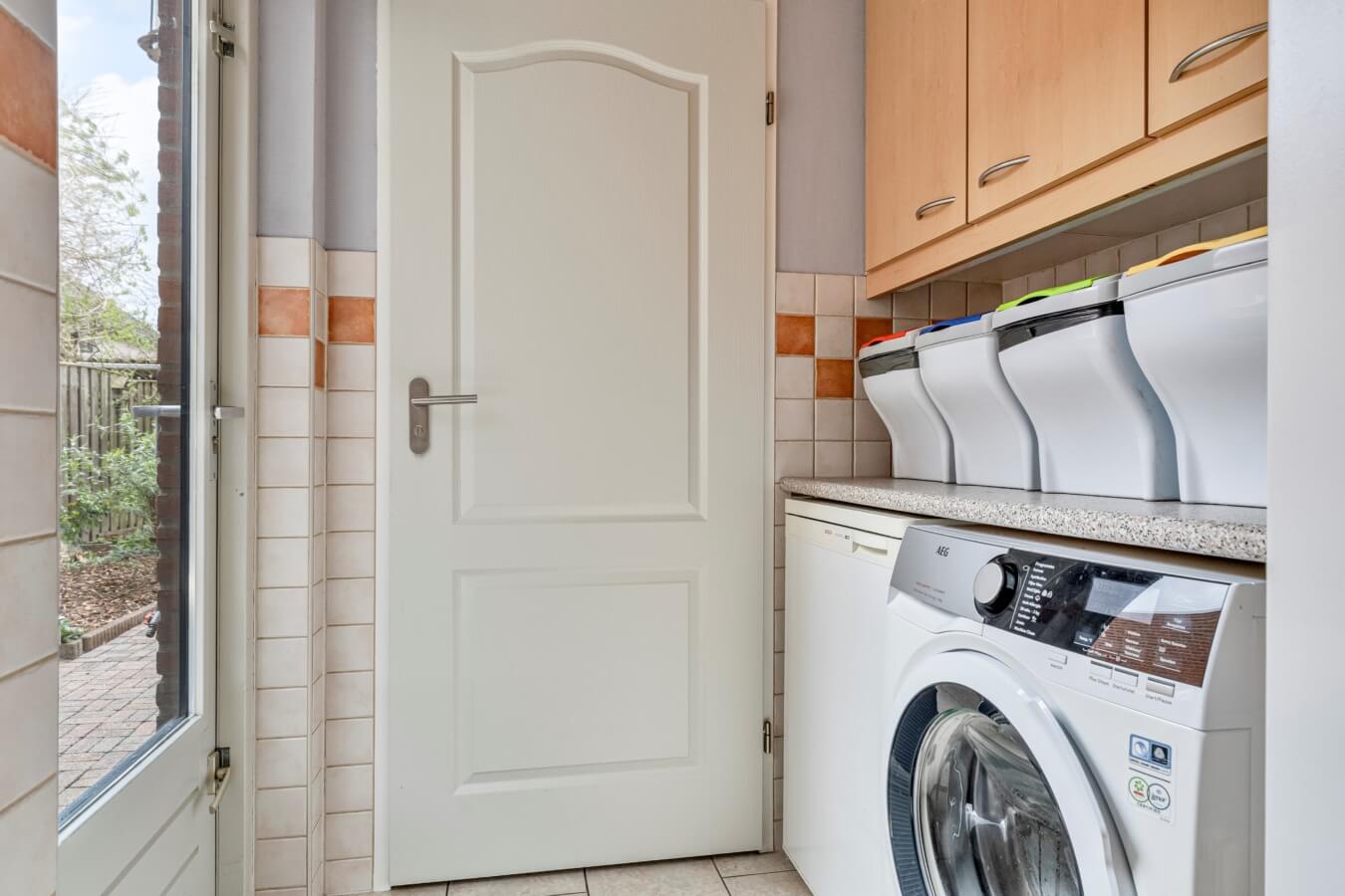 Je vindt in de keuken tevens de deur naar de bijkeuken met de aansluitingen voor wasapparatuur, toegang tot de toiletruimte met fonteintje en toegang tot de tuin.
