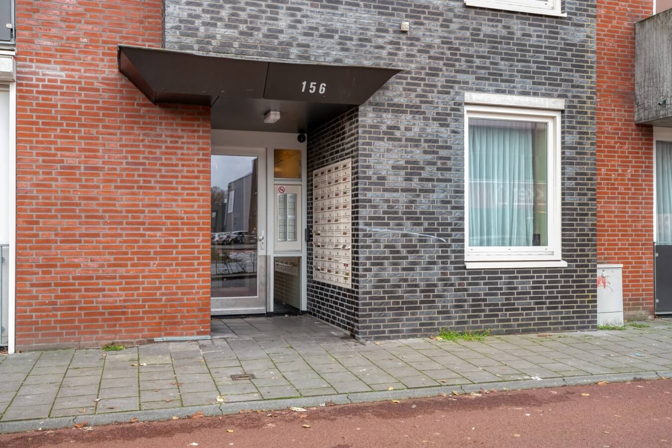 Centrale ingang van het complex ‘De Ring’ aan de Ringbaan-Noord met brievenbussen en bellentableau, lift en trapopgang naar de bovenverdiepingen, toegang tot het binnenterrein met de gezamenlijke fietsenstalling en containerruimte.