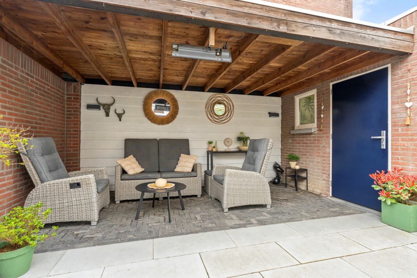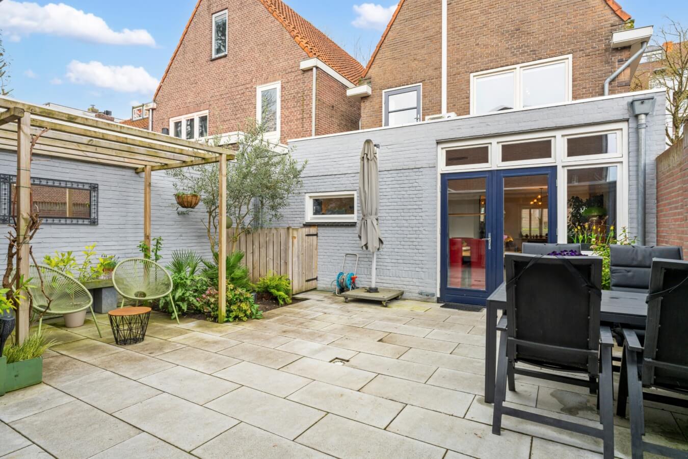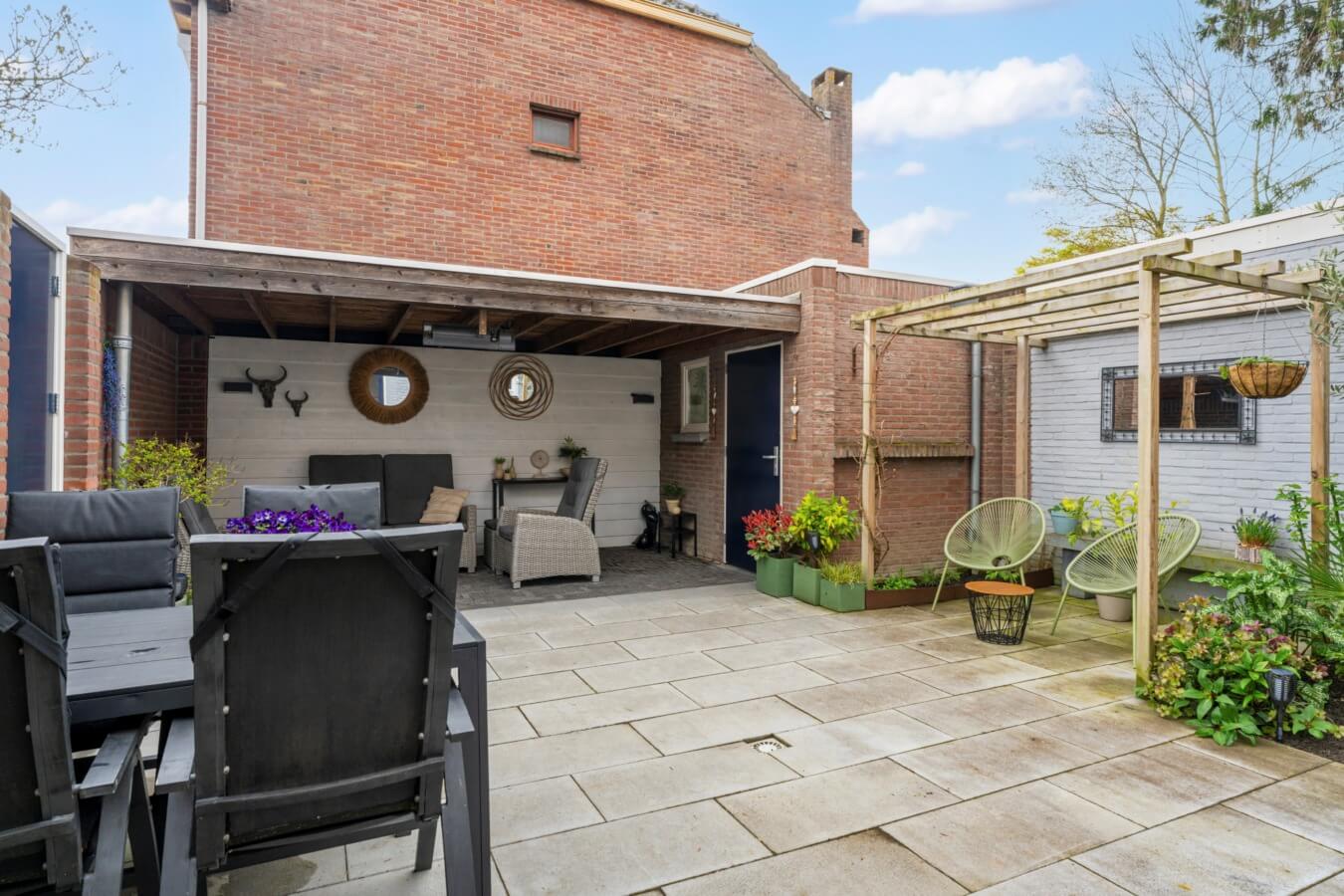 Sfeervolle aangelegde achtertuin, gelegen op het oosten, biedt volop privacy en ruimte. Met circa 10 meter diepte en 7 meter breedte is het een heerlijke plek om te ontspannen. De tuin beschikt over een stenen berging met elektra, een sfeervolle overkapping en een praktische achterom.