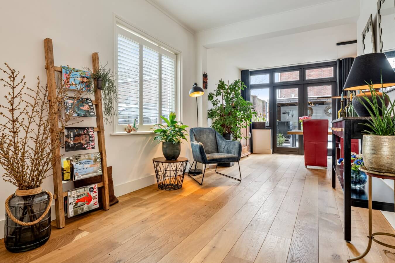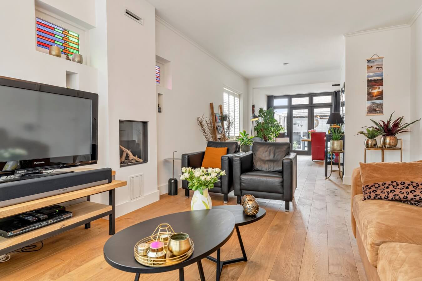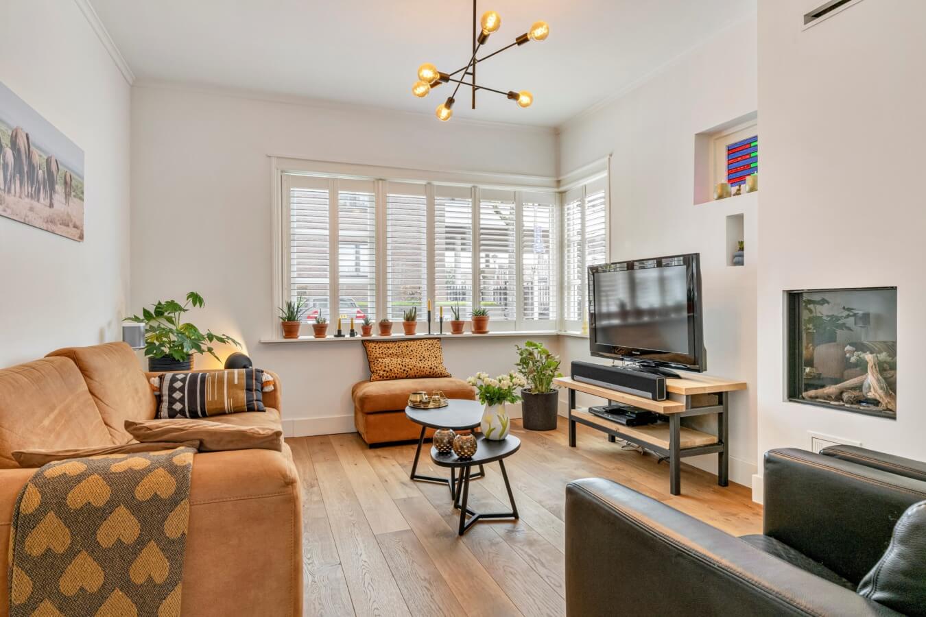 De uitgebouwde woonkamer is een heerlijke leefruimte met grote raampartijen en openslaande tuindeuren. De prachtige eiken houten vloer, glas-in-loodramen, shutters en de sfeervolle gashaard creëren samen een warme en stijlvolle ambiance.