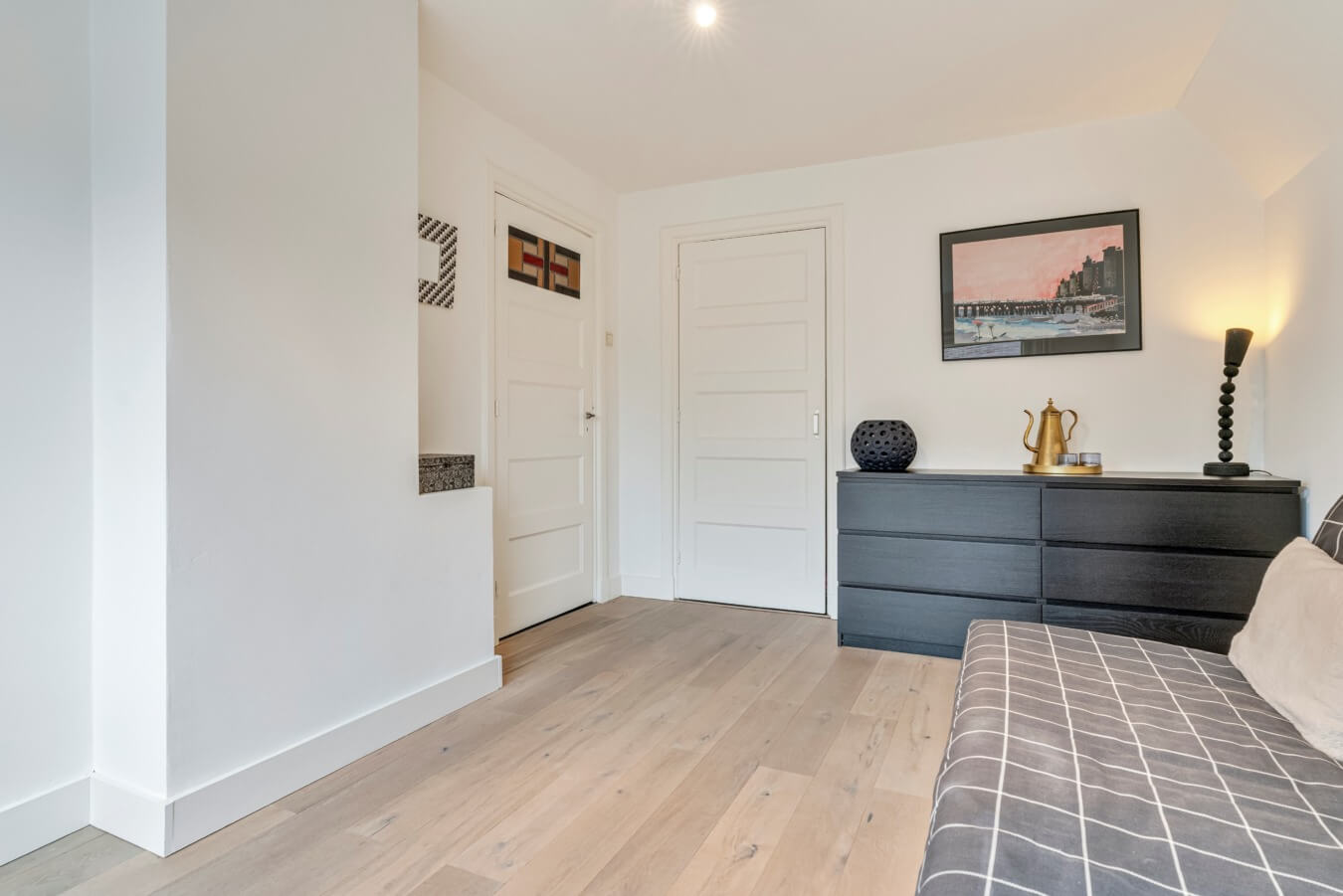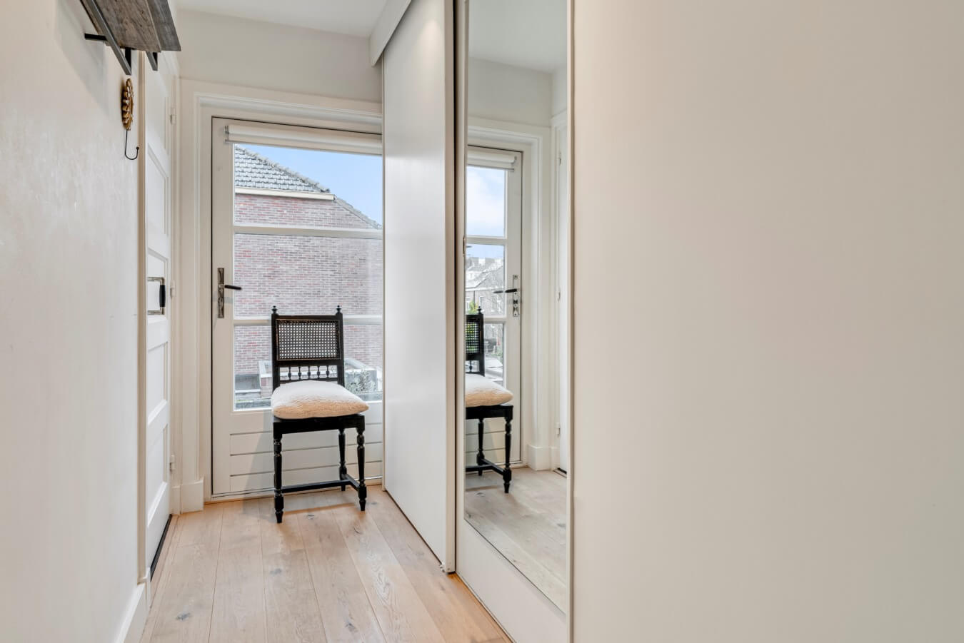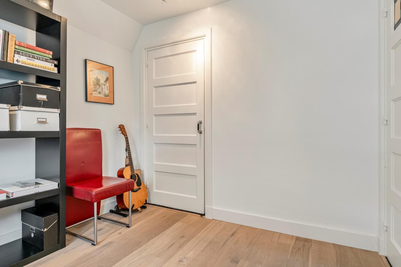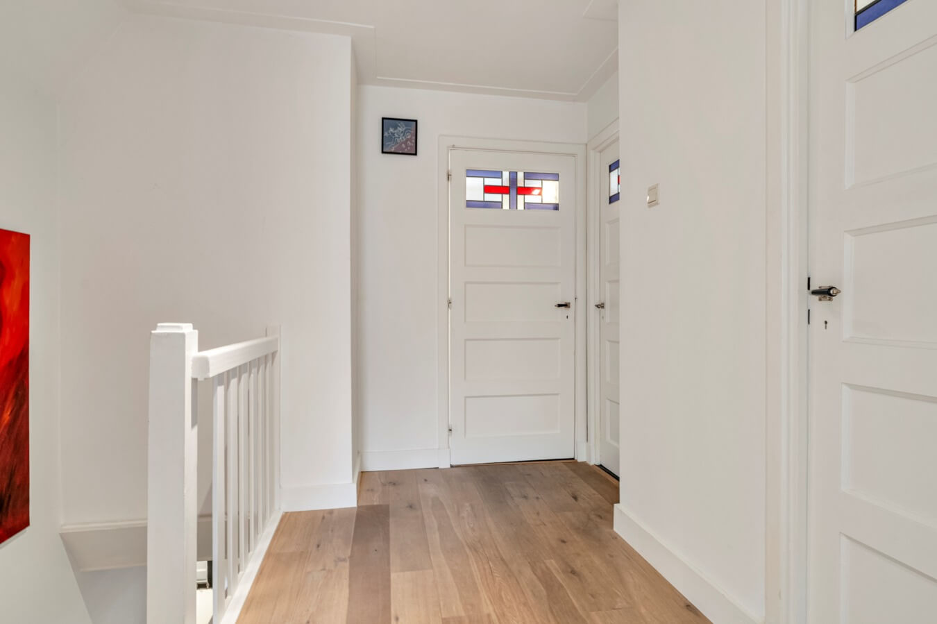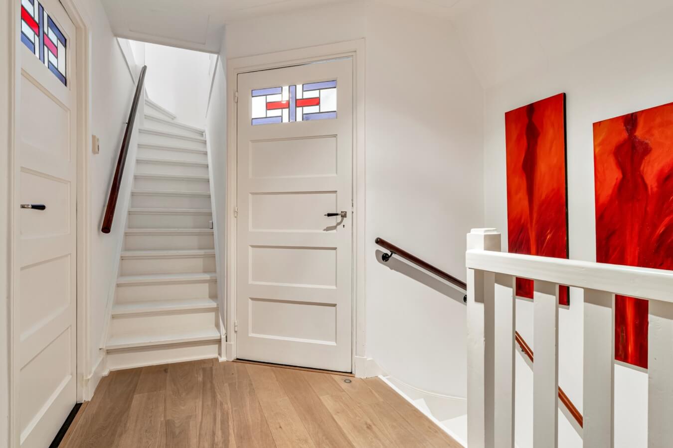 De overloop biedt toegang tot drie sfeervolle slaapkamers, elk voorzien van vaste kasten en afgewerkt met een fraaie eiken lamelparketvloer. De karakteristieke paneeldeuren met glas-in-loodramen zorgen voor een authentieke en warme uitstraling.
