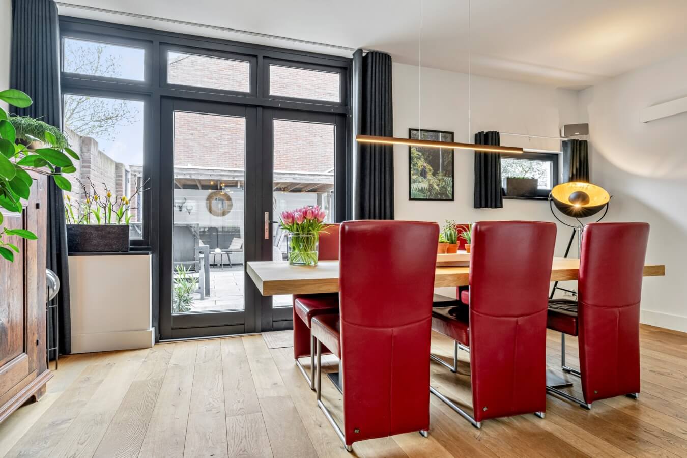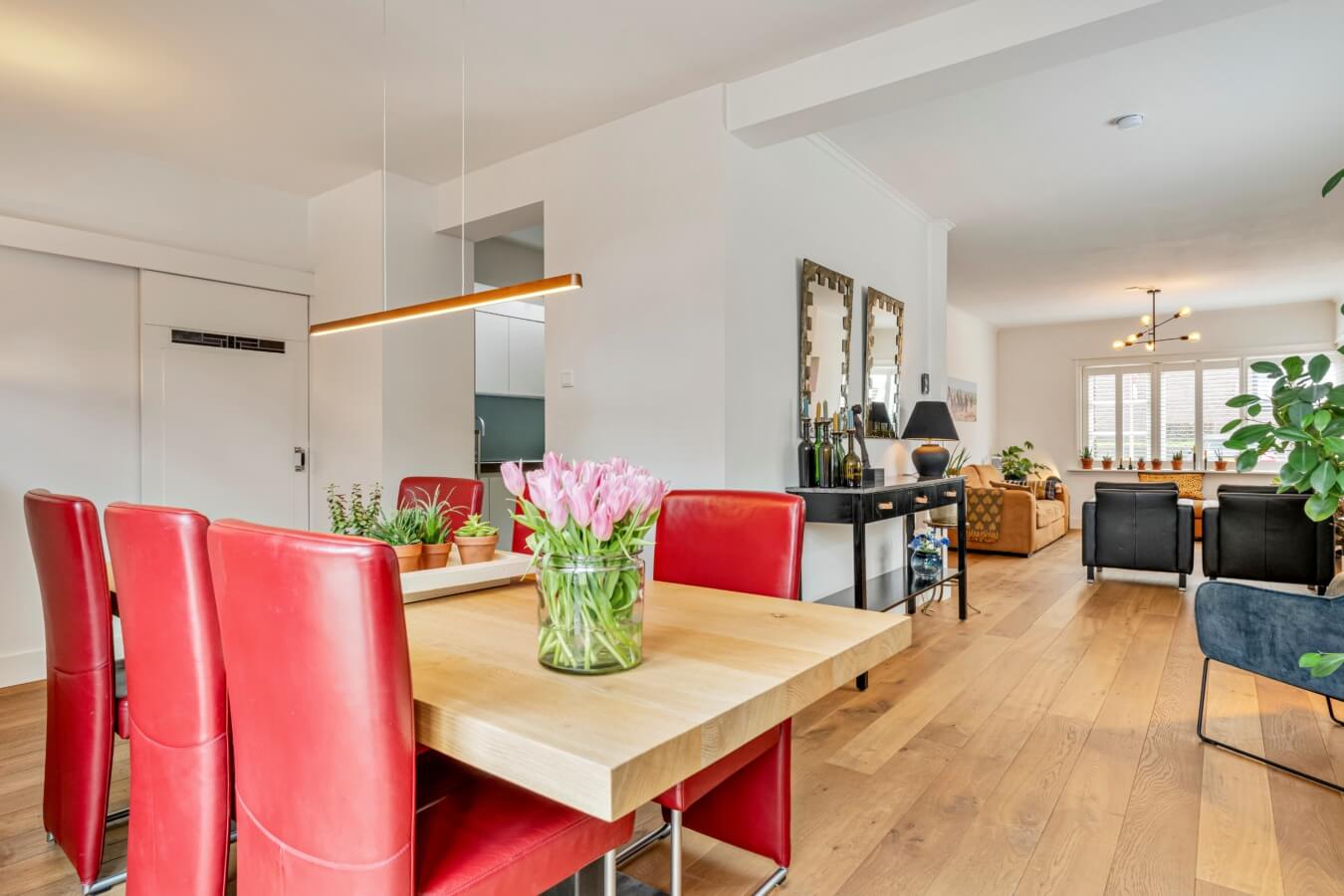 De aanbouw vormt een prachtige verlenging van de leefruimte en is op een natuurlijke wijze verbonden met zowel de oorspronkelijke woonkamer als de keuken. Deze lichte en sfeervolle ruimte wordt momenteel gebruikt als eetkamer en voelt als het kloppend hart van het huis – een plek waar koken, tafelen en samenzijn moeiteloos in elkaar overlopen. Dankzij de open verbinding en de prettige lichtinval ontstaat hier een ruimtelijk en harmonieus geheel, perfect voor lange diners en gezellige momenten met familie en vrienden.
