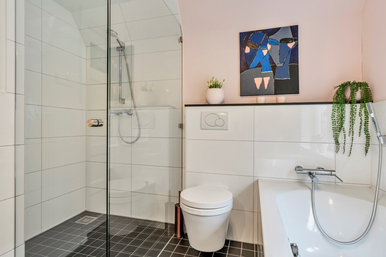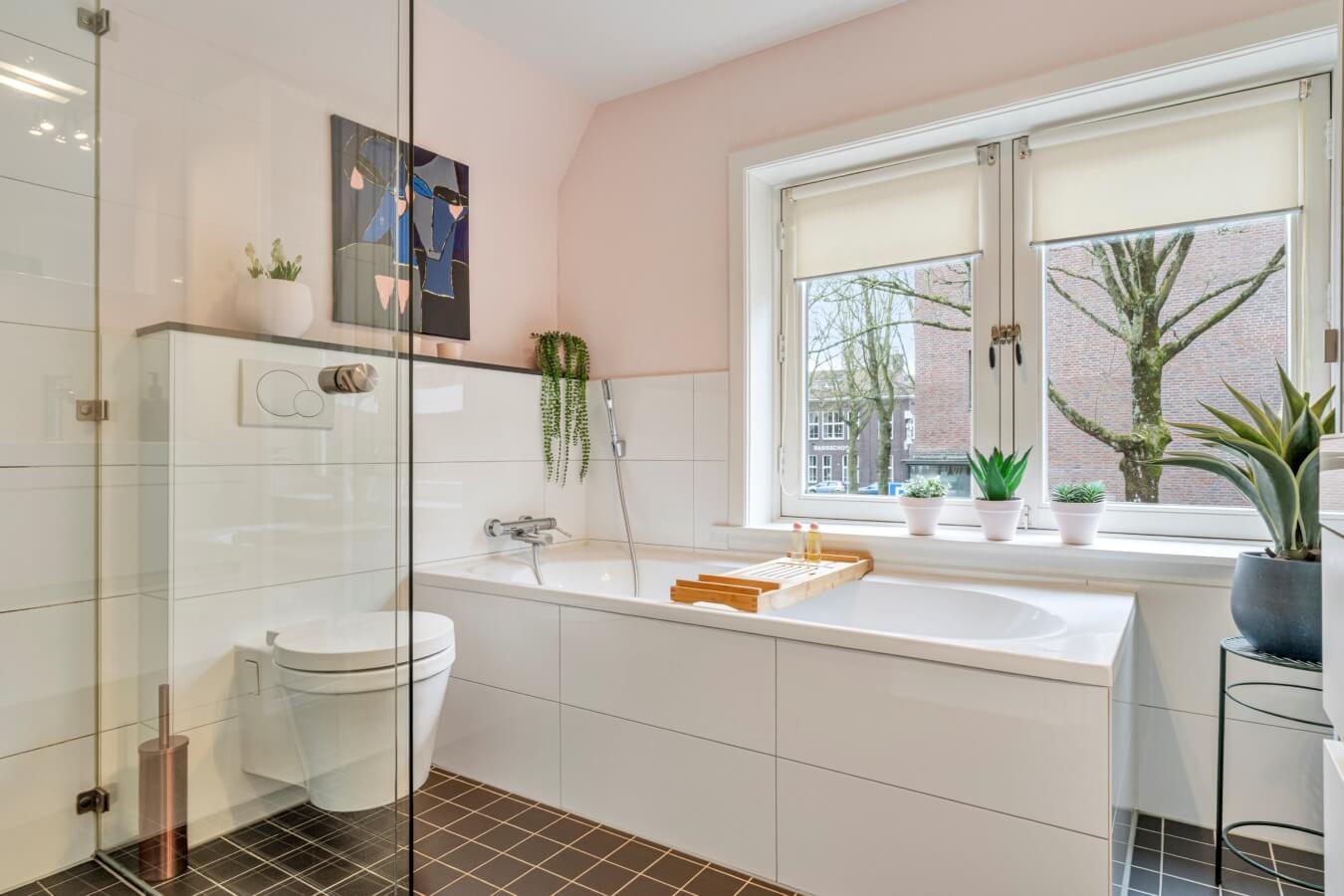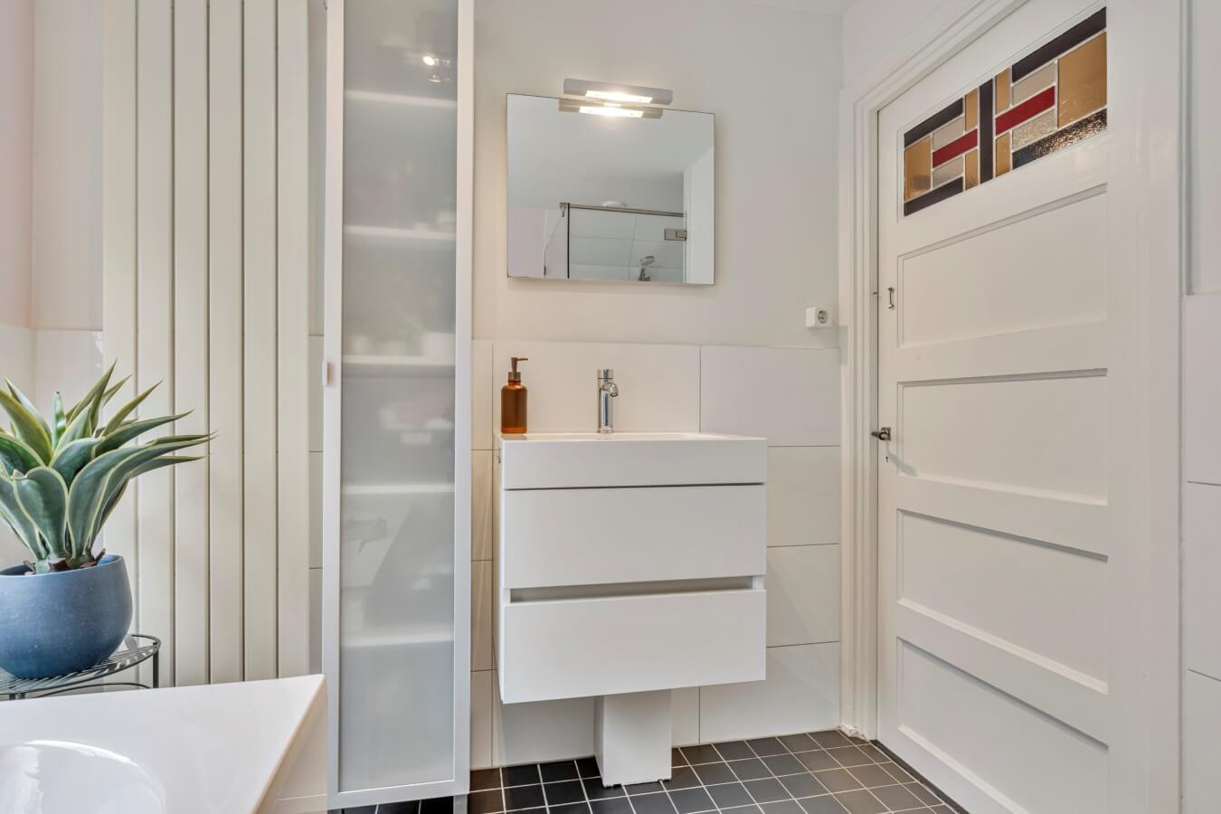De moderne badkamer is compleet uitgevoerd met een ligbad, inloopdouche, wastafelmeubel, hangcloset en designradiator.