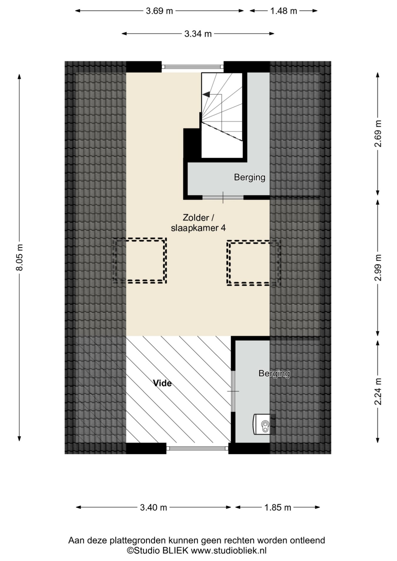Dankzij de twee grote Velux dakramen is het een aangenaam lichte ruimte. De aanwezige airconditioning zorgt hier bovendien voor extra comfort tijdens warme dagen. Er is voldoende bergruimte in de knieschotten en bergkasten, waar zich onder andere de Nefit HR CV-ketel (2007) bevindt, en er is nog een extra bergzolder aanwezig.